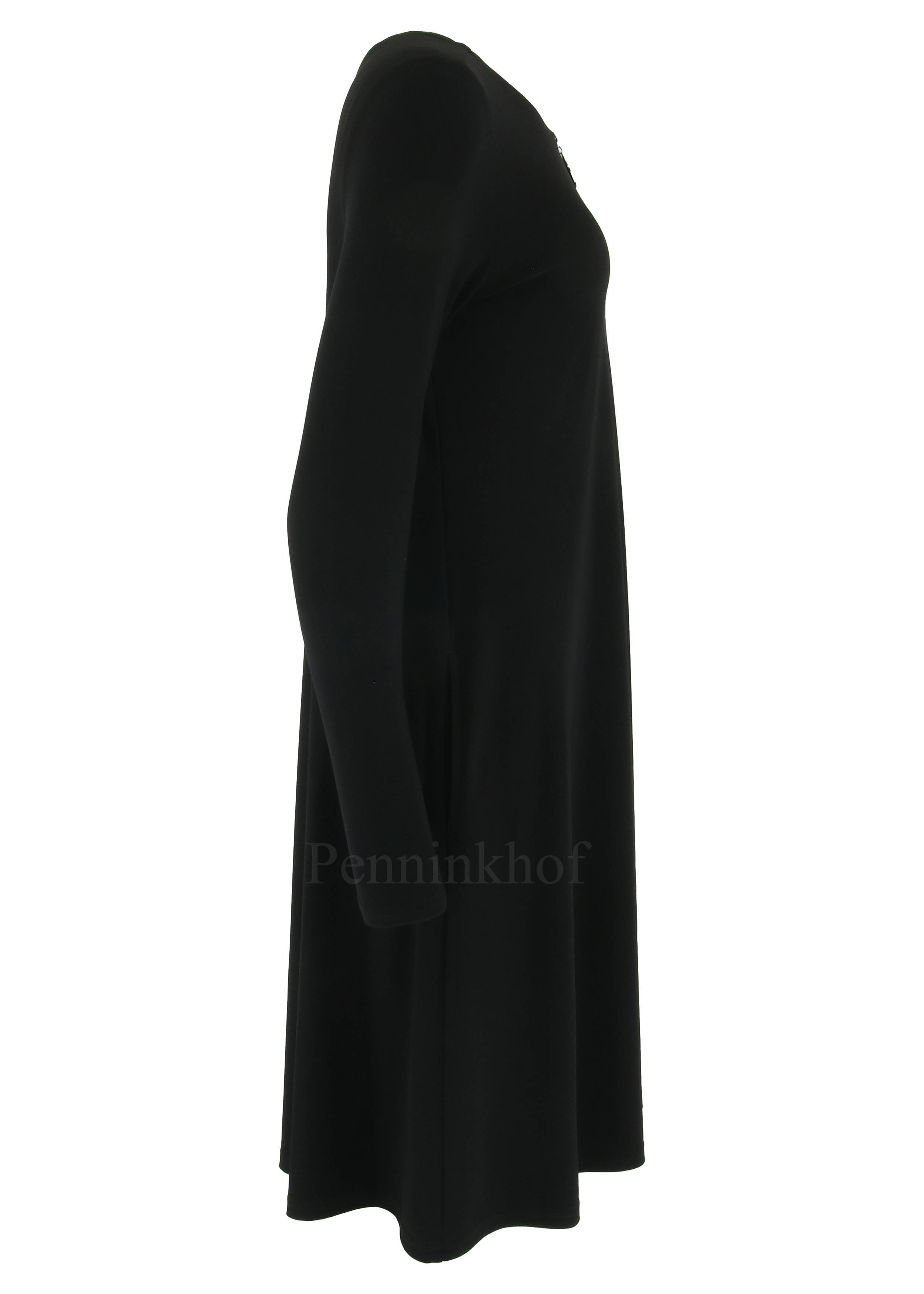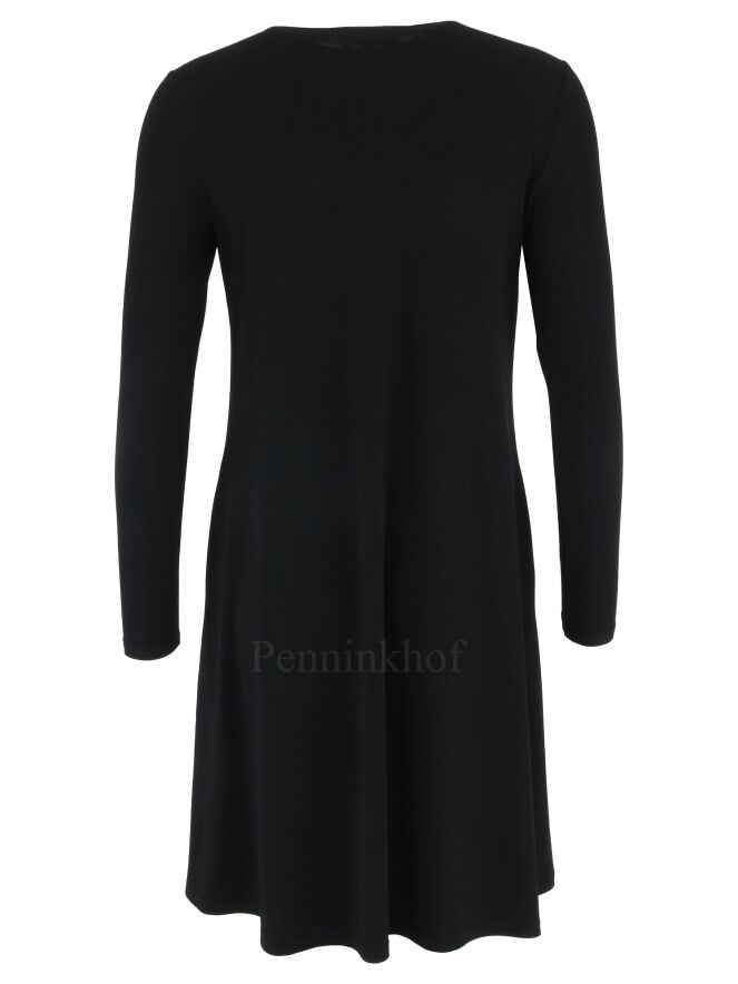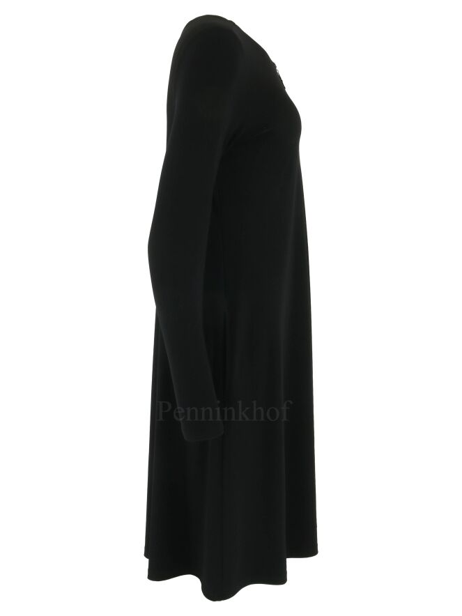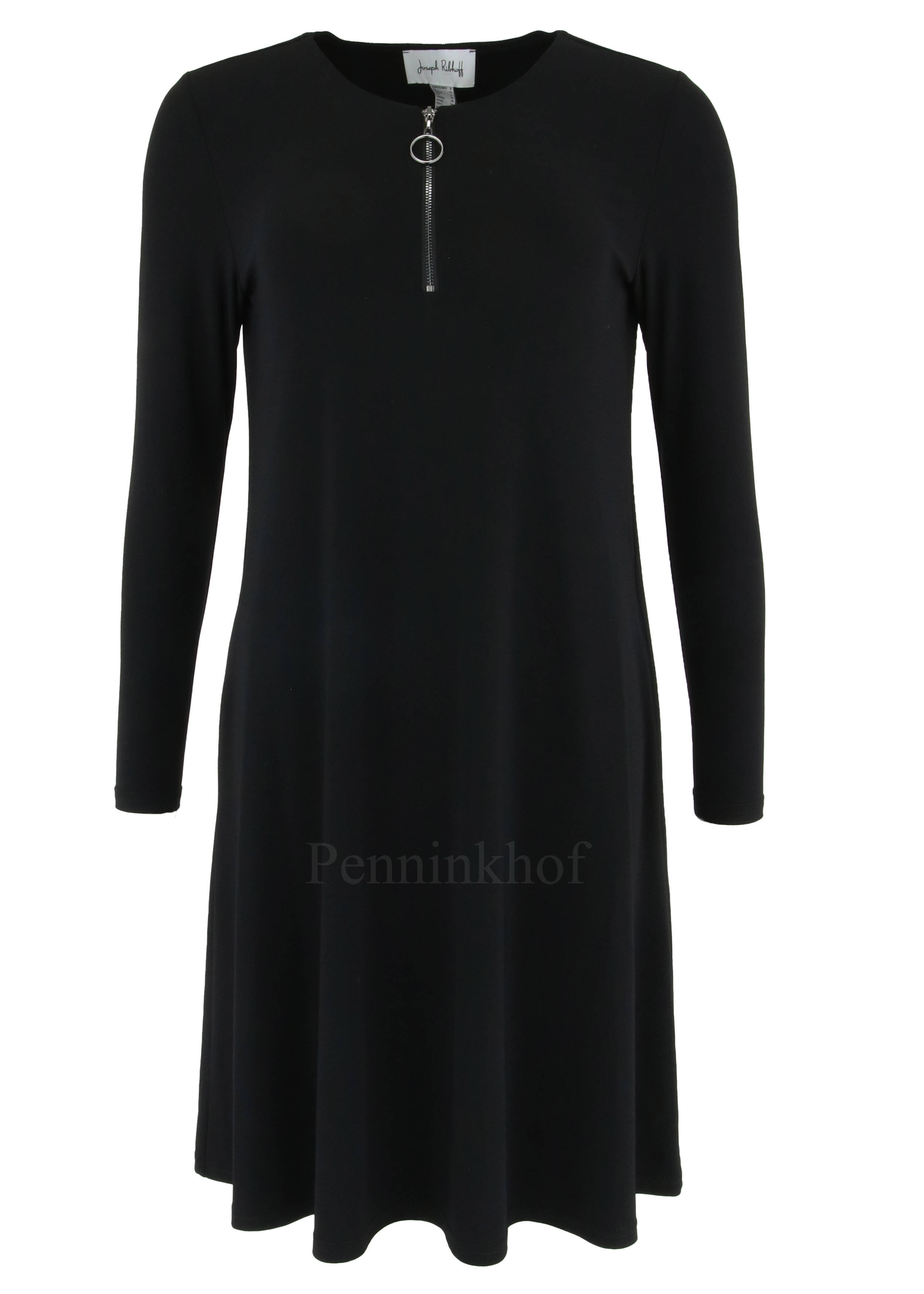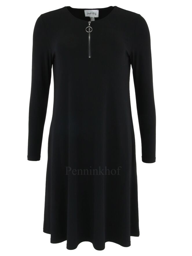 A dress by Joseph Ribkoff in the color black. In the middle of the round neck is a zipper to below the bust. The dress has a slight A-Line. this dress can be hand washed.