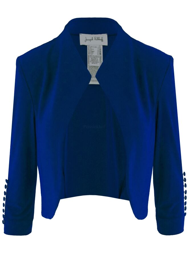 A bolero blazer from Joseph Ribkoff in cobalt blue. The three-quarter-length sleeves feature a row of eight finely satin-covered cuff buttons. This bolero should be hand-washed.
