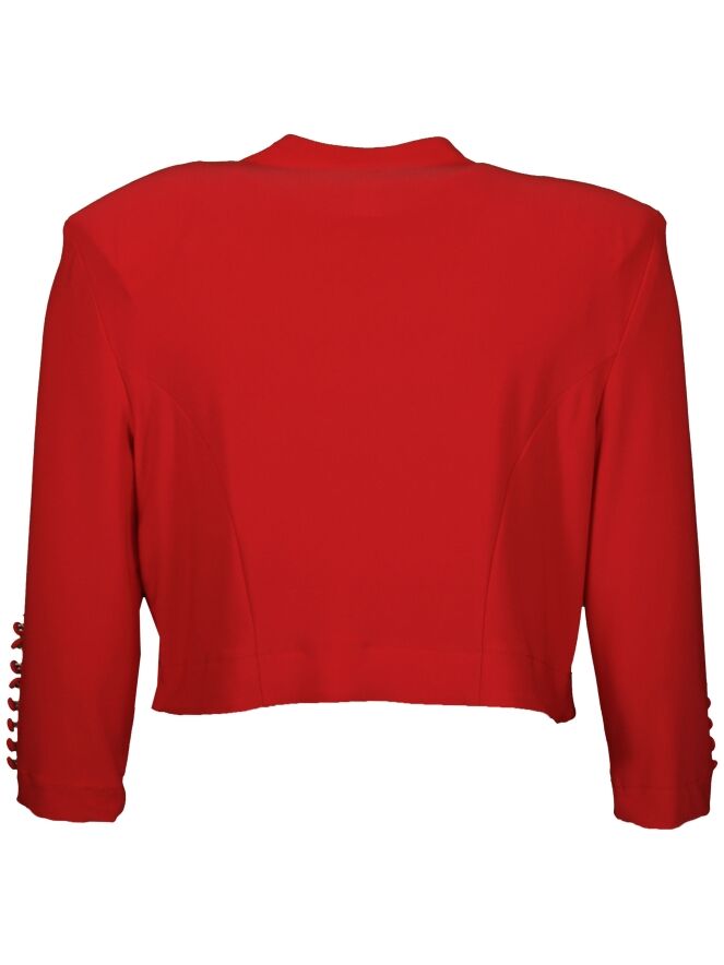 A bolero jacket from the brand Joseph Ribkoff in the color red. The half-length sleeves have a row of eight fine satin cuffs. This bolero can be washed by hand.