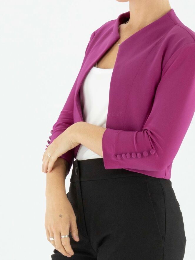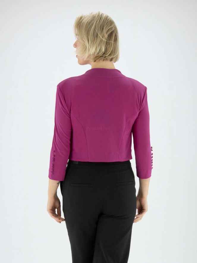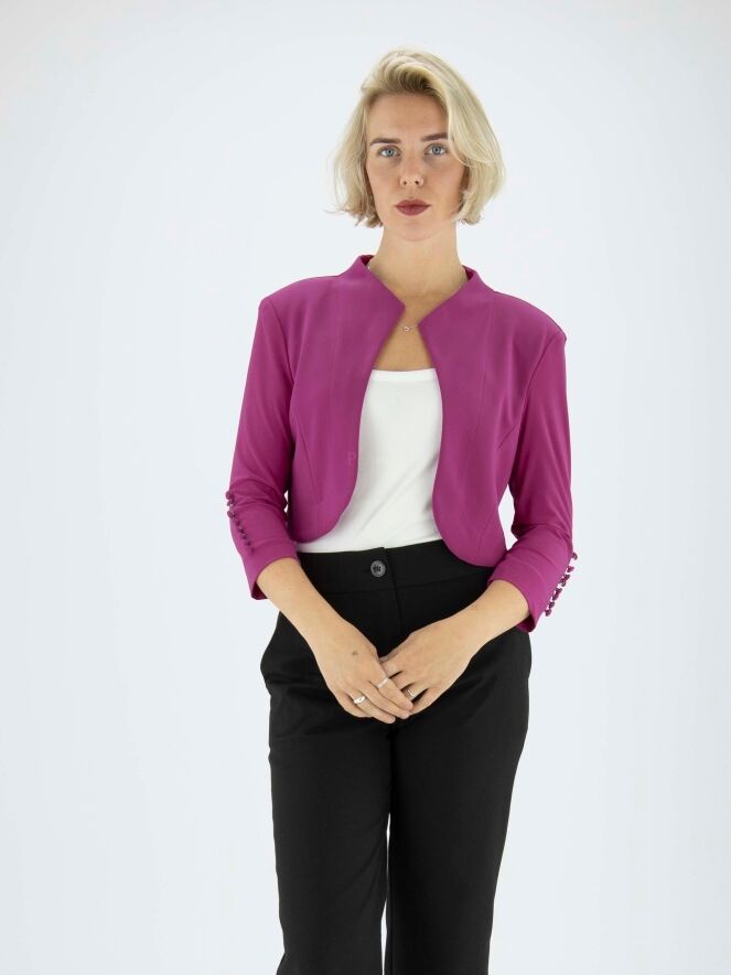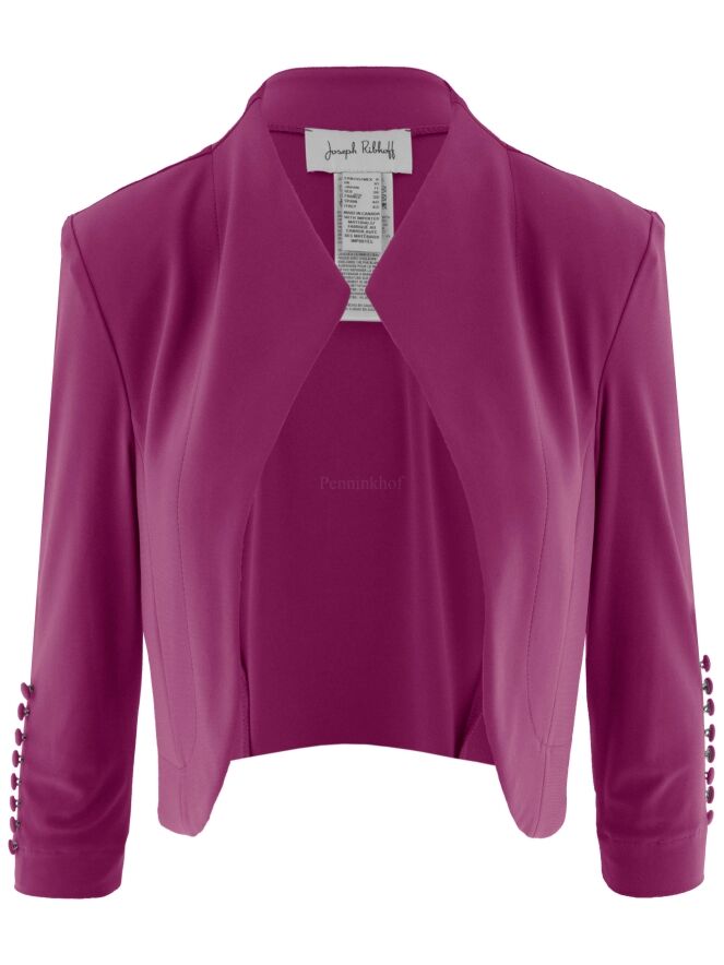 A bolero blazer from the brand Joseph Ribkoff in the colour fuchsia. The mid-length sleeves have a row of 8 fine satin cufflinks. This bolero may be hand washed.