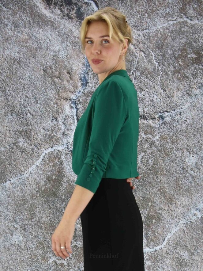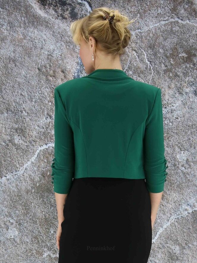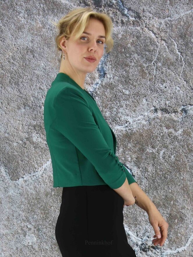A bolero blazer from the brand Joseph Ribkoff in the color green. The half-length sleeves have a row of 8 fine satin cufflinks. This bolero can be washed by hand.