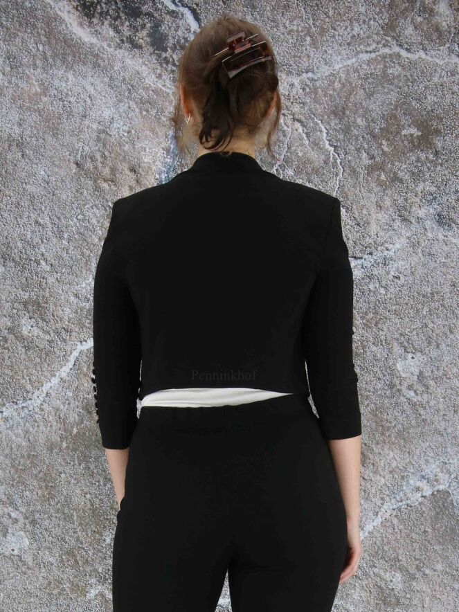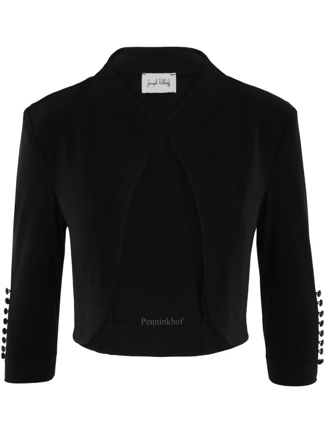 A bolero jacket from the brand Joseph Ribkoff in the color black. The half-length sleeves have a row of eight fine satin cuffs. This bolero can be washed by hand.