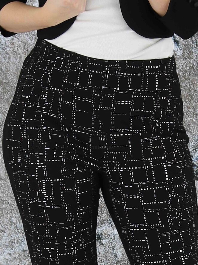 Een broek van Joseph Ribkoff in een grafische reliëf print met meerdere zilver grijze tinten op een zwarte achtergrond. In de taille is een elastieken band. Deze broek mag op de hand worden gewassen.