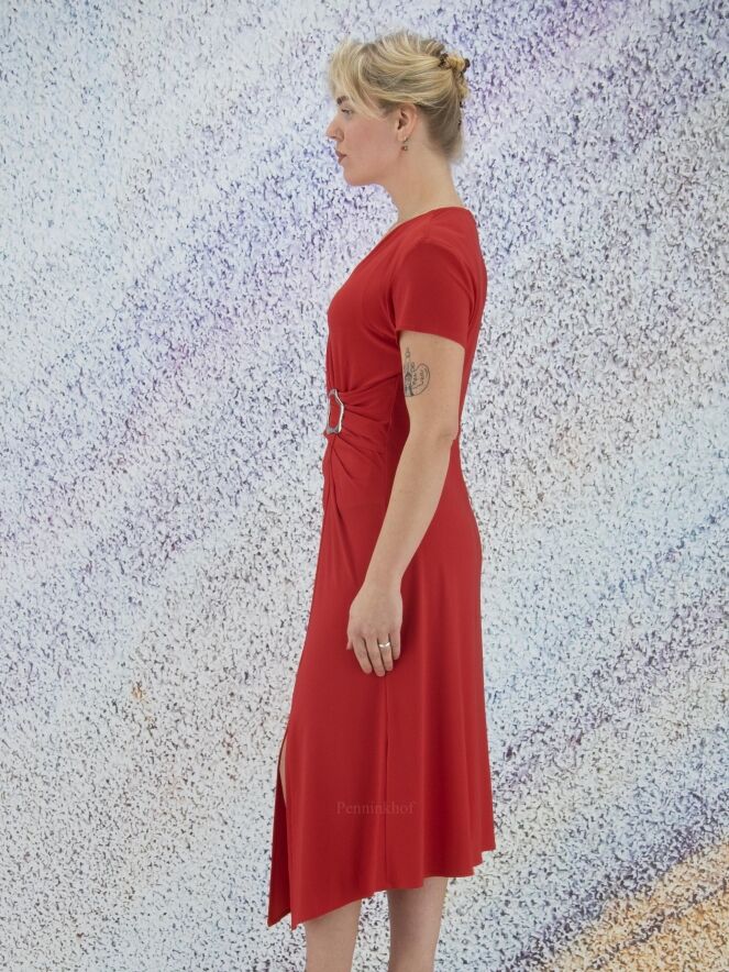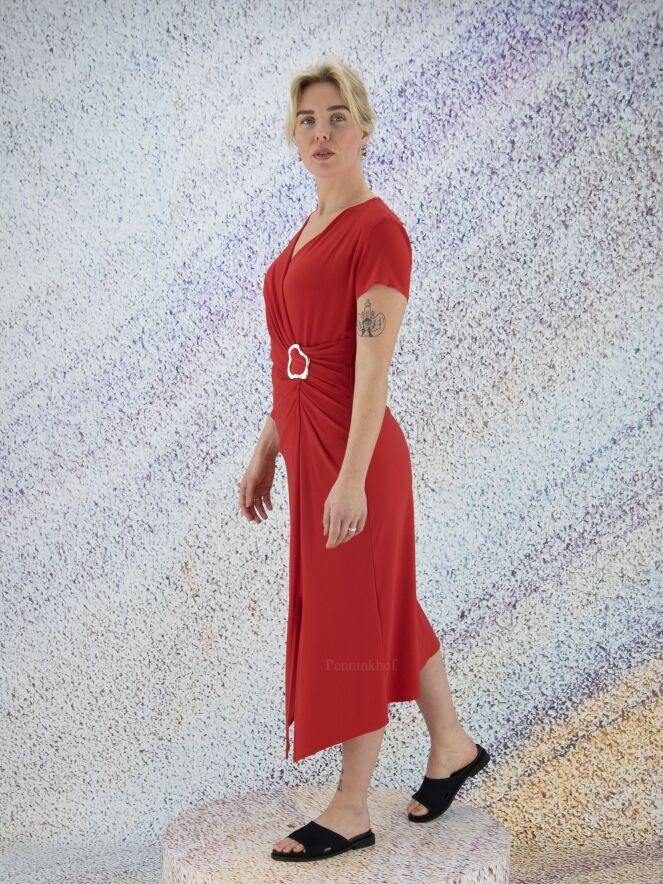 A dress by Joseph Ribkoff in the color red. From the V - Neckline, the dress has a drape effect to the decorative gold-colored buckle at the waist. This dress can be hand washed.