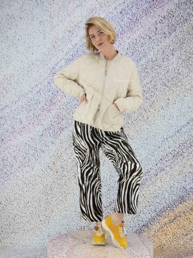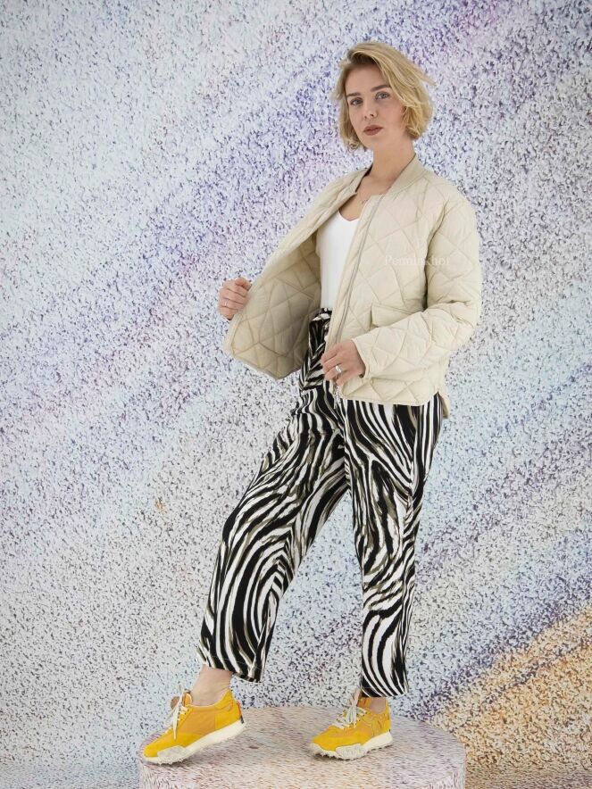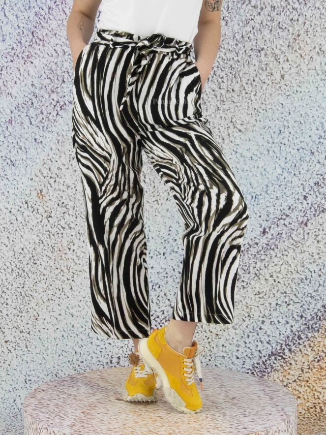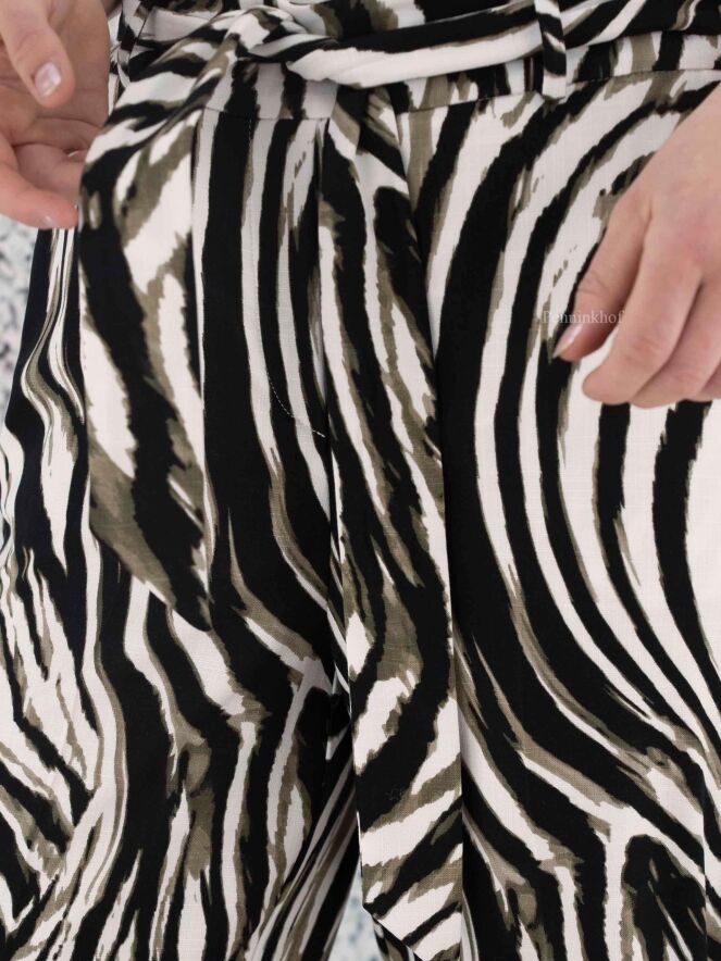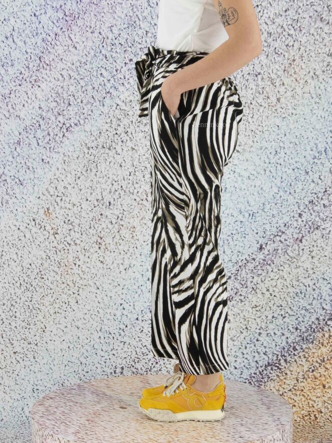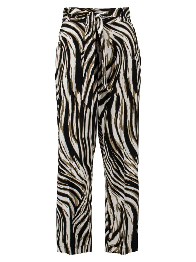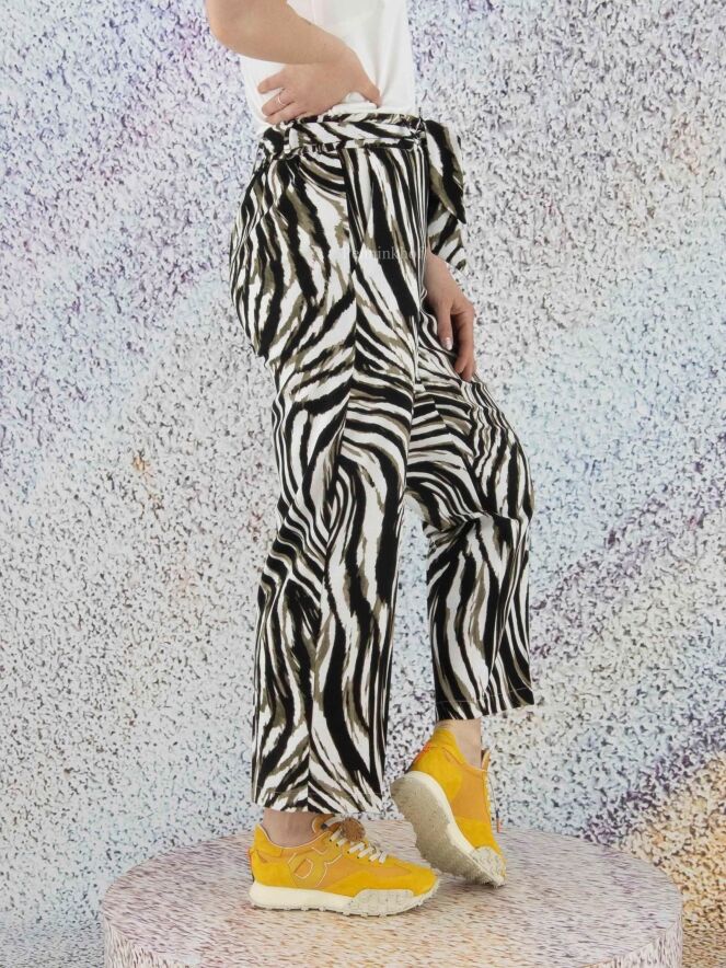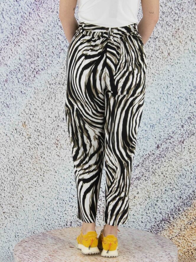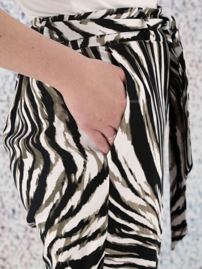 Pants by Joseph Ribkoff in a zebra print with the colors olive green, black and white. At the waist is a belt in the same fabric as the pants. The back of the waistband is in a finely pleated elastic fabric. These pants can be hand washed.