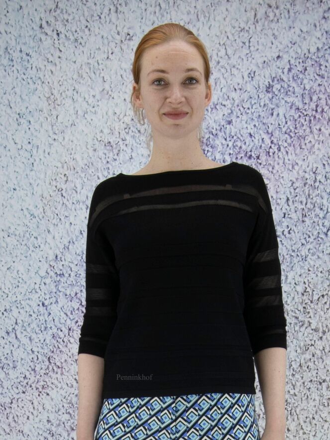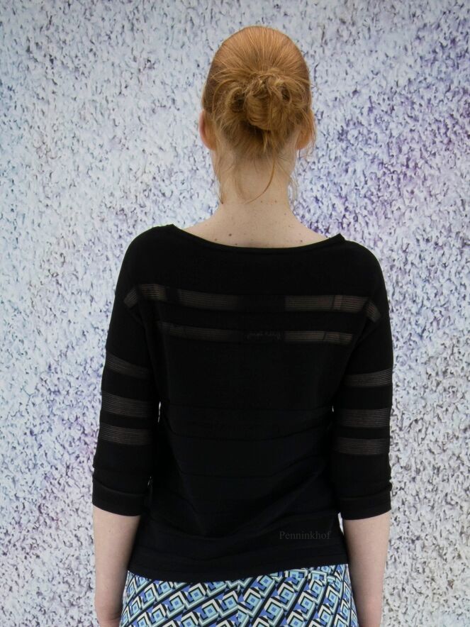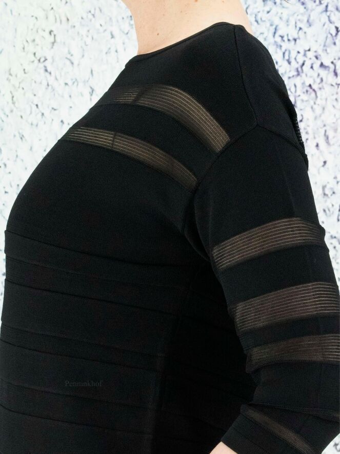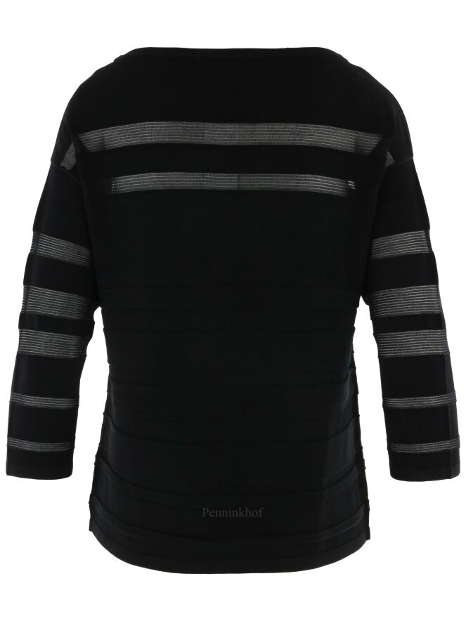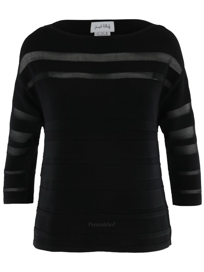 A pullover by Joseph Ribkoff in a partly transparent stripe structure in the color black. The pullover has a round neckline and half-length sleeves. This pullover can be washed by hand.