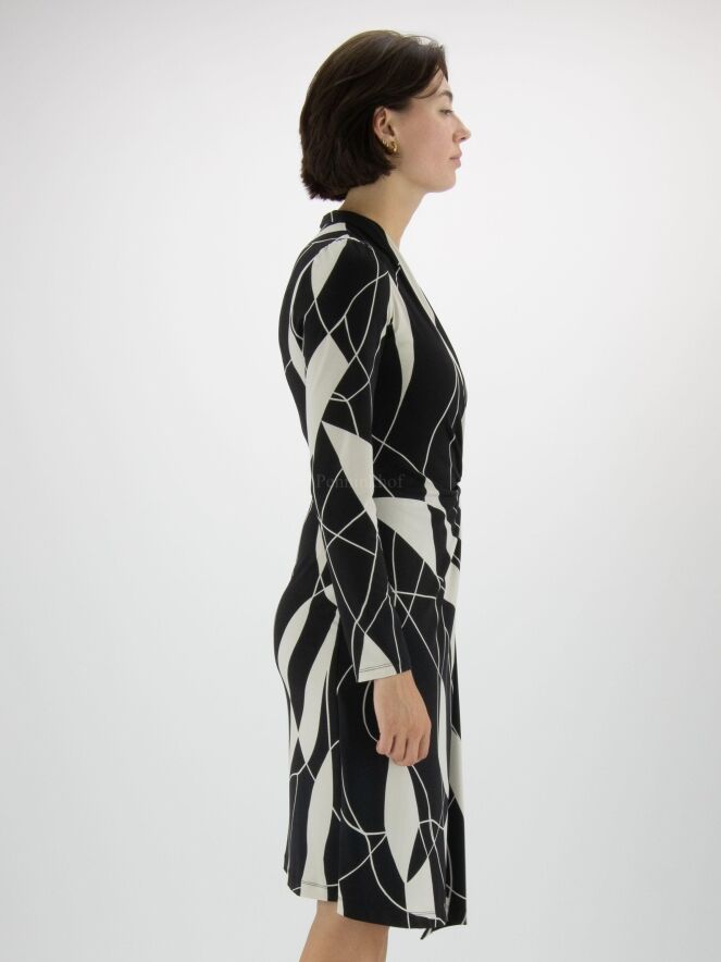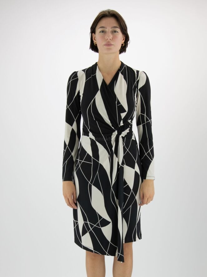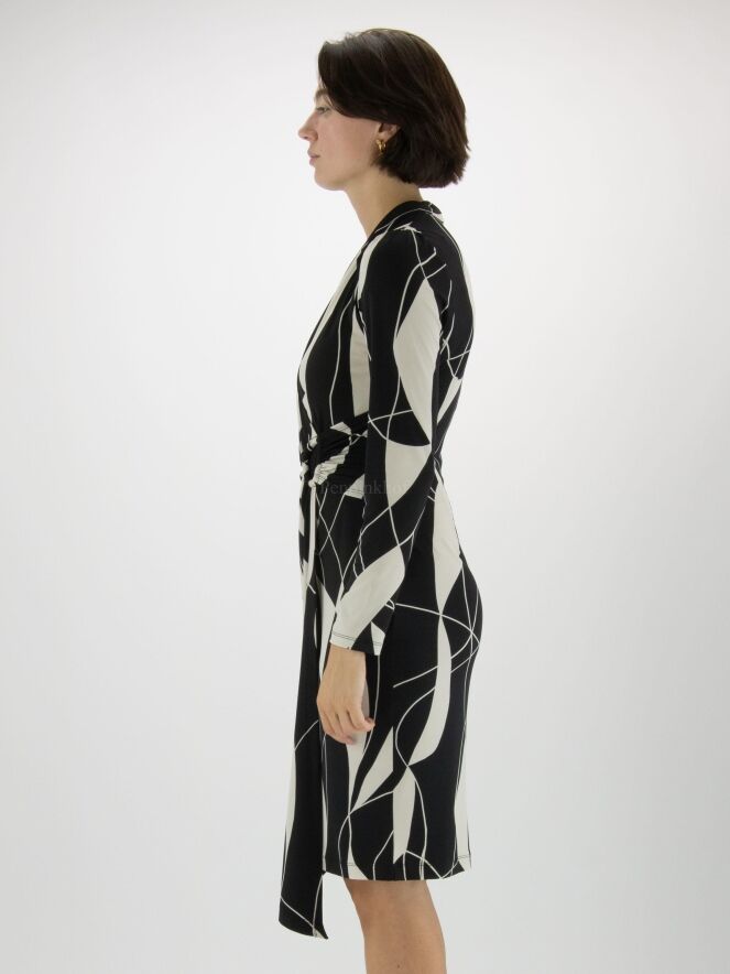 A wrap dress from Joseph Ribkoff in a graphic print with the colours black and kit or light grey. at the waist is a metal buckle in the middle to which the sof is pleated. The dress has a V - Neck and may be hand washed.