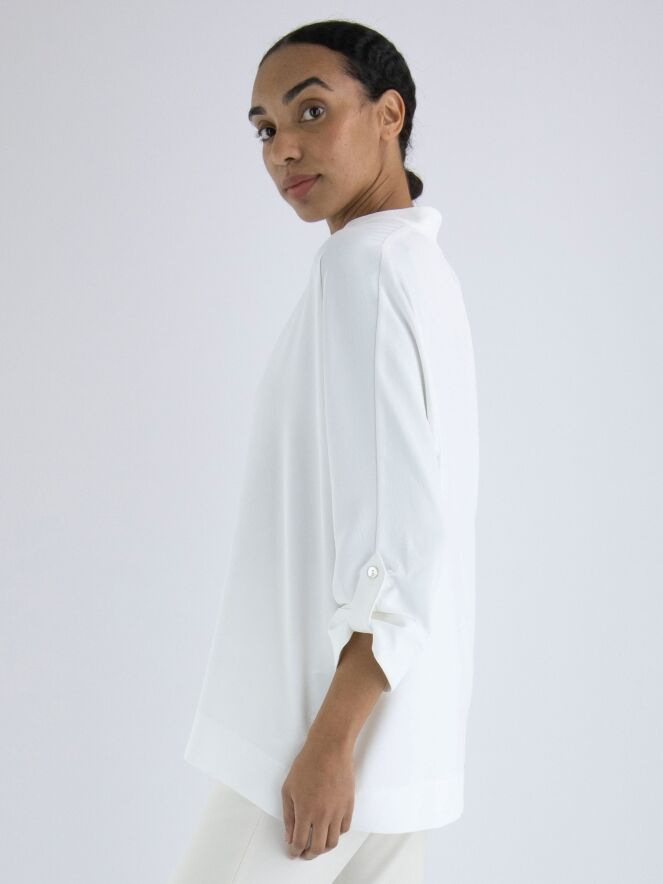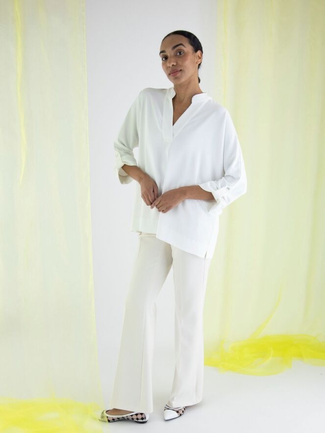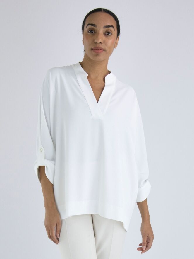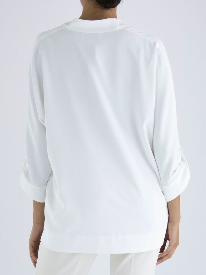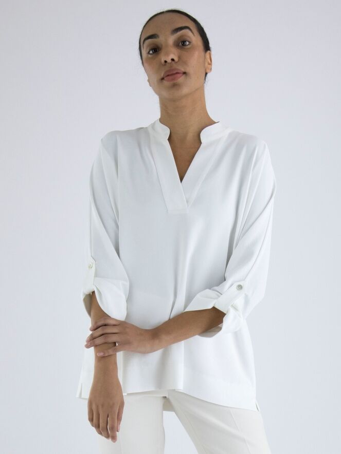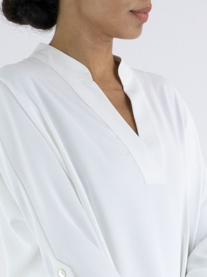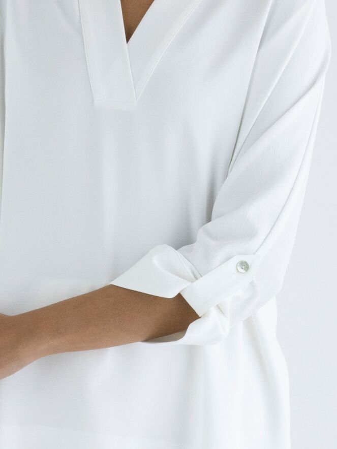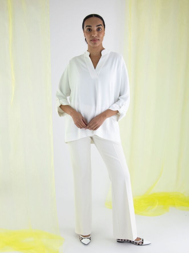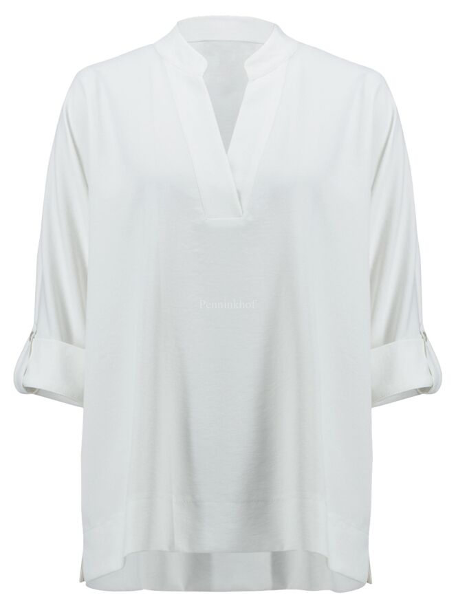 A blouse by Joseph Ribkoff in cream white. The blouse features a V-neck and half-length sleeves. This blouse can be hand washed.