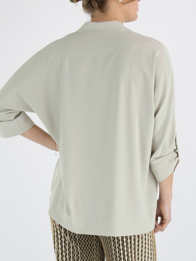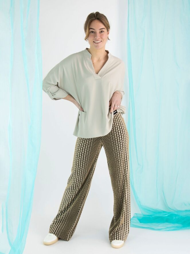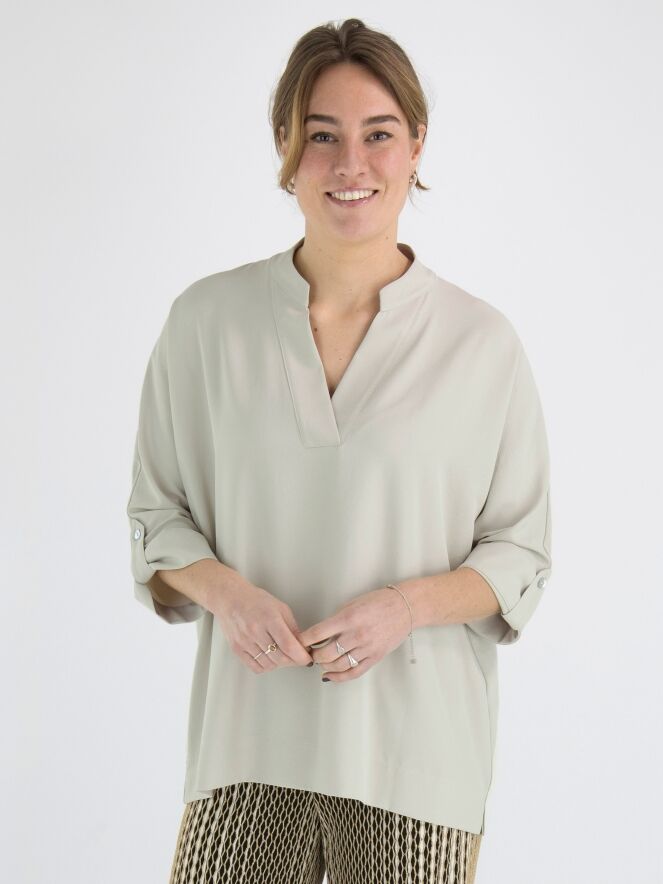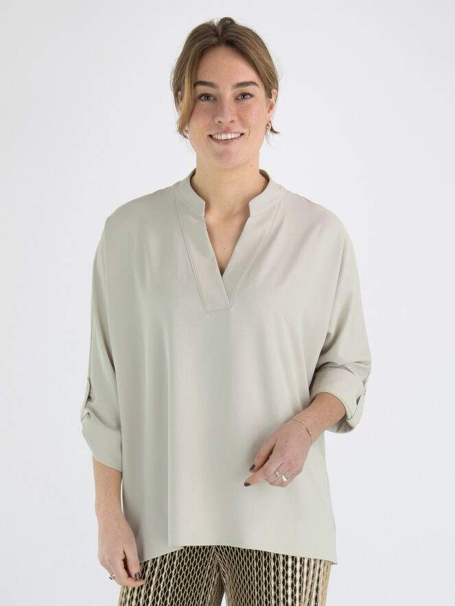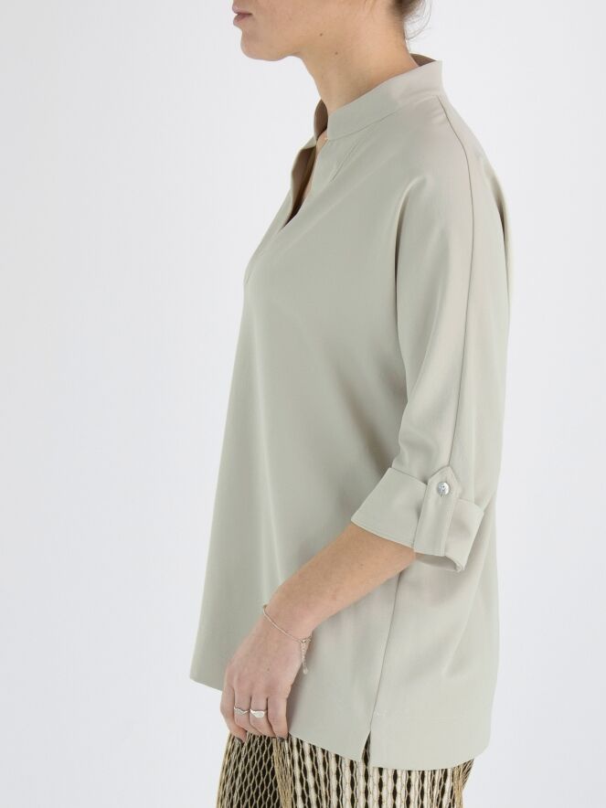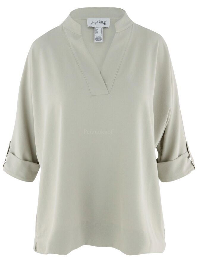 A blouse from Joseph Ribkoff in the colour kit. The blouse has a V-neck and mid-length sleeves. This blouse may be hand washed.