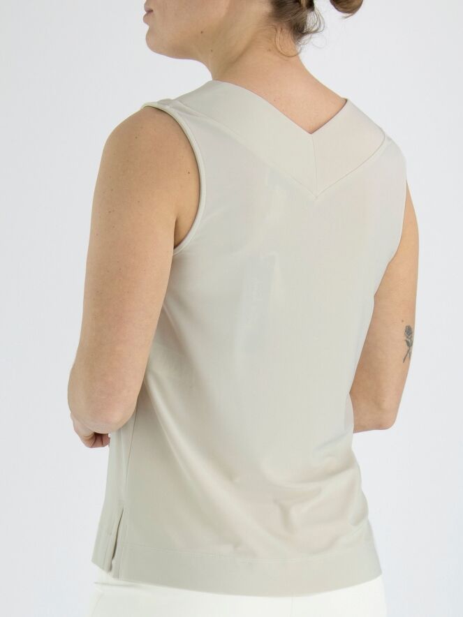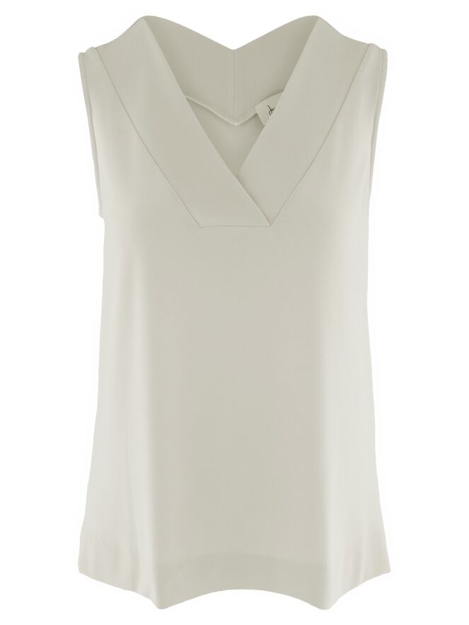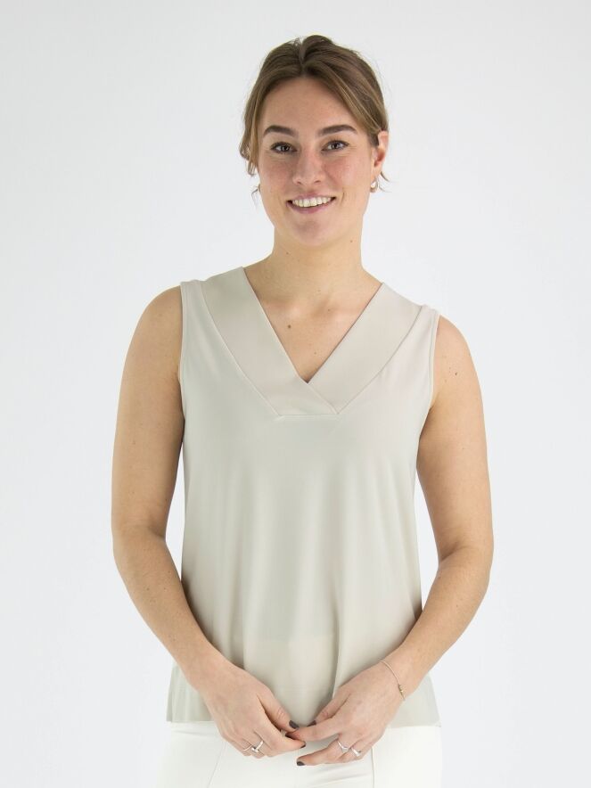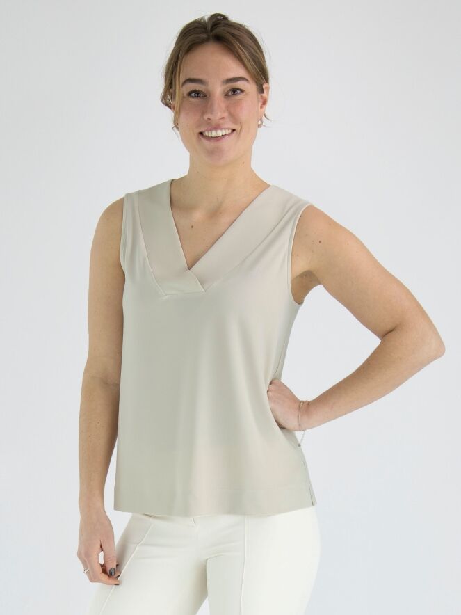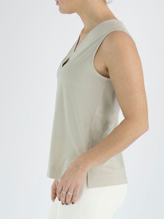 A top by Joseph Ribkoff in a sand color. The V-neck features a short wrap in the middle. This top can be hand washed.