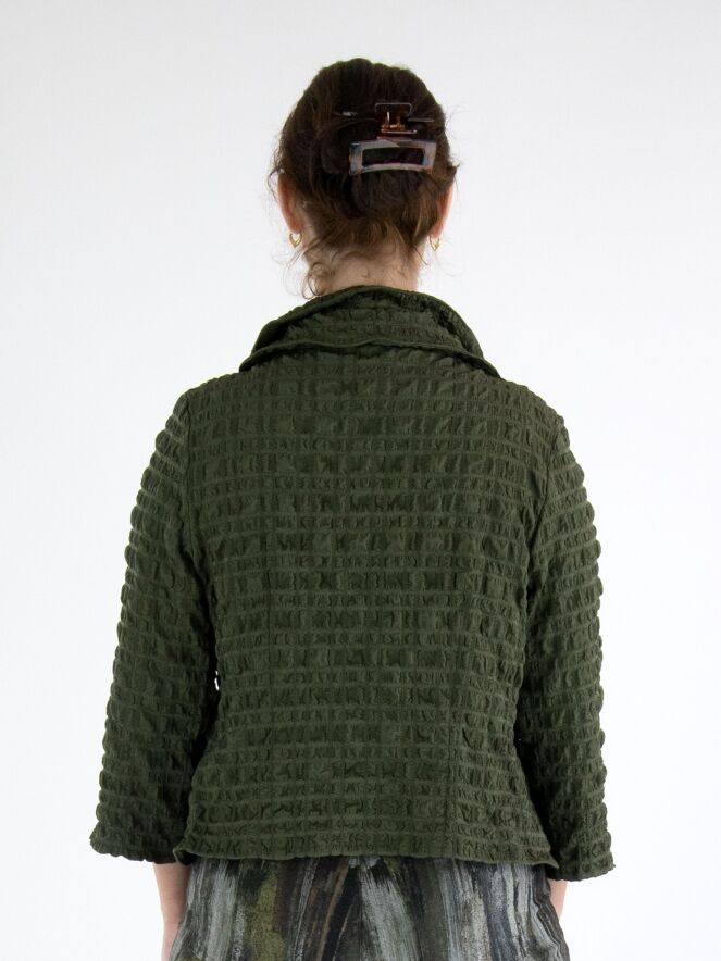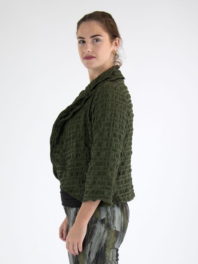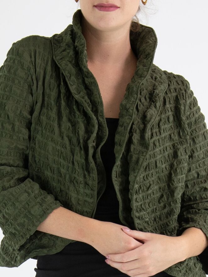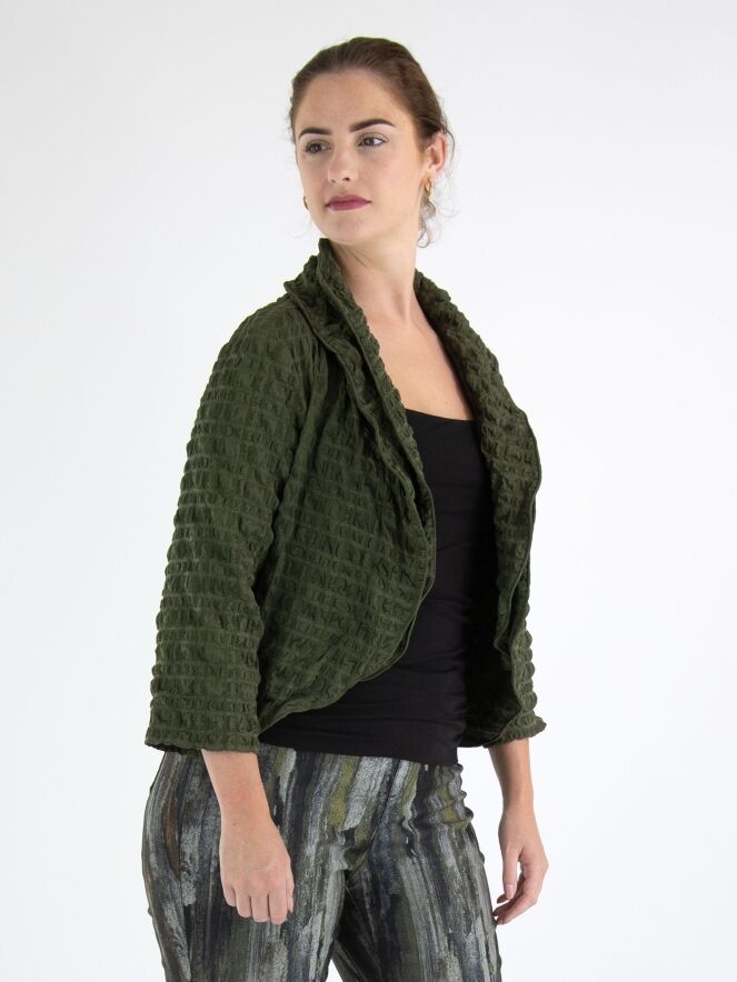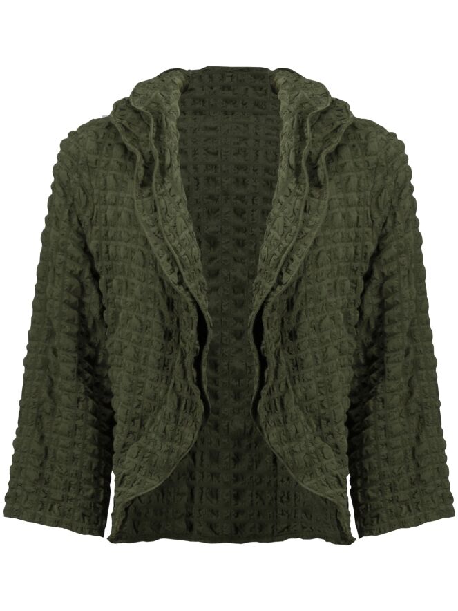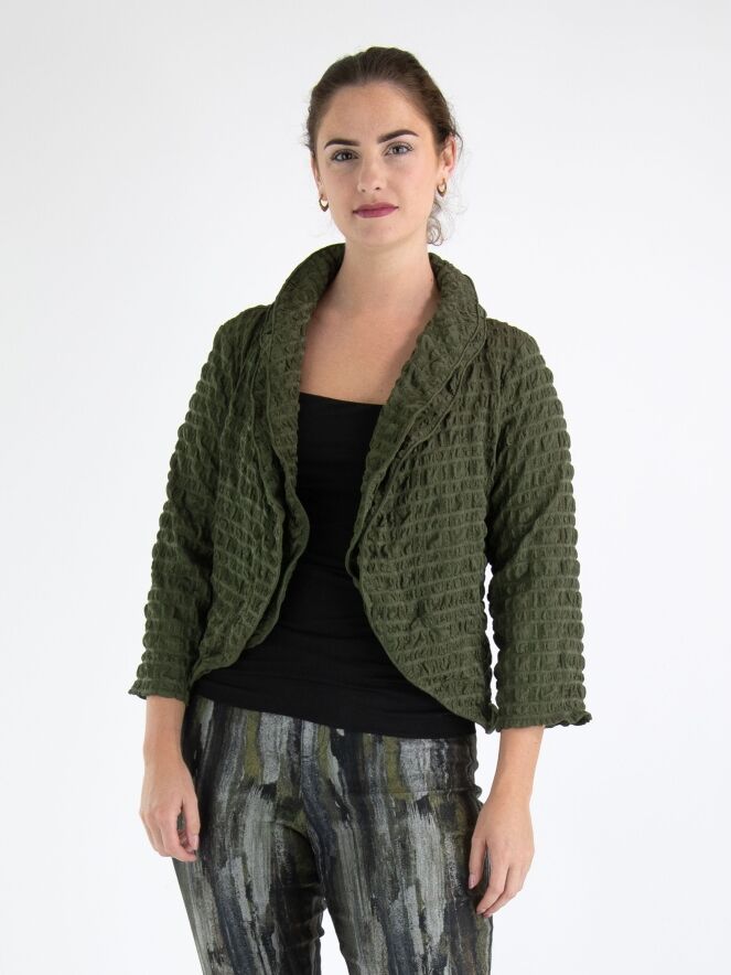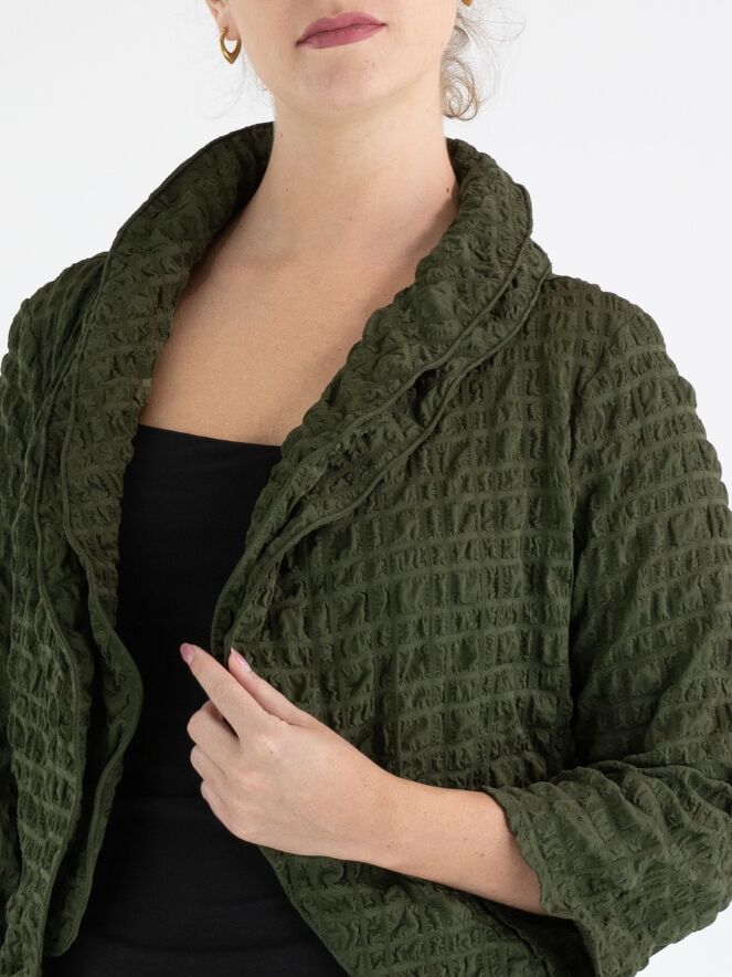 A short smocked cardigan by Joseph Ribkoff in khaki color. The fabric is smocked in a waffle pattern, and the cardigan has no closure. The cardigan features a double collar with reinforcement in the edge. This cardigan can be hand-washed.