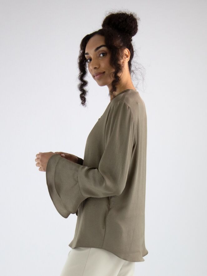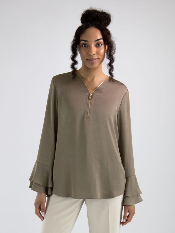 A matte satin shirt from Joseph Ribkoff in taupe. Along the edge of the V-neck is a decorative zipper trim. The long sleeves feature bell cuffs made of double fabric at the ends. This shirt can be hand washed.