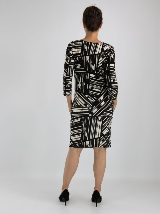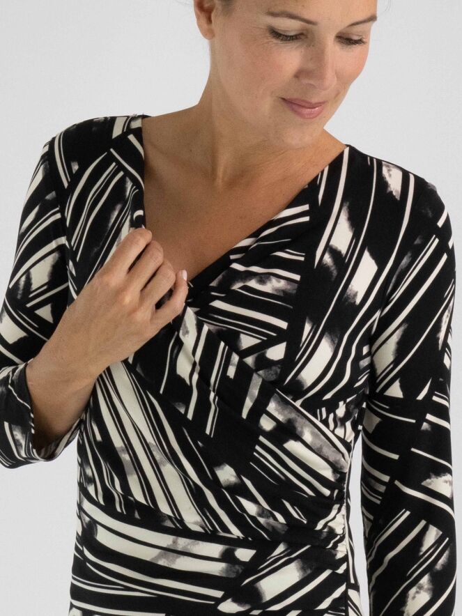 A wrap dress from Joseph Ribkoff featuring a graphic print in cream white, grey, and black. The wrap fastening at the waist is finely pleated, creating a draping effect. The dress has half-length sleeves and can be hand washed.