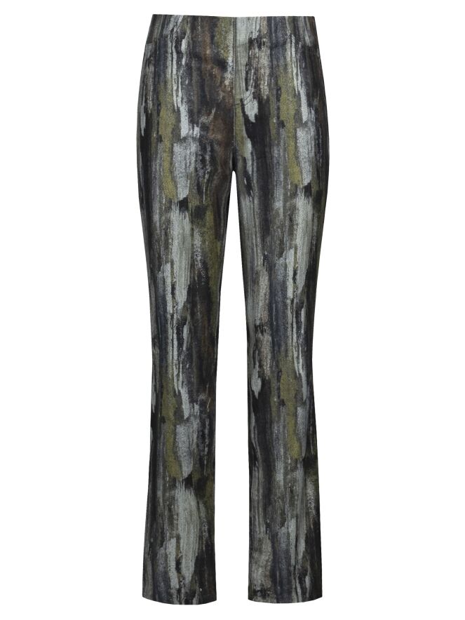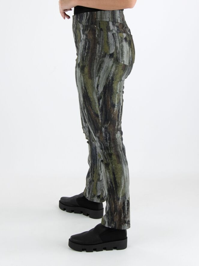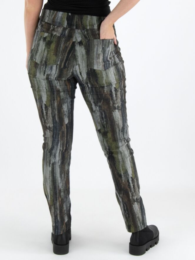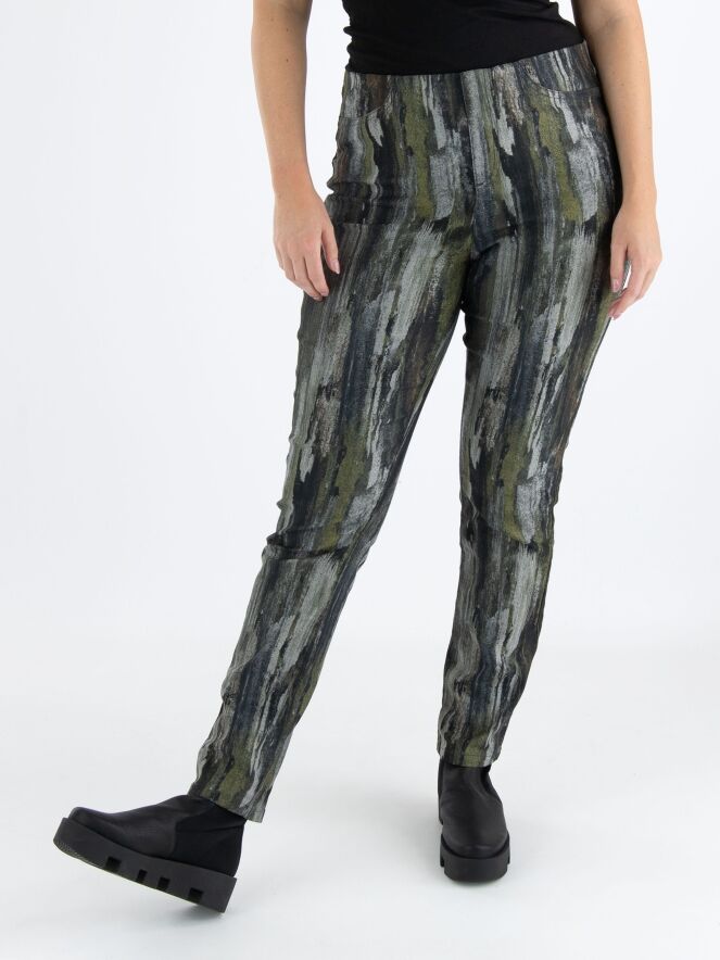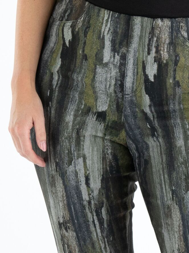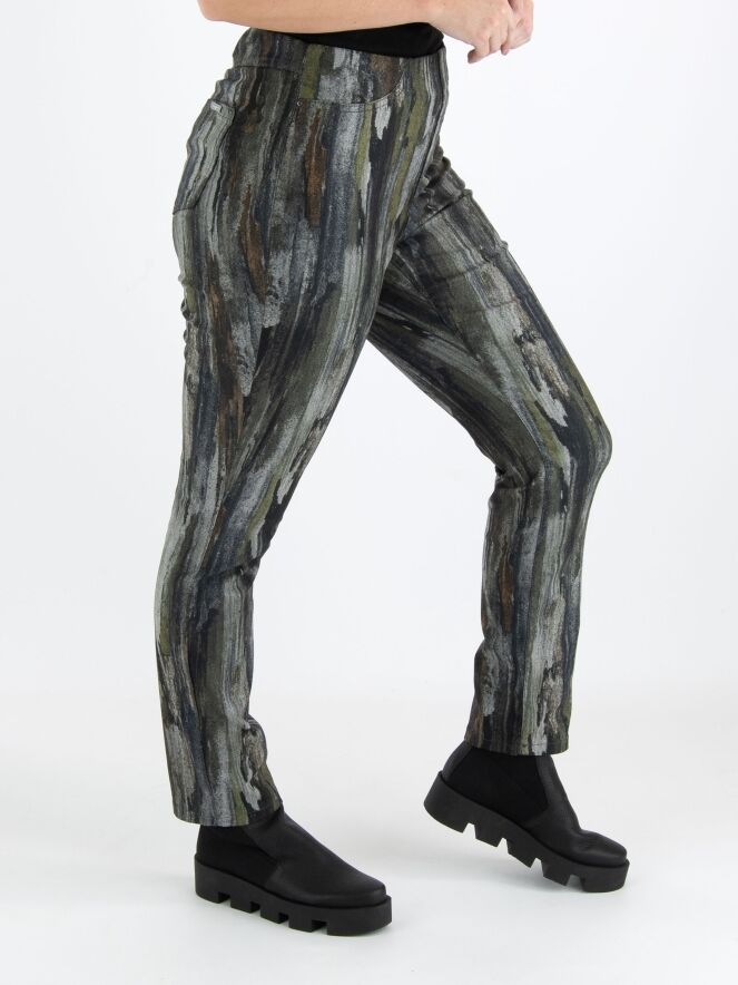 Pants from Joseph Ribkoff in a painted bark print with multiple shades of green, gray, and brown. The waist features an elastic band. These pants can be washed at 30 degrees.