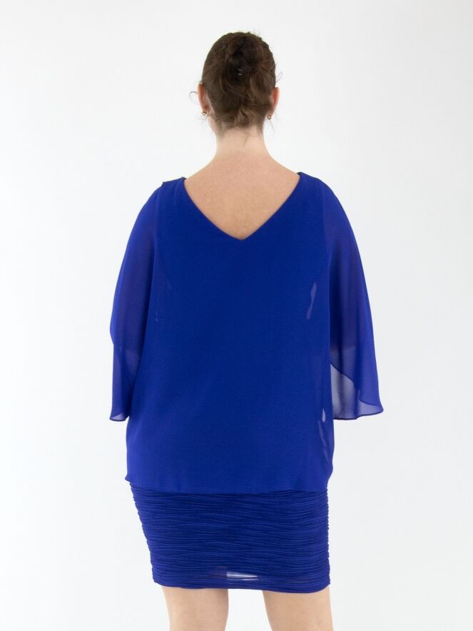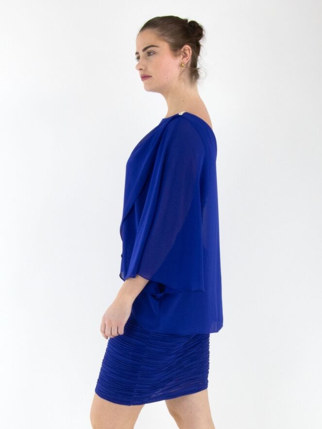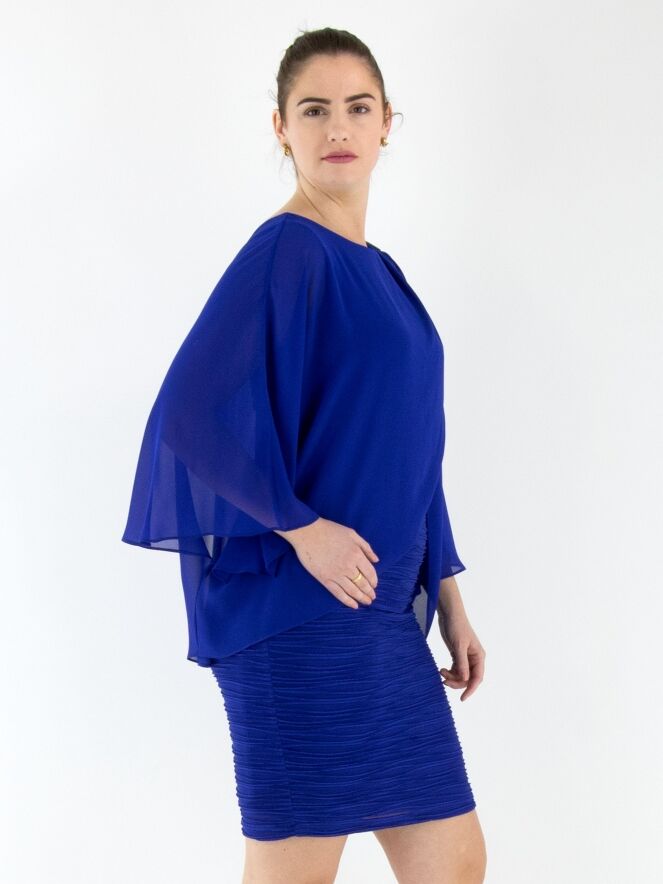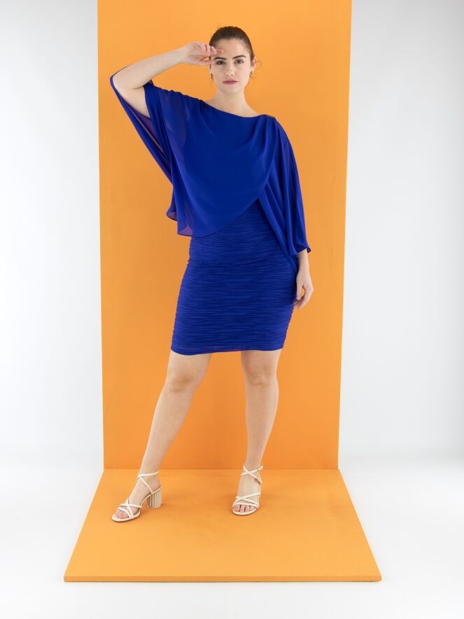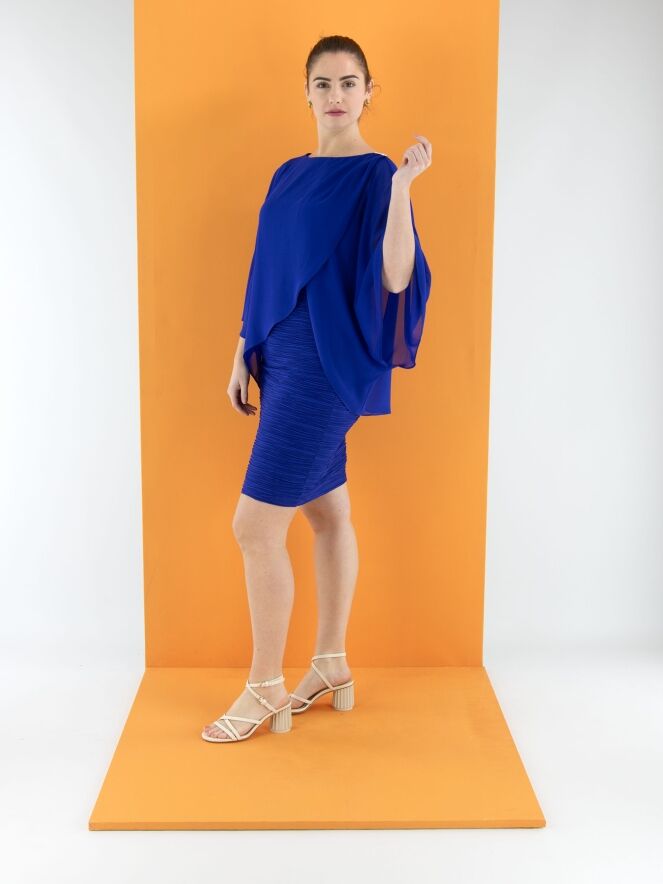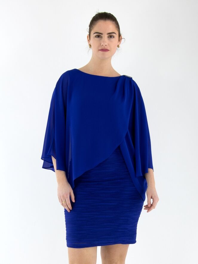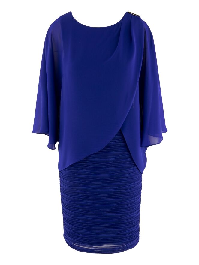 A dress by Joseph Ribkoff in cobalt blue. The fabric features a ribbed texture with gold thread woven into the rib lines. The dress is fully lined. A voile overlay extends to the waist, draped from the shoulders with delicate pleats and secured with a decorative buckle. This dress should be hand-washed.