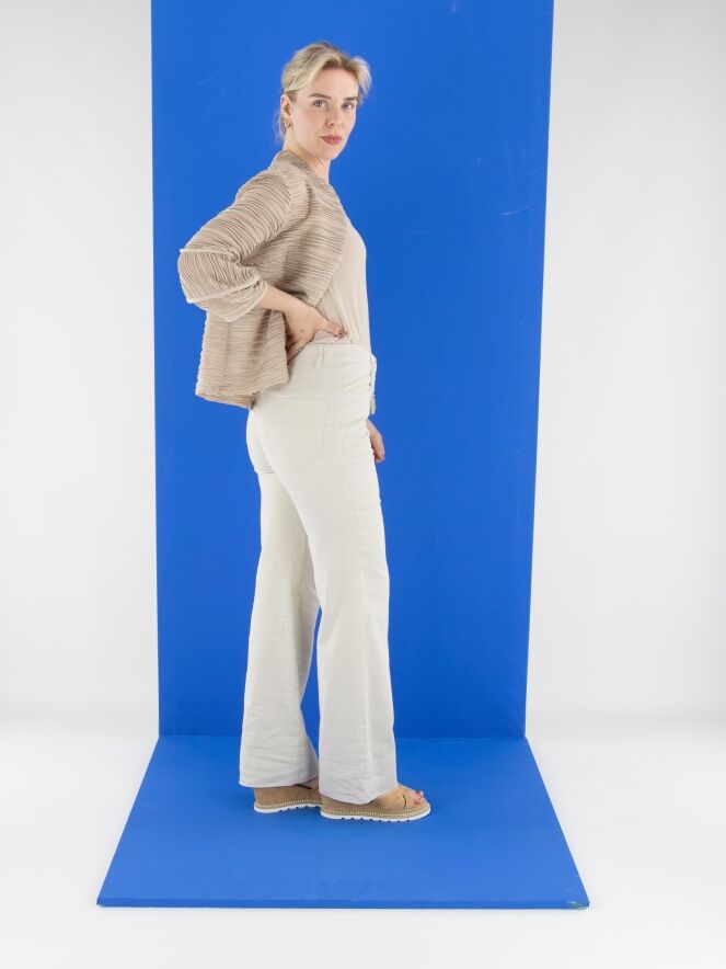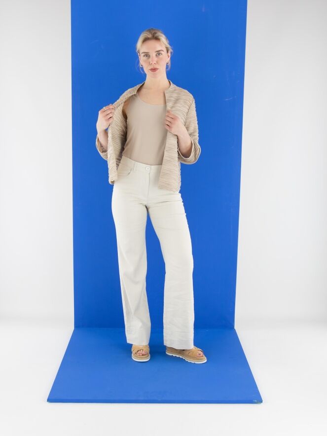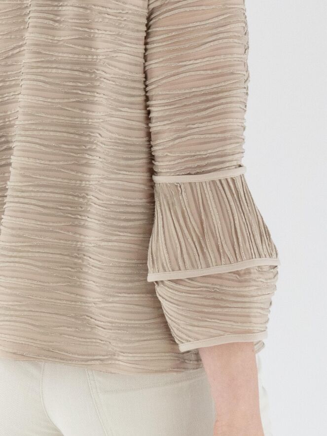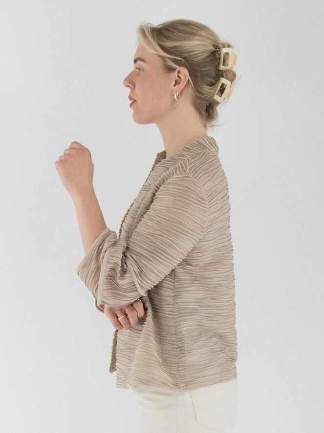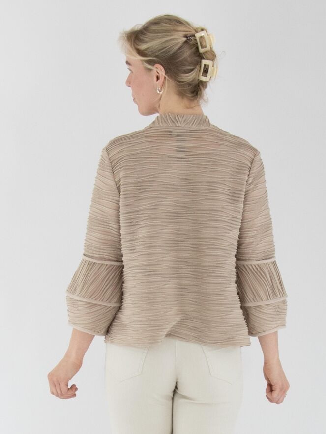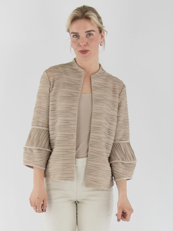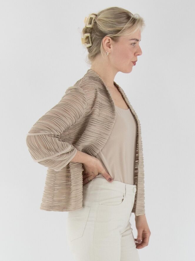 A lightweight, transparent cardigan from Joseph Ribkoff in sand color. The fabric is finely pleated, with metallic thread woven along the edges of the pleats. At the ends of the three-quarter-length sleeves, the fabric is partially set at an angle. The cardigan features a fur hook closure and includes a top as lining. This cardigan should be hand-washed.