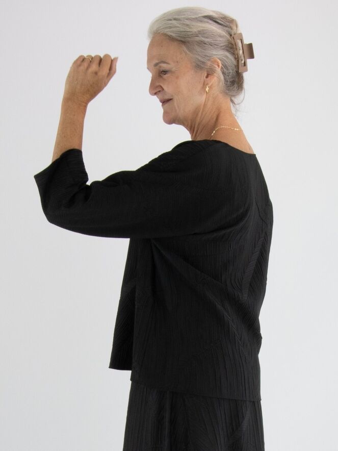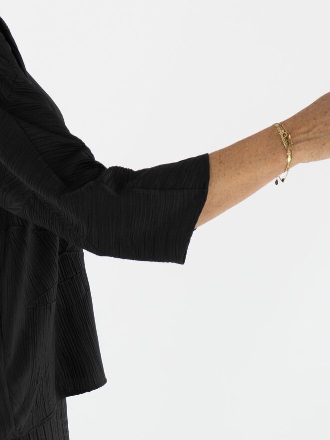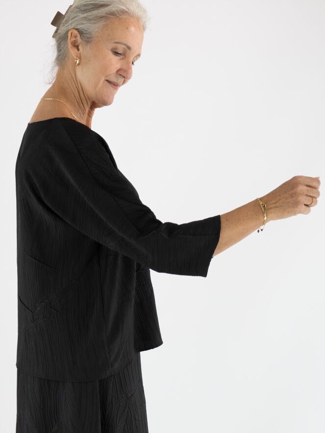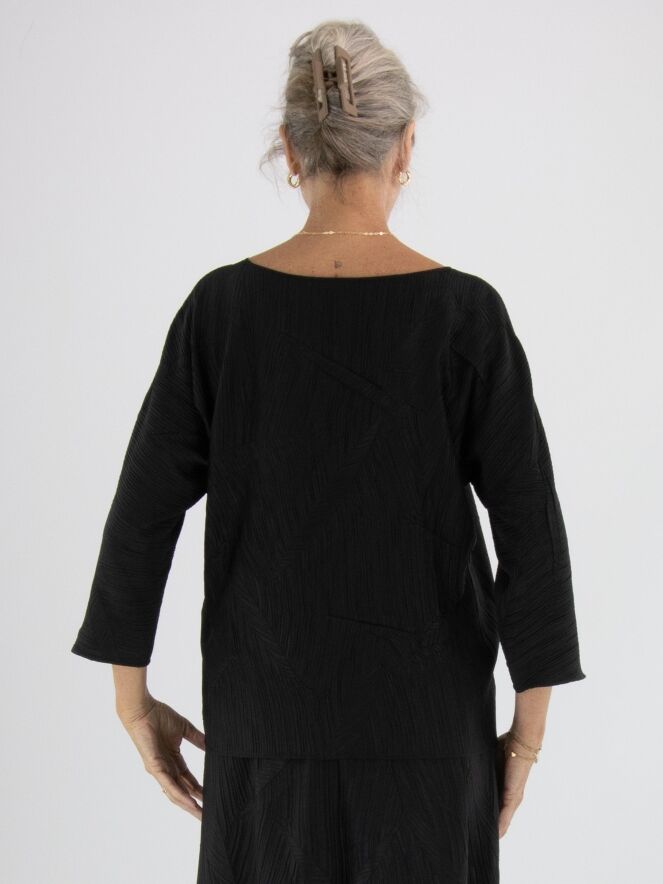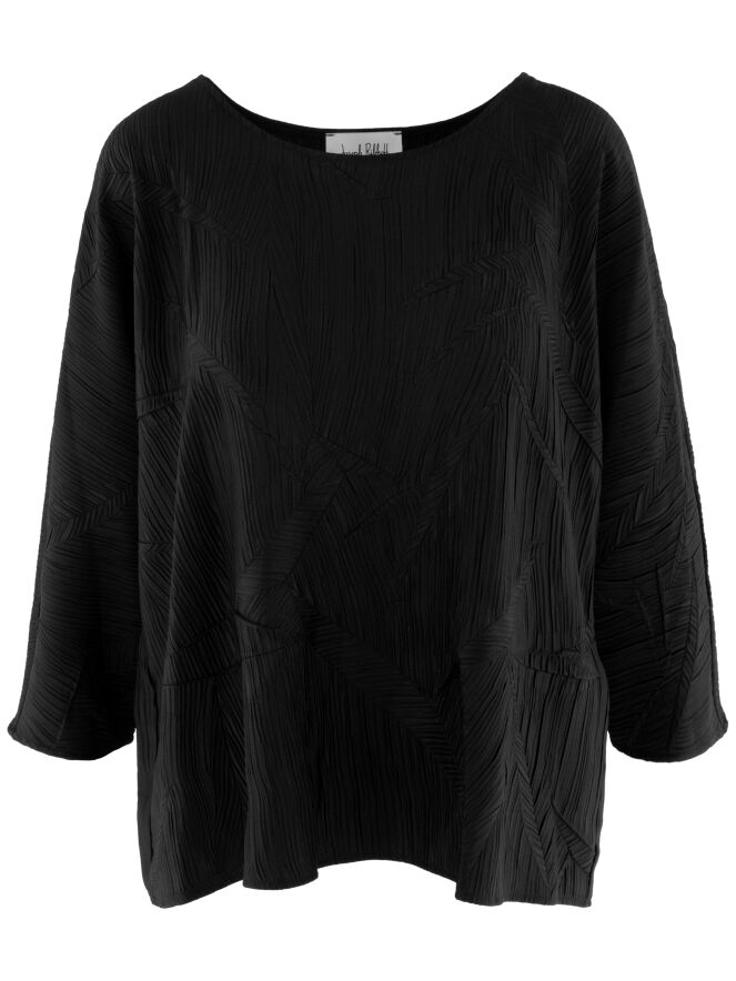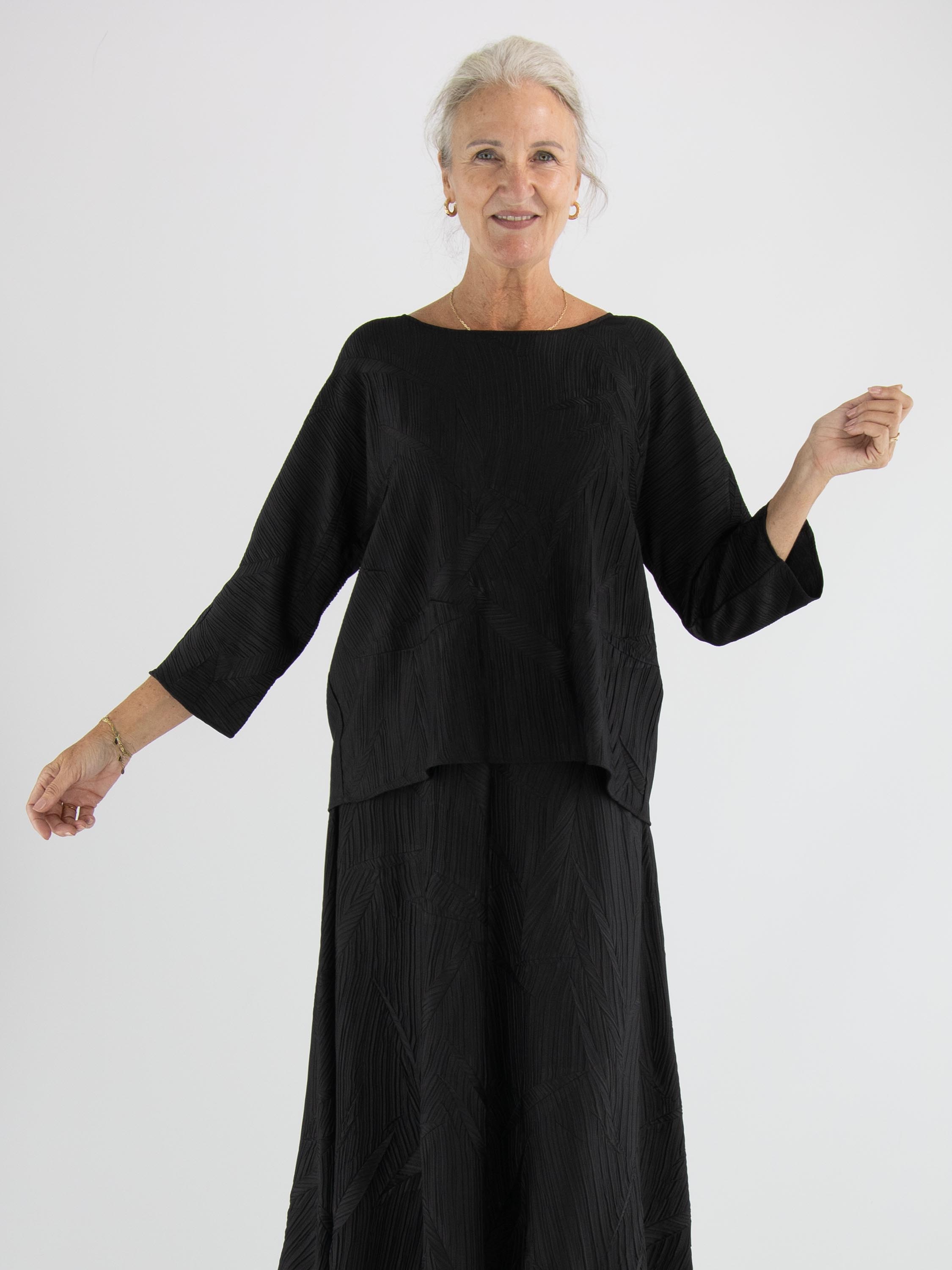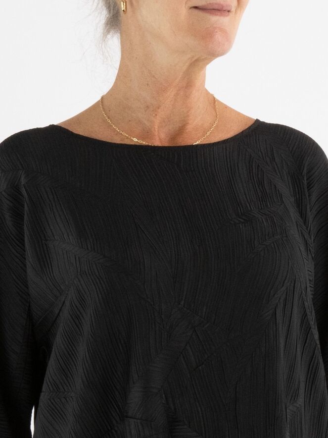 A black shirt by Joseph Ribkoff. The fabric is finely pleated in a leaf motif. The shirt features a round neckline and elbow-length sleeves. This shirt must be hand-washed.
