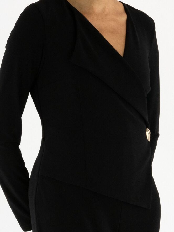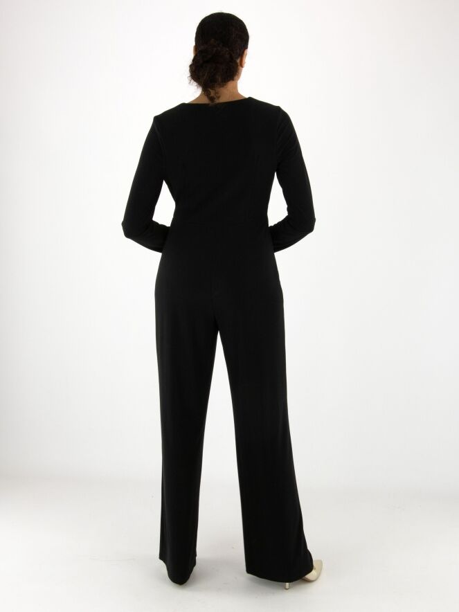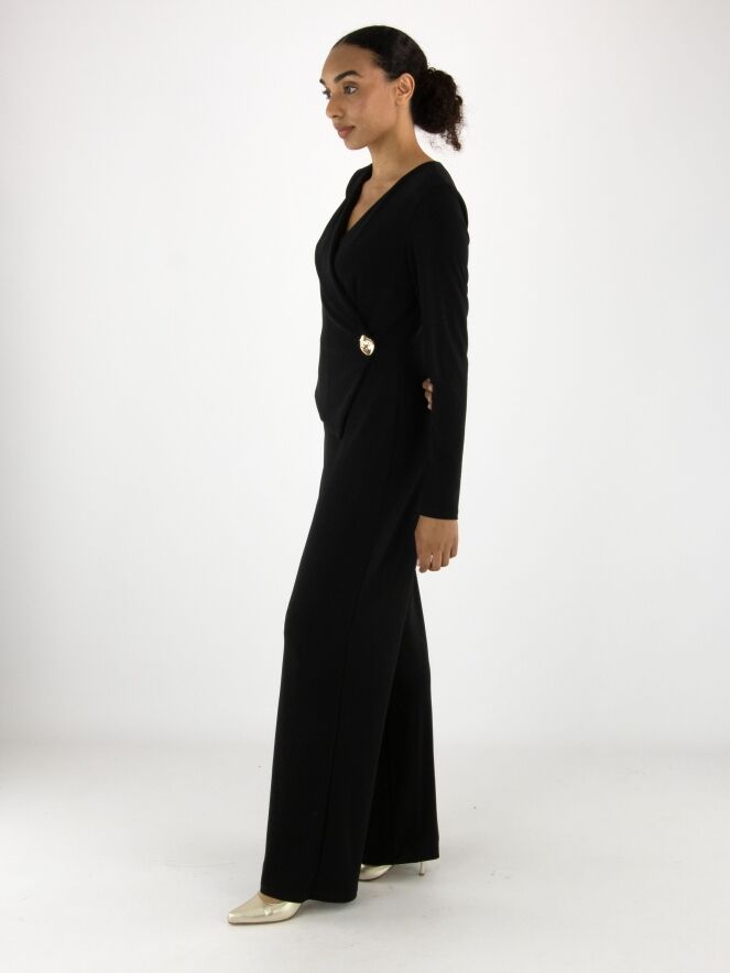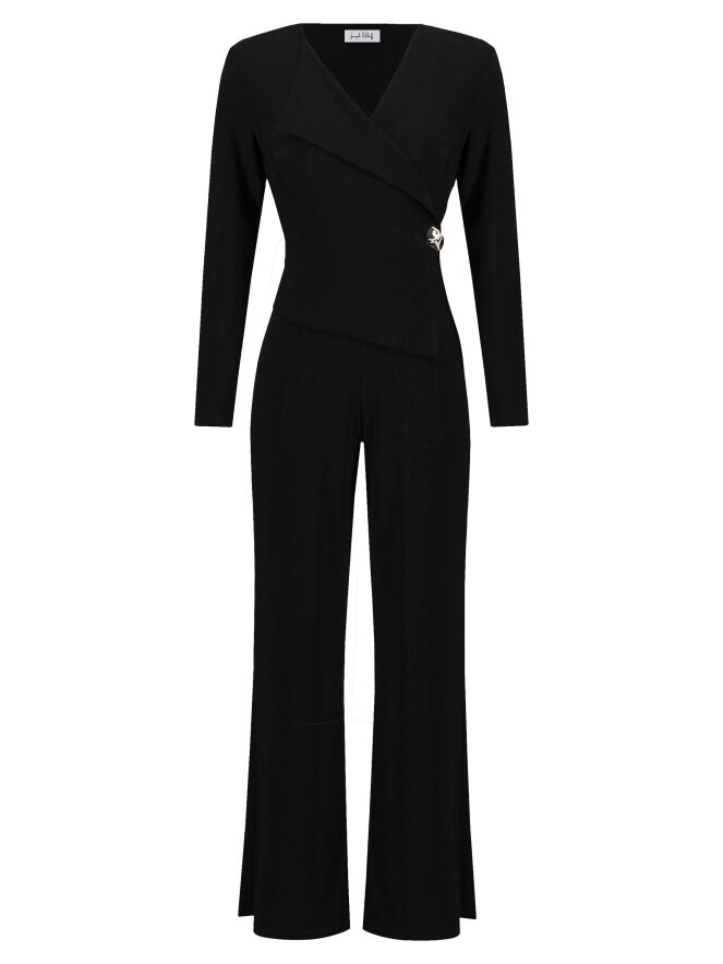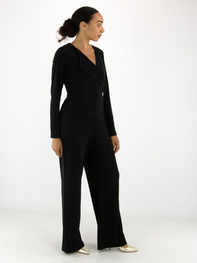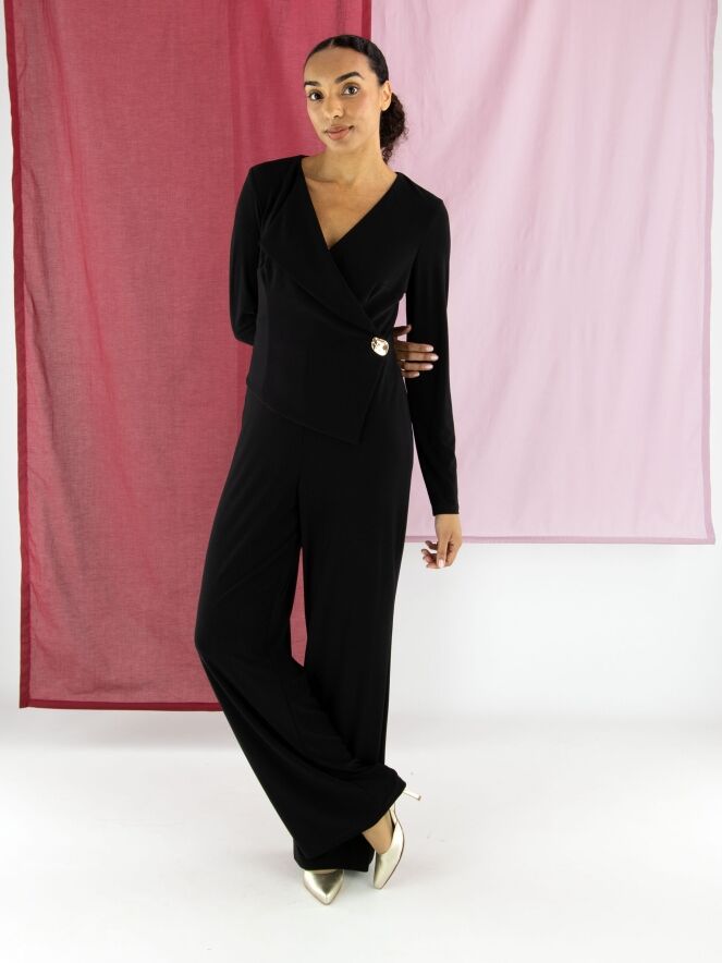A black jumpsuit by Joseph Ribkoff. From the neckline on the right side runs a collar with a wide lapel down to the waist, featuring a wrap detail accentuated by a decorative gold button. This jumpsuit should be hand-washed.
