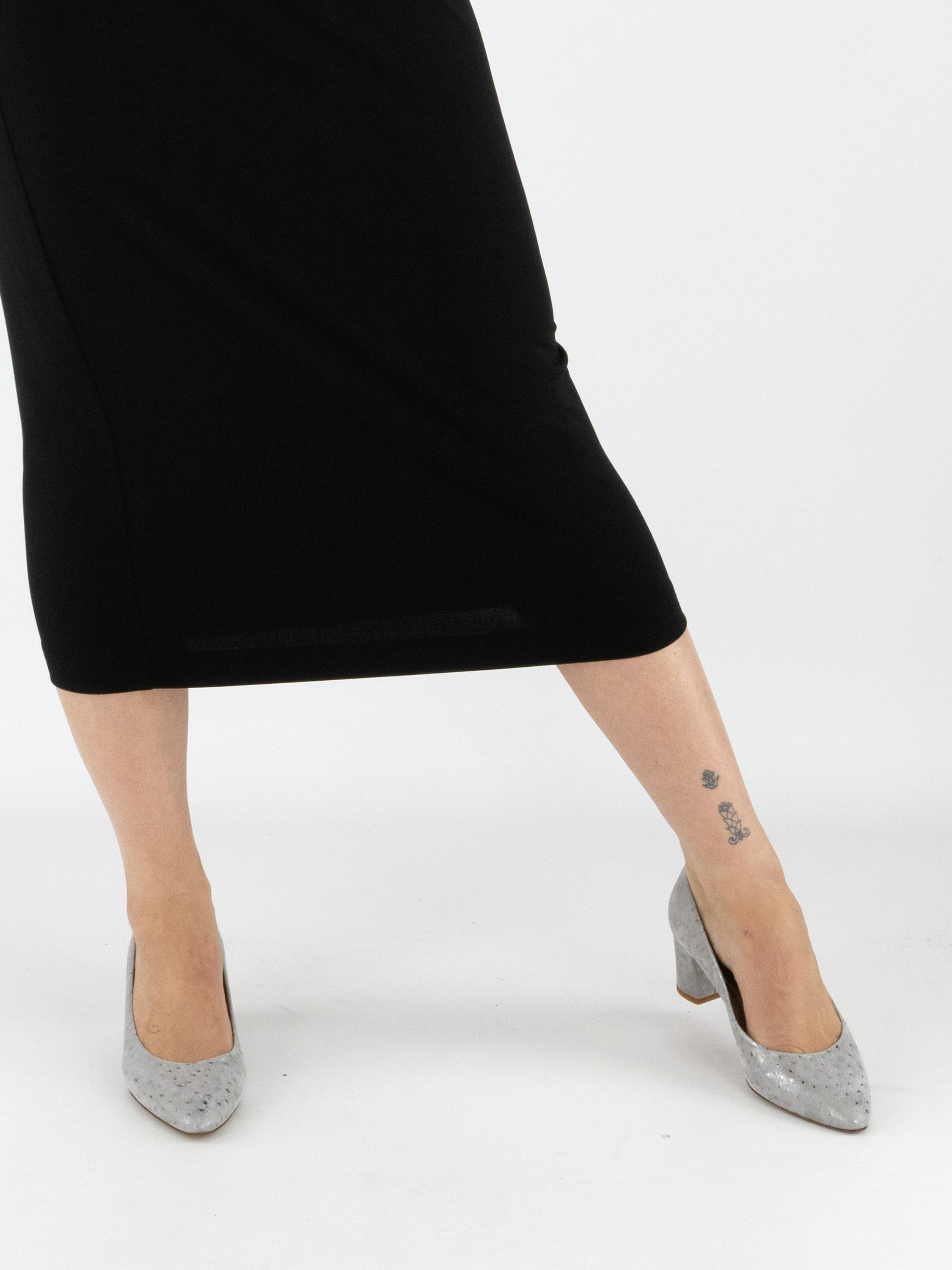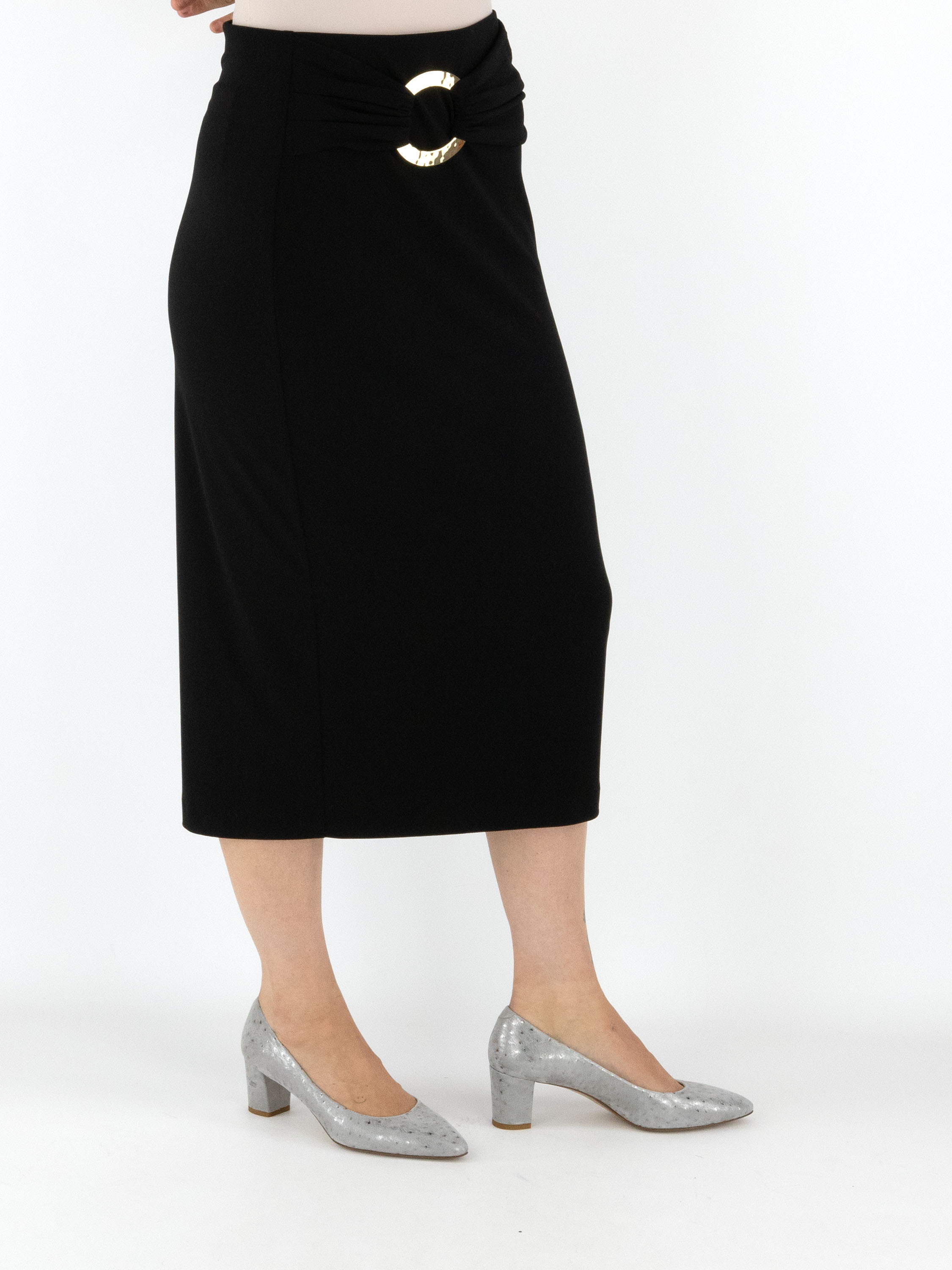 A straight skirt by Joseph Ribkoff in black. The waistband features a wide elastic band. A pleated fabric drapes across the front of the waist, with a gold-toned decorative buckle just right of center. This skirt should be hand-washed.