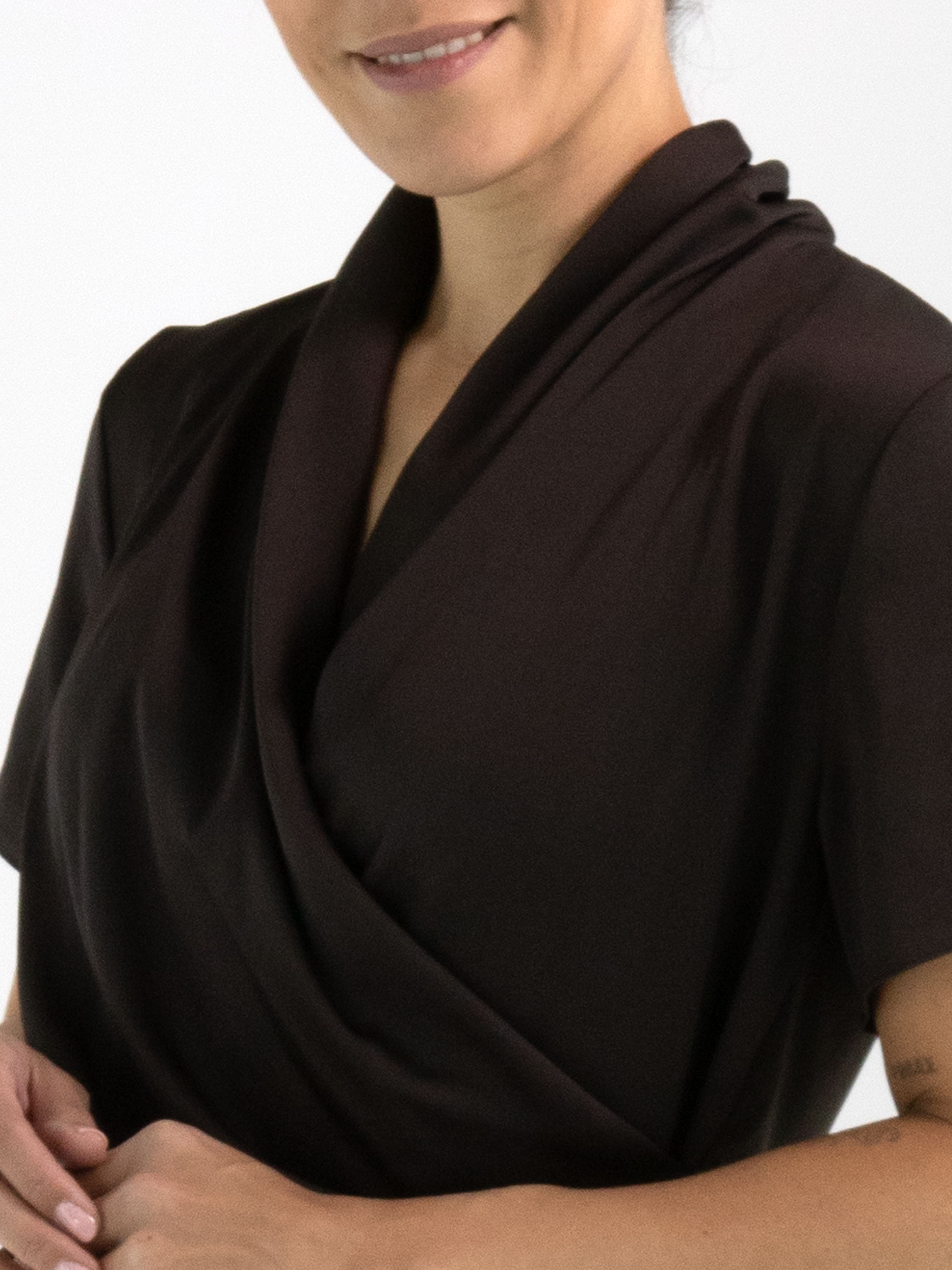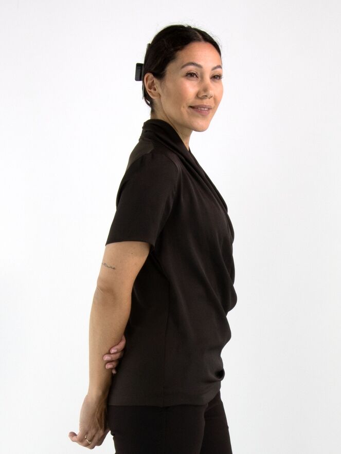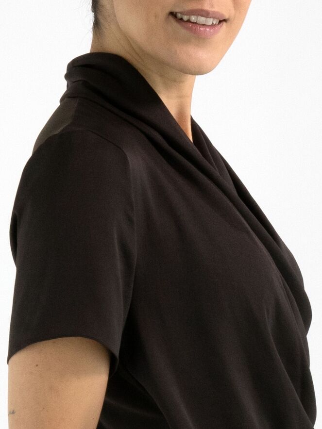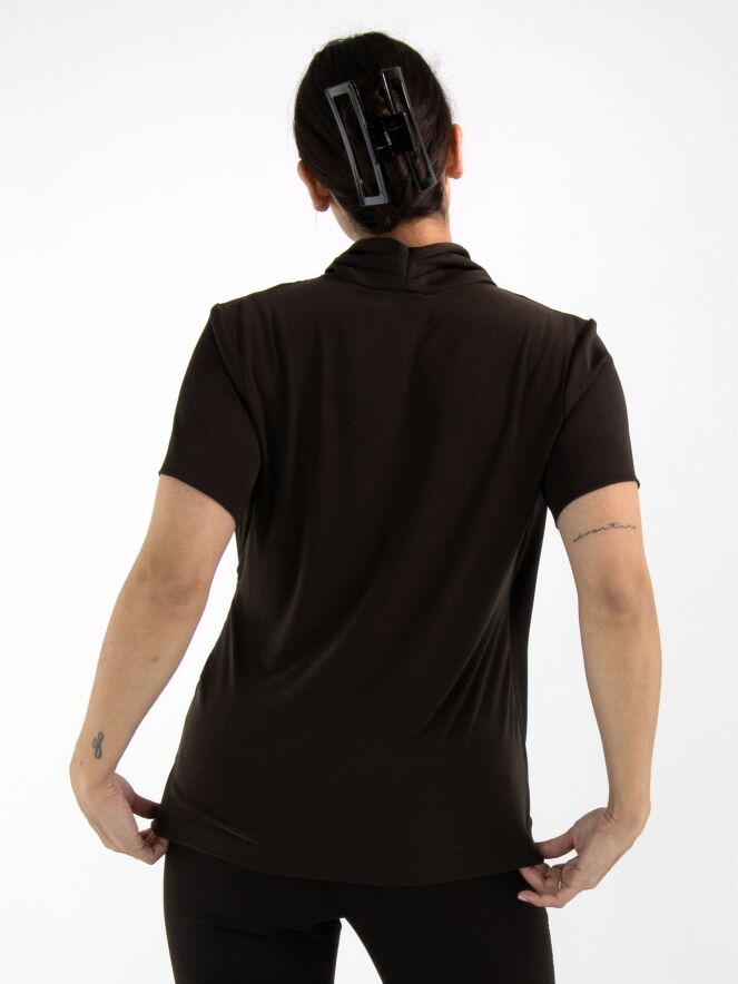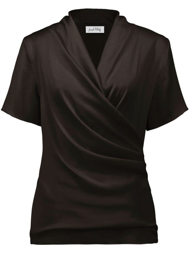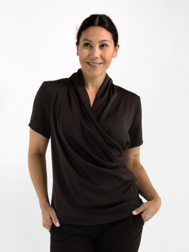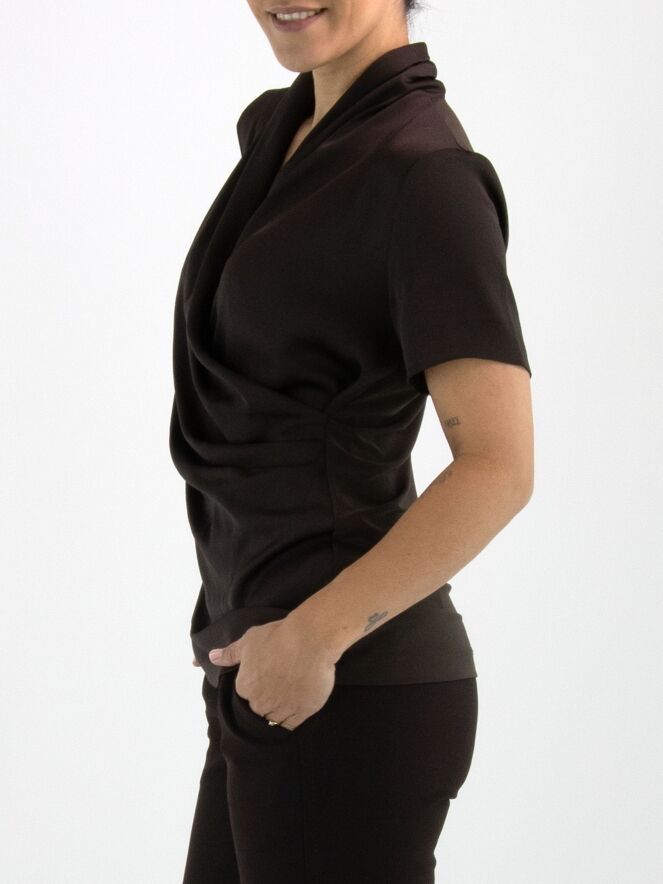 A wrap-style shirt from Joseph Ribkoff in mocha brown. At the waist, the wrap is secured on the left side with several pleats, creating an elegant draped effect. The shirt features short sleeves and can be hand-washed.