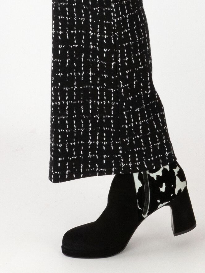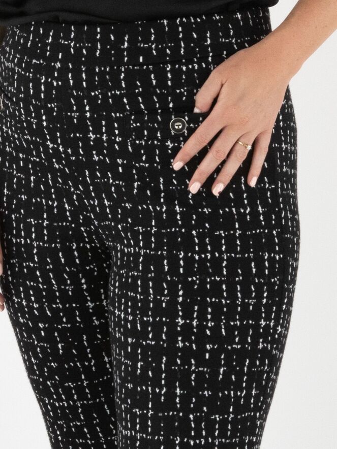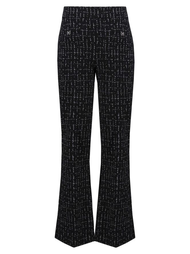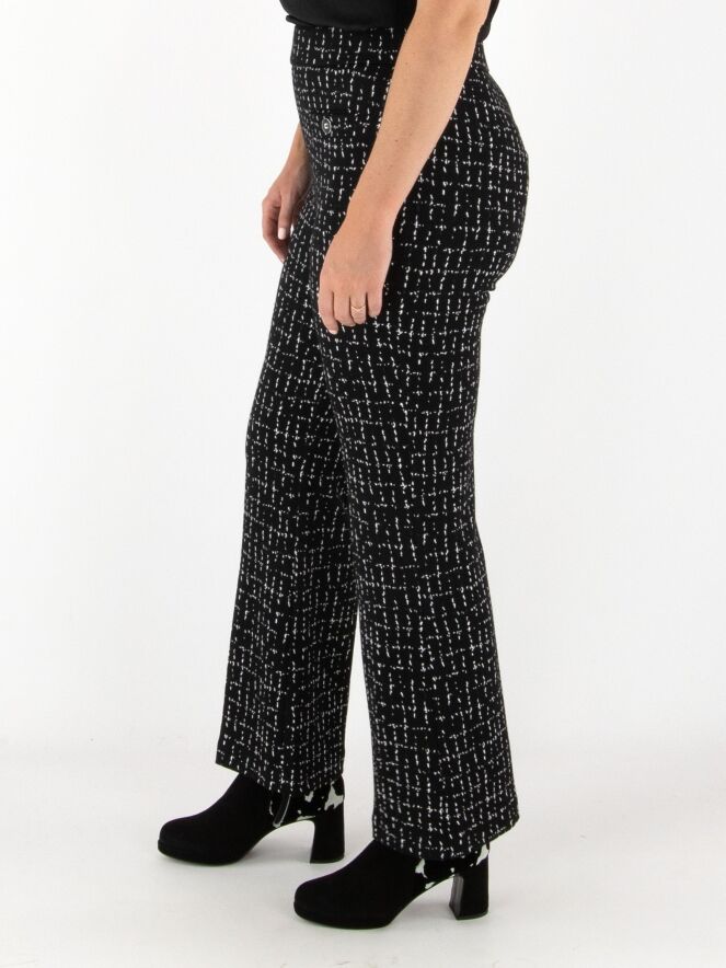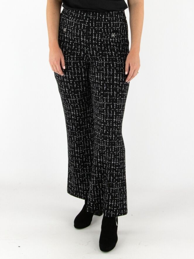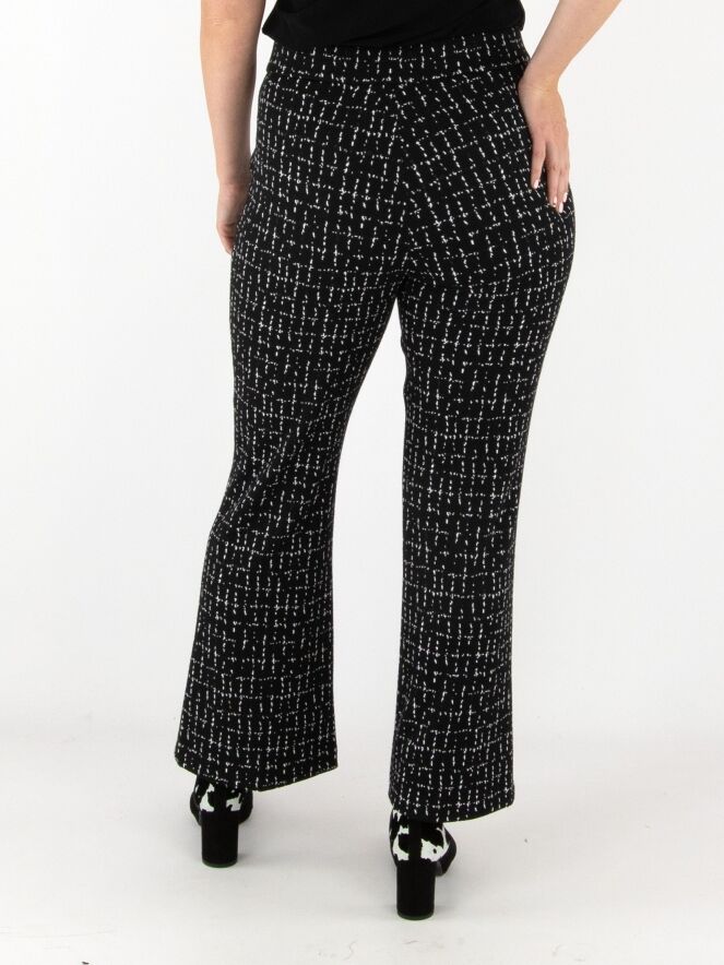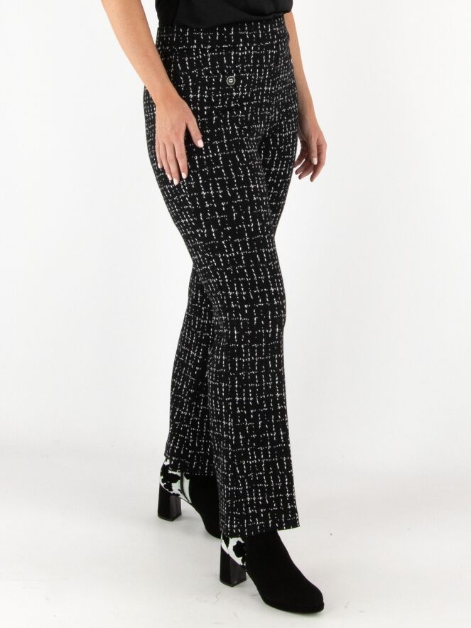 A flared pair of trousers by Joseph Ribkoff featuring a black and white graphic print. The waistband is elastic. These trousers should be hand-washed.