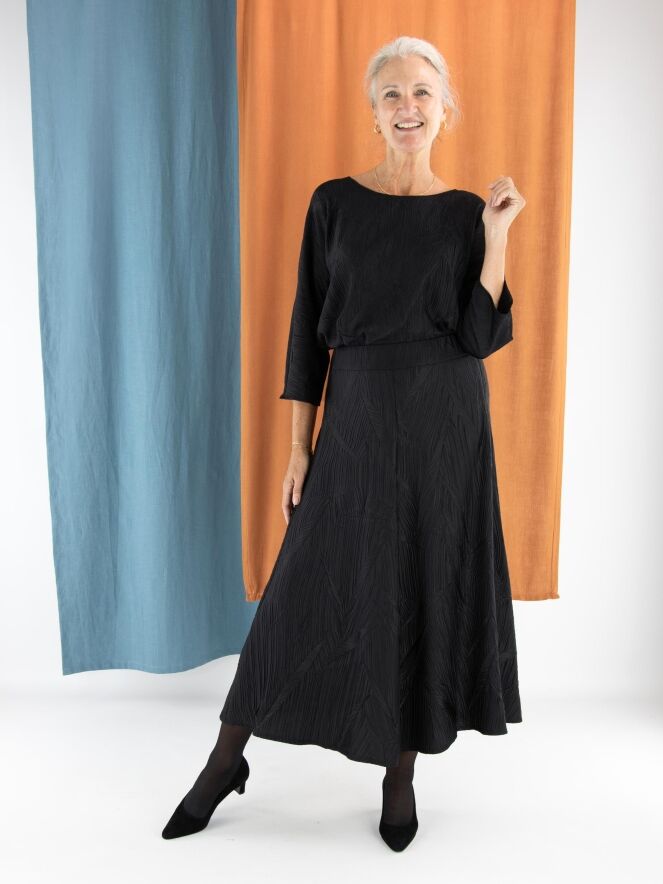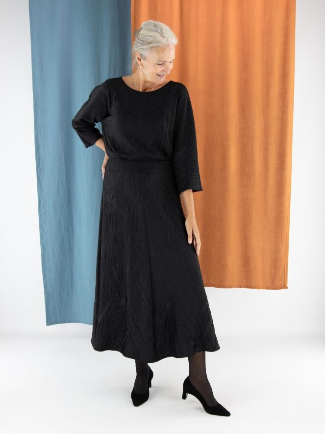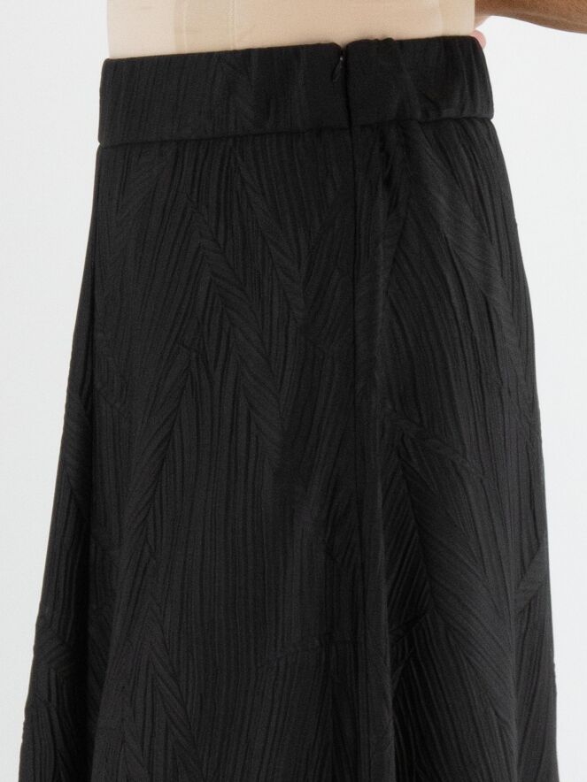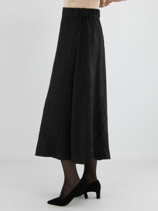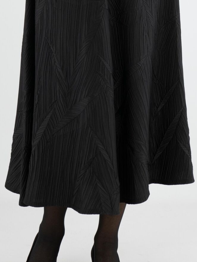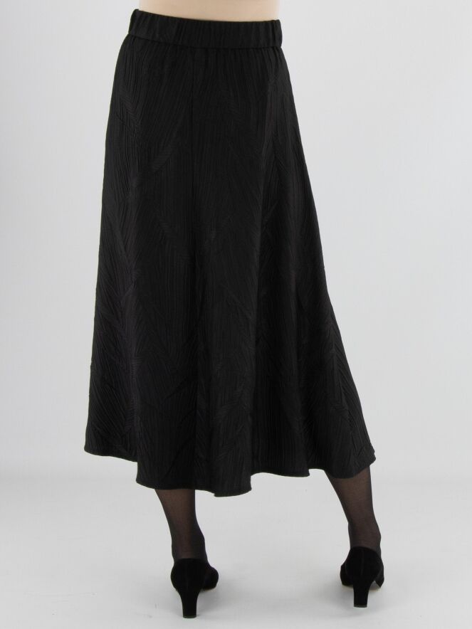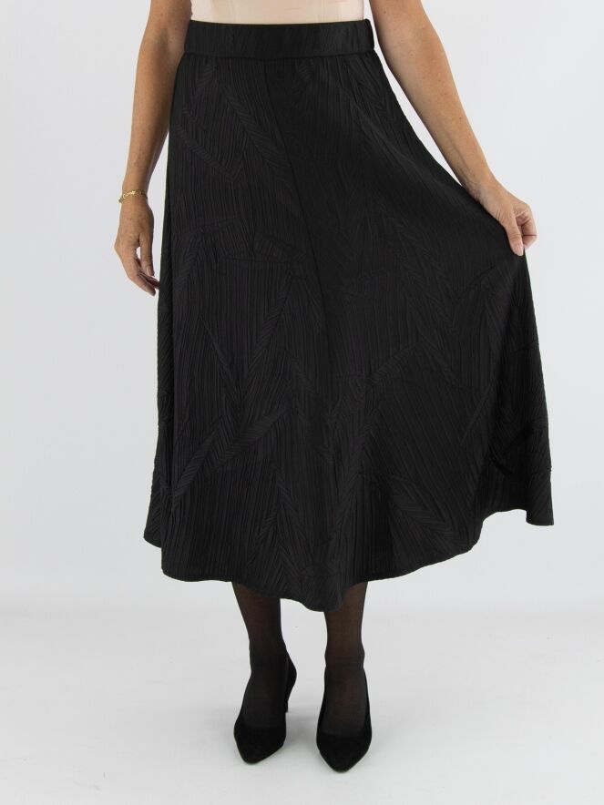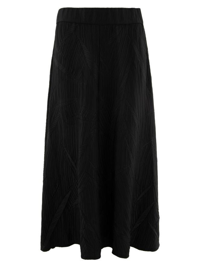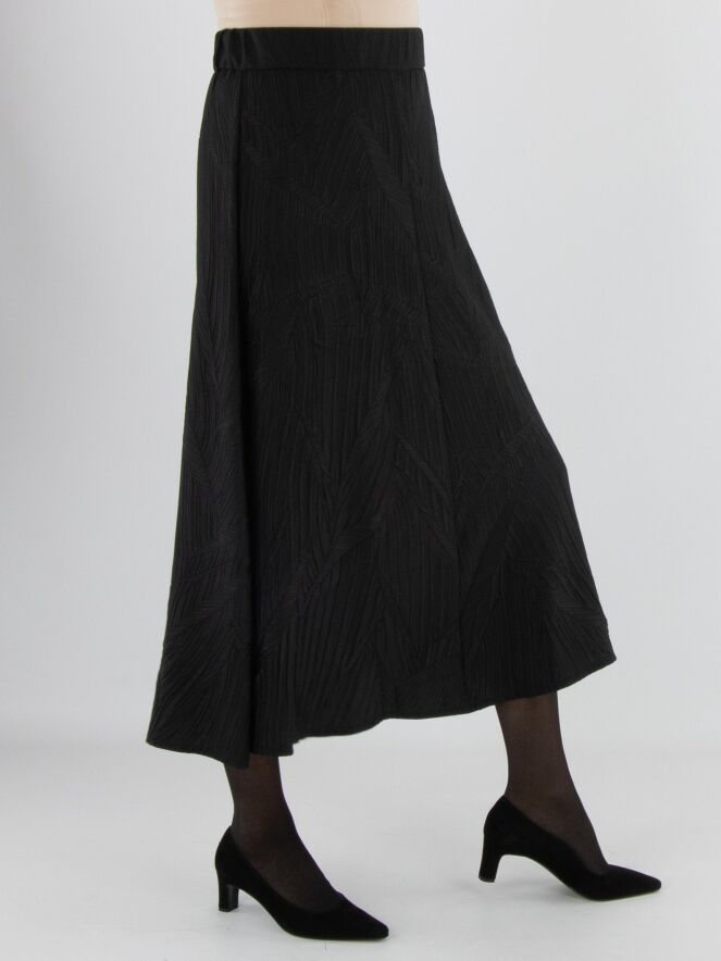 A skirt by Joseph Ribkoff in black. The fabric is finely pleated in a leaf pattern. The waistband is wide and elastic. The skirt is unlined and must be hand-washed.