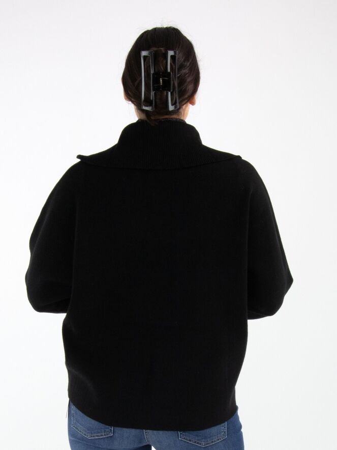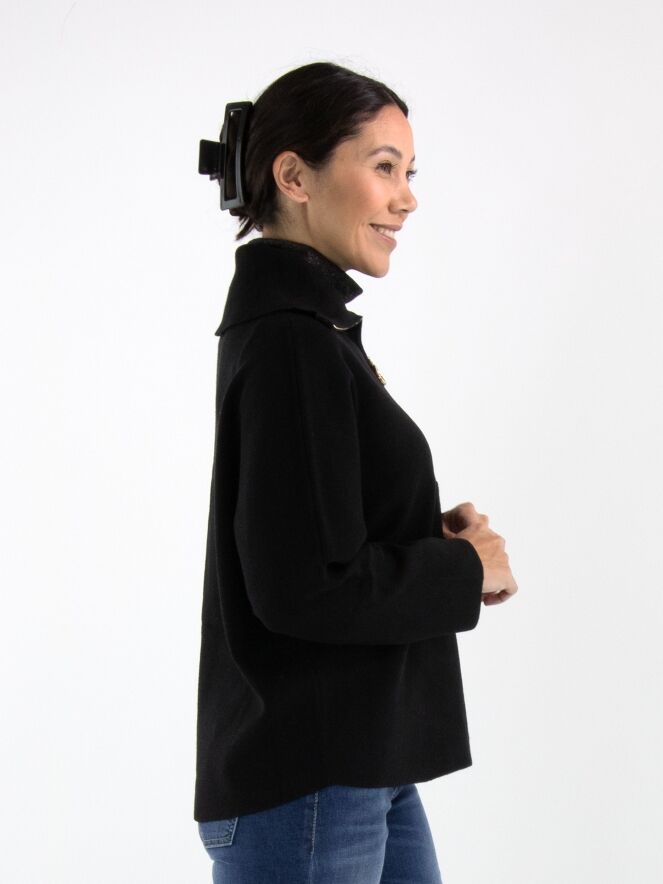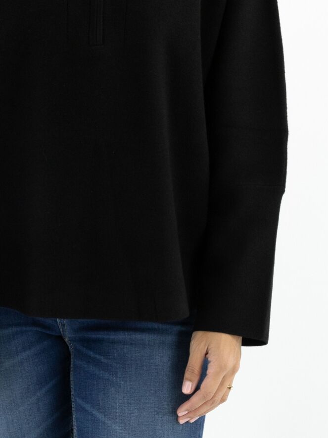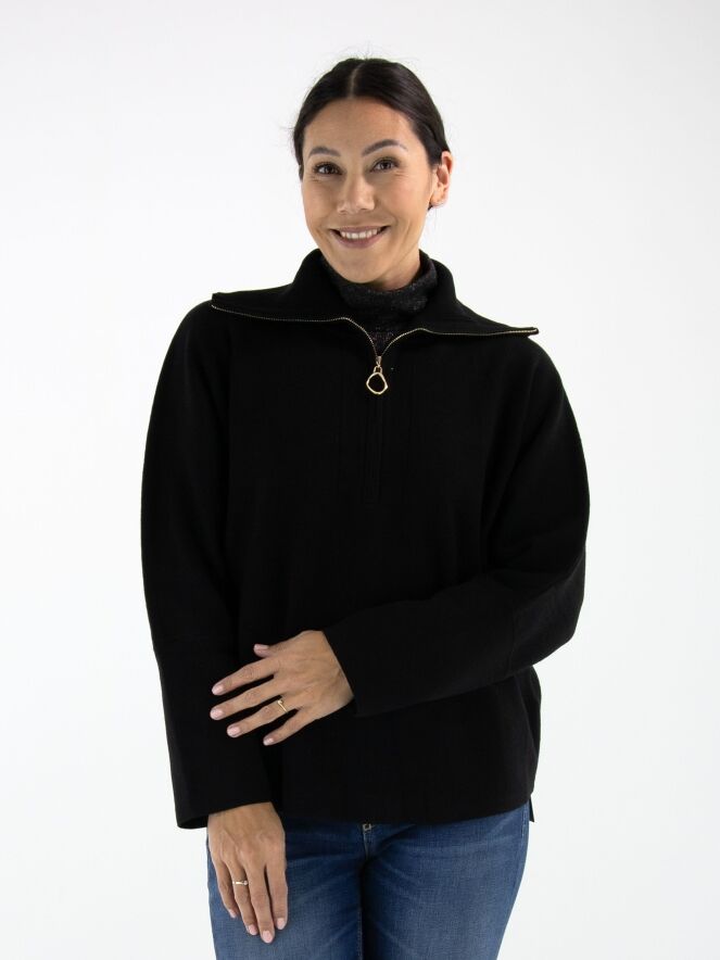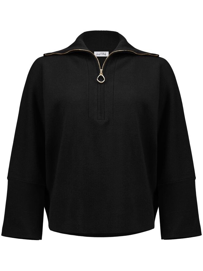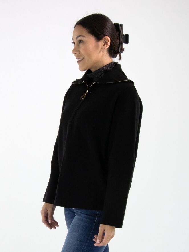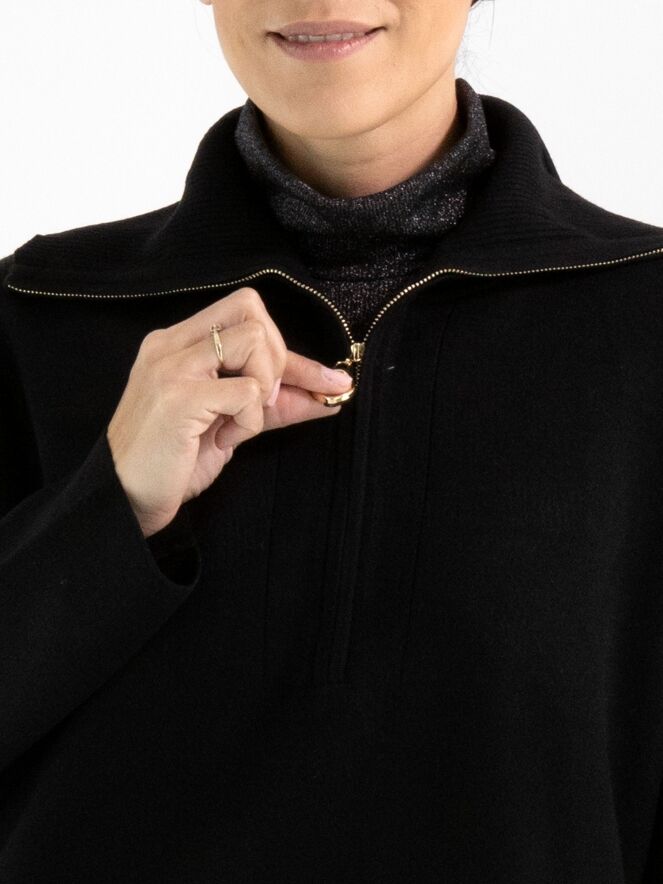 A pullover by Joseph Ribkoff in black. The draped collar features a finely ribbed texture. At the centre of the collar runs a concealed zip down to the bust. This pullover can be hand-washed.