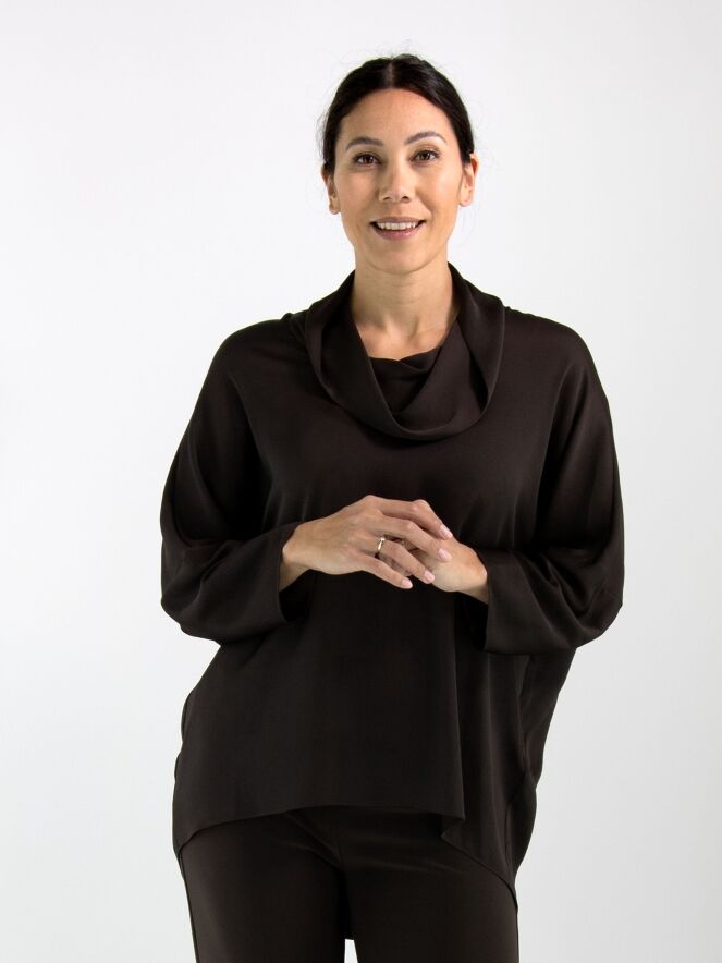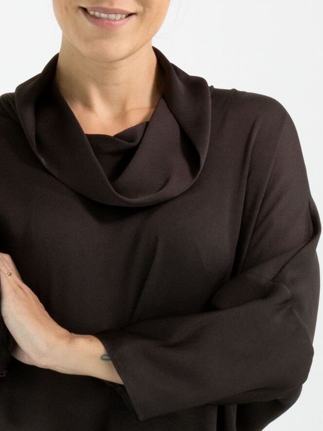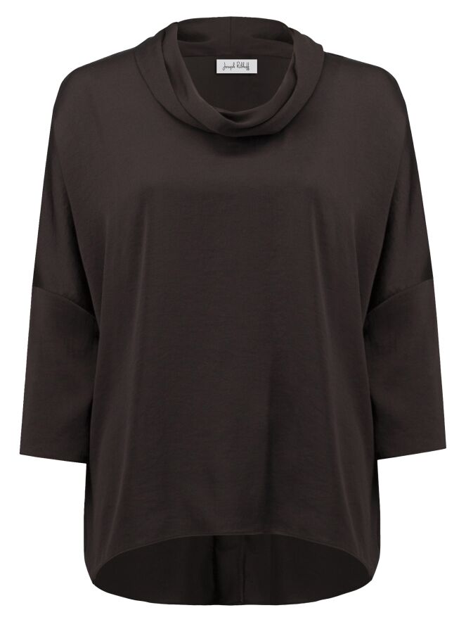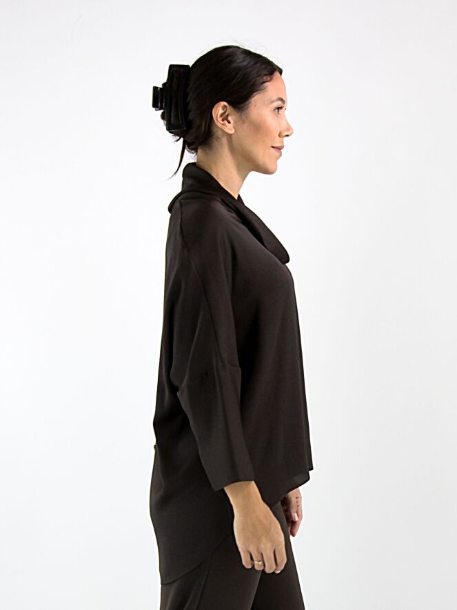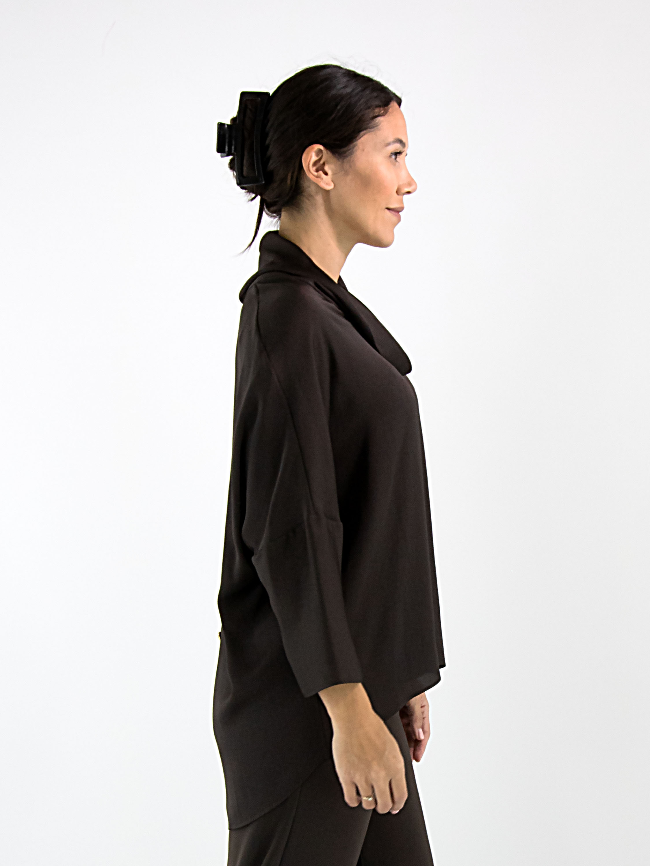 A matte satin shirt from Joseph Ribkoff in mocha brown. The design features a graceful draped collar and half-length sleeves, giving it a feminine and refined look. This shirt can be hand-washed.