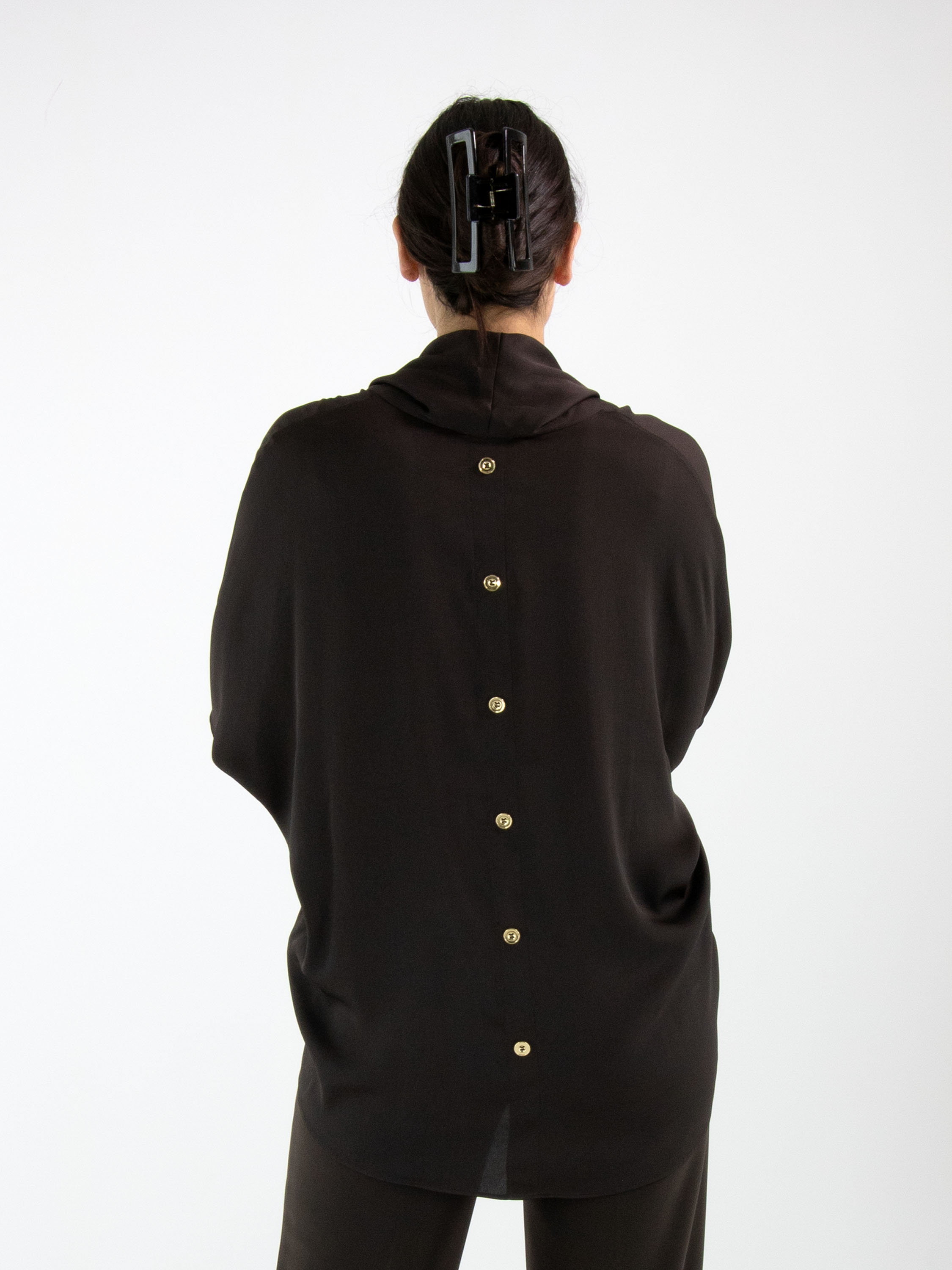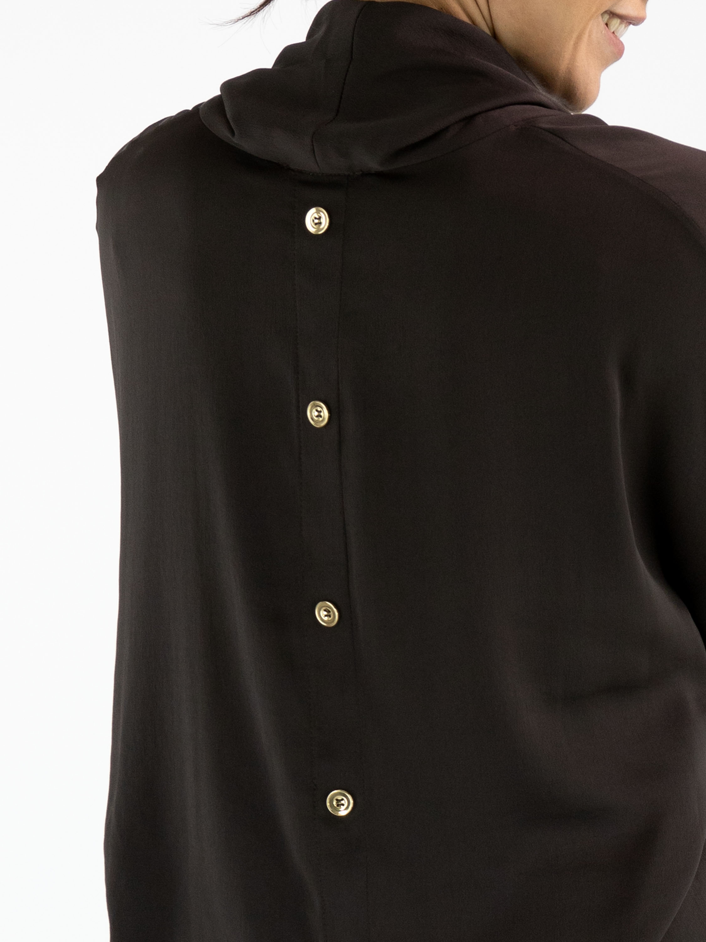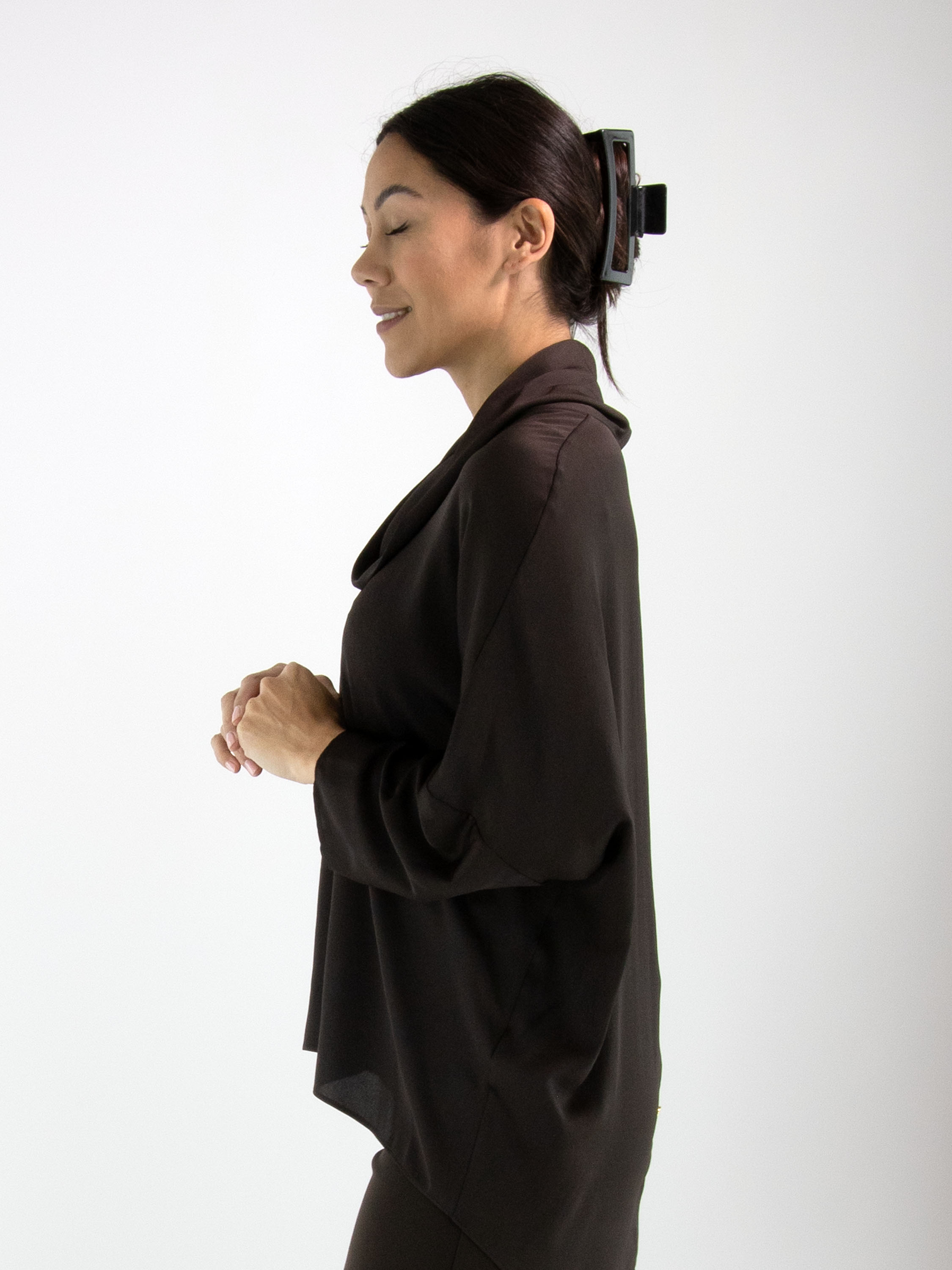 A matte satin shirt from Joseph Ribkoff in mocha brown. The design features a graceful draped collar and half-length sleeves, giving it a feminine and refined look. This shirt can be hand-washed.