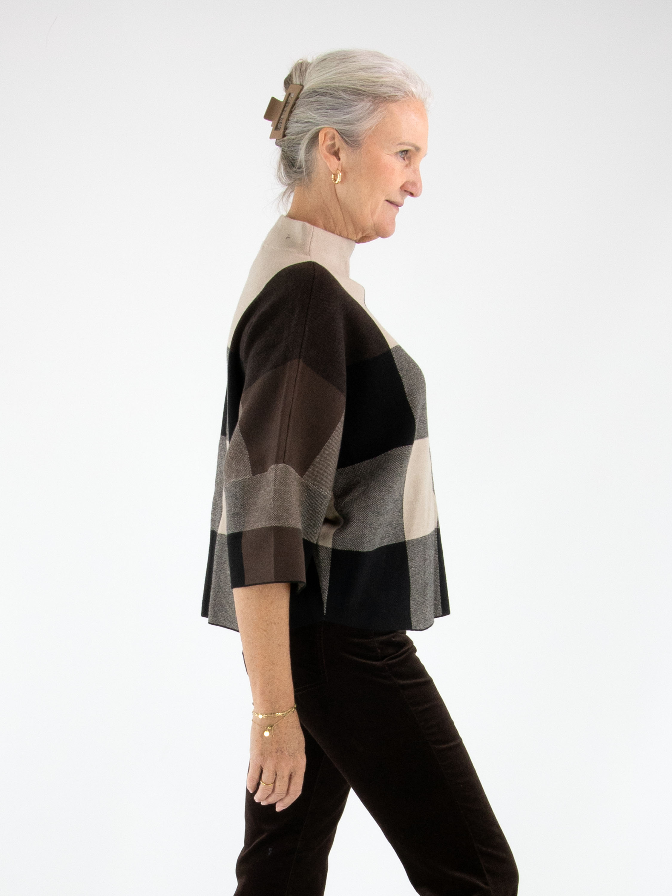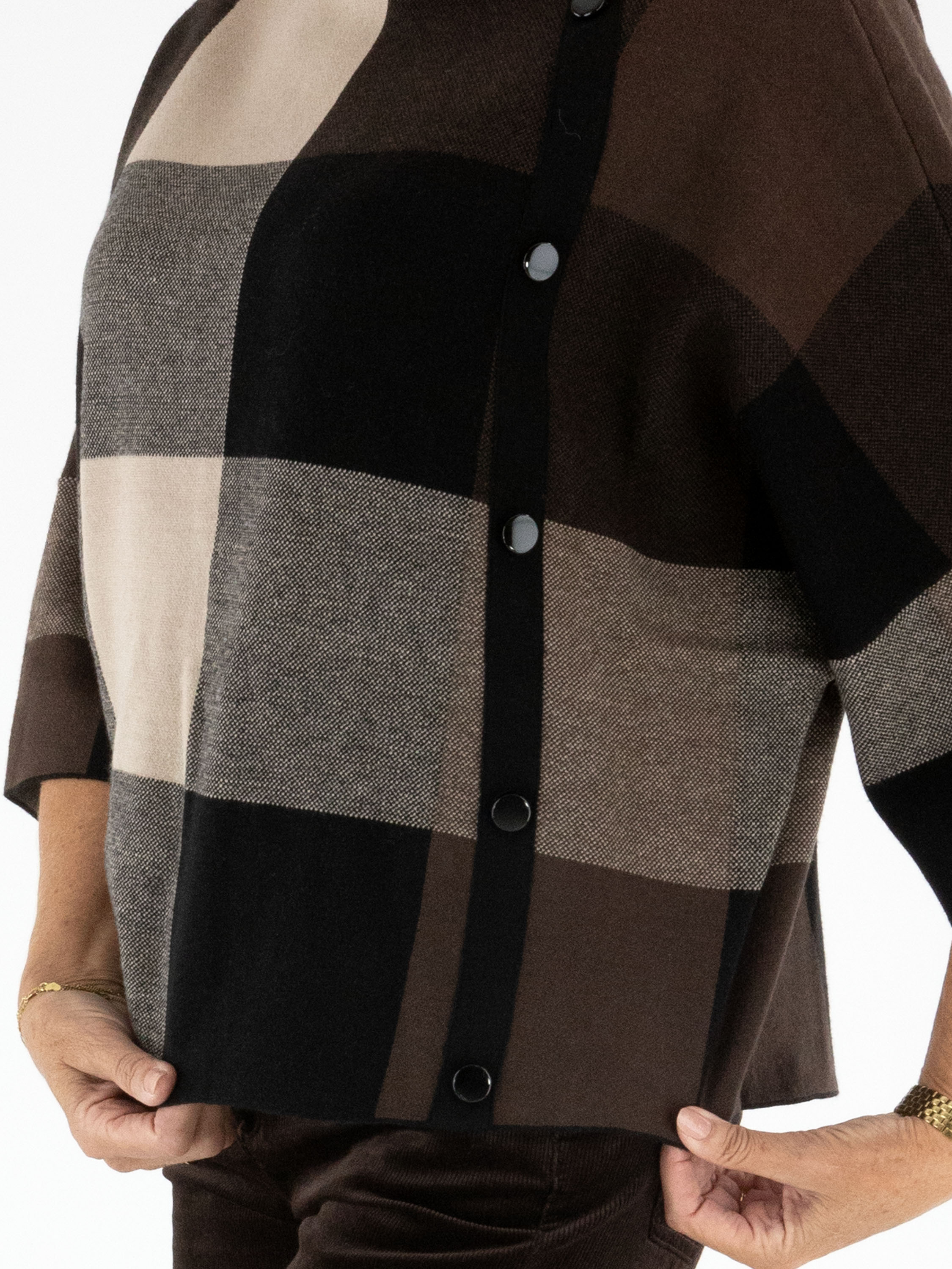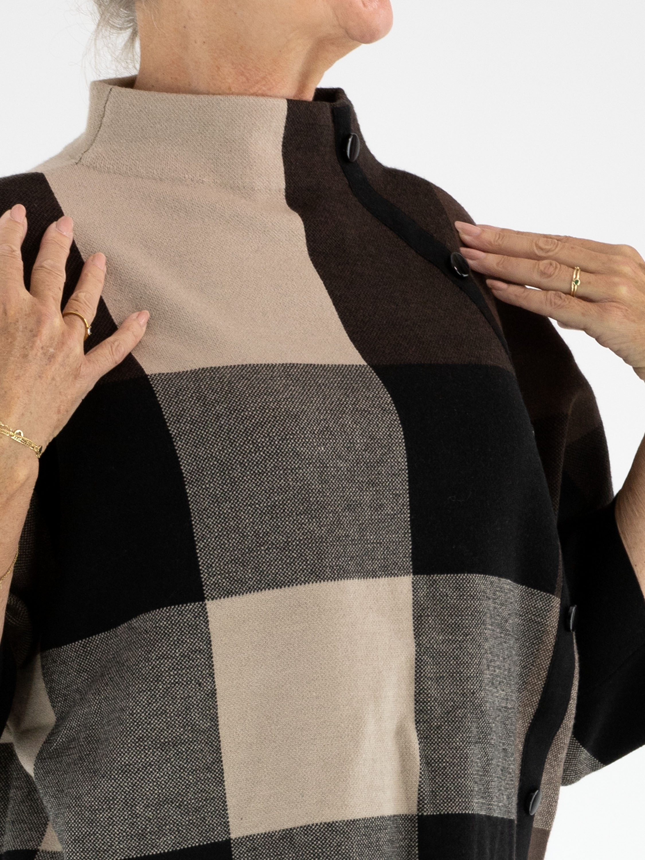 A pullover by Joseph Ribkoff in a block pattern with various shades of brown. The pullover features batwing sleeves and decorative large glossy black buttons running down the left side from the neckline. This pullover can be hand-washed.