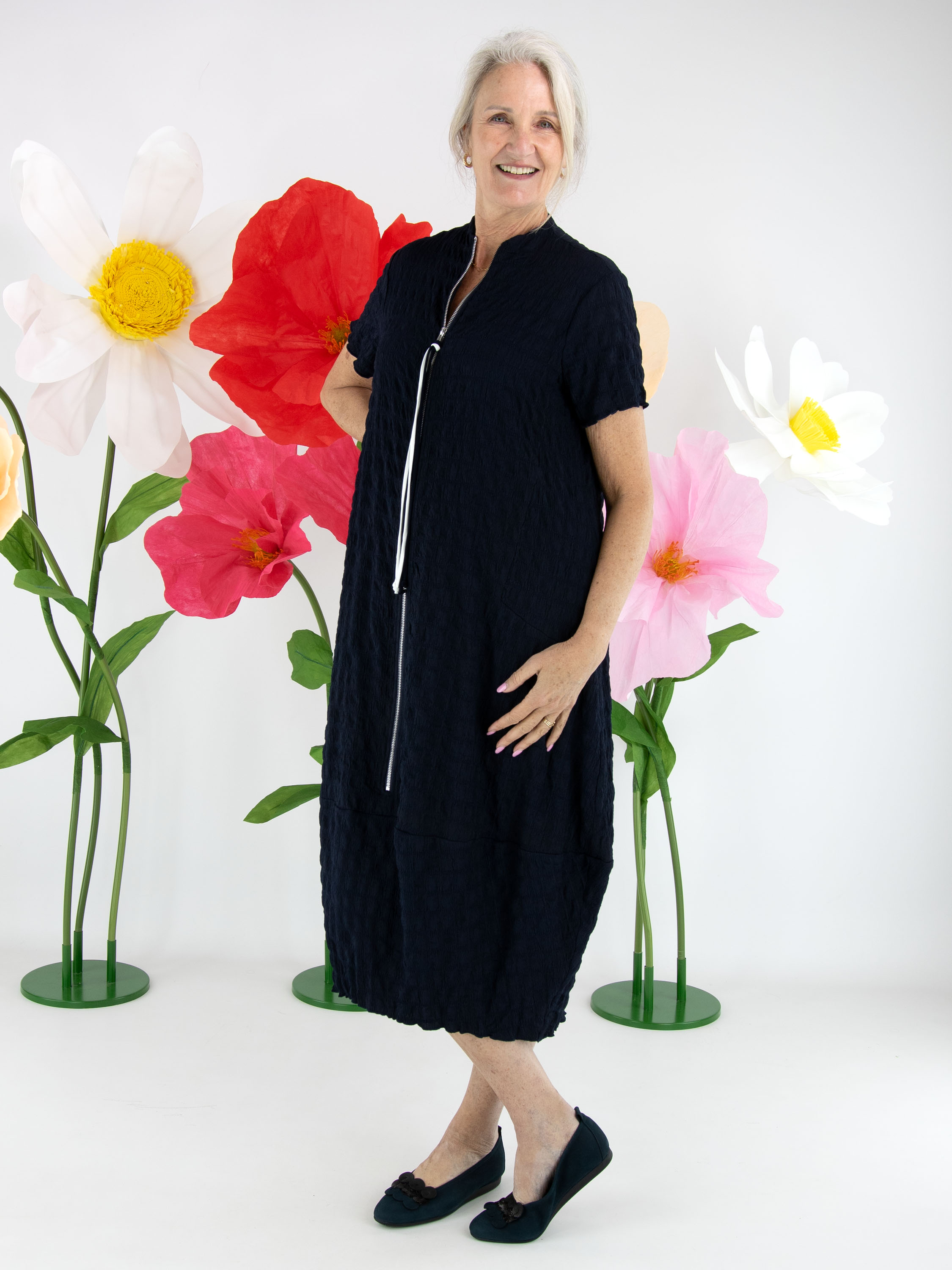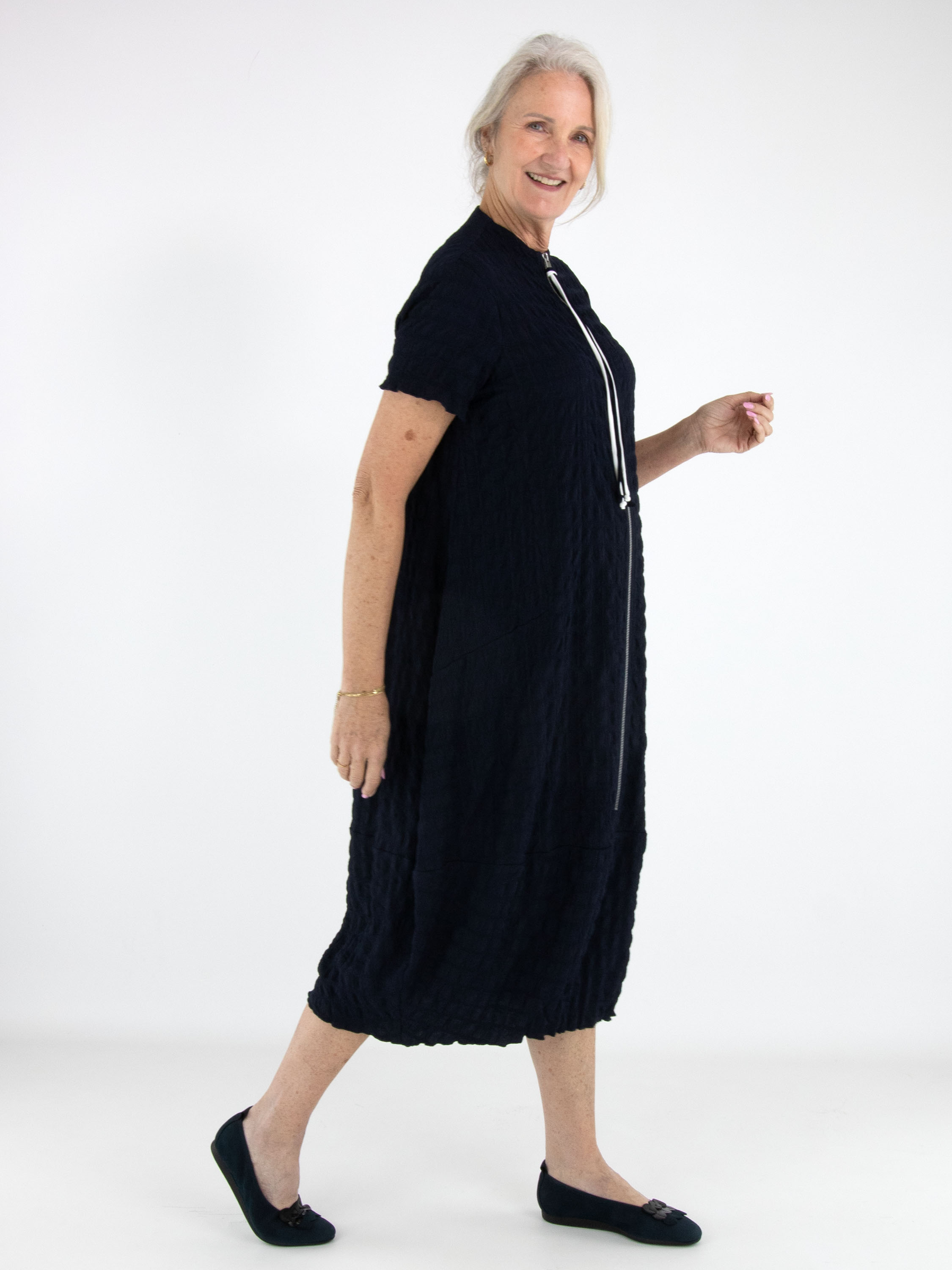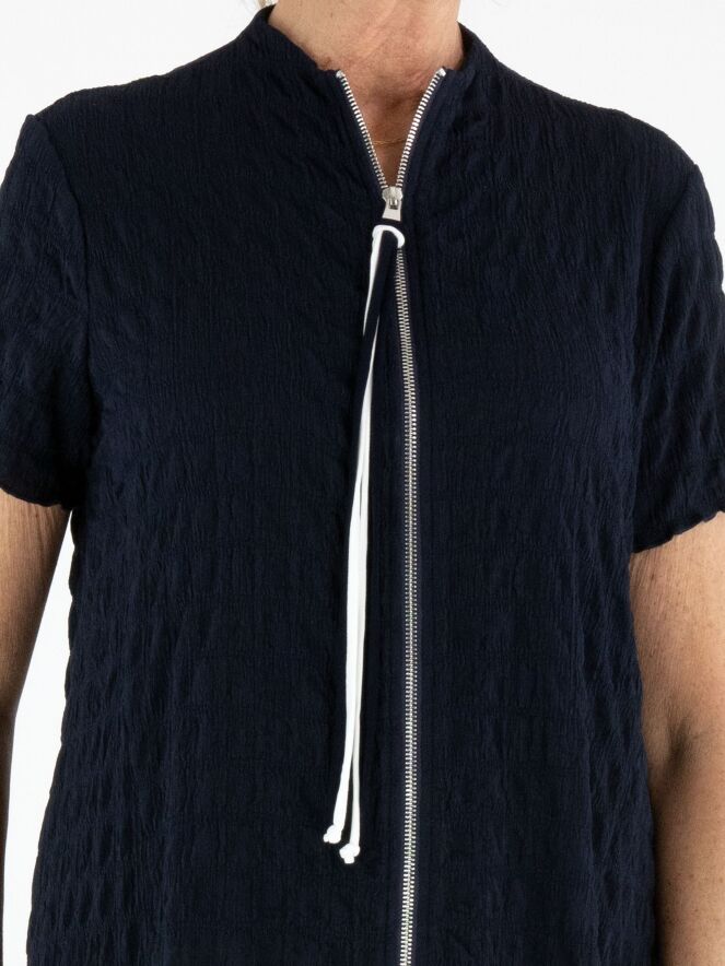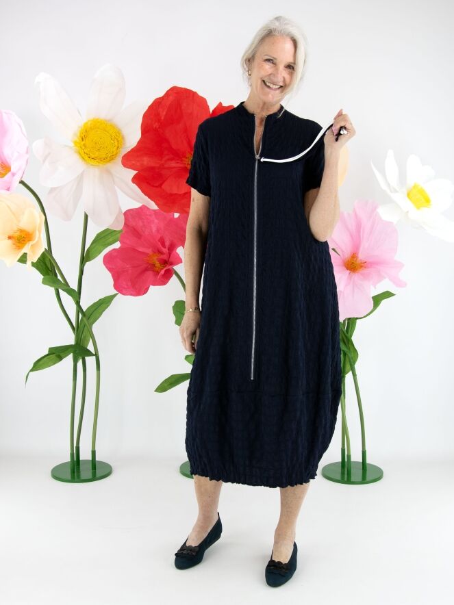 A Joseph Ribkoff dress featuring a checkered smocked structure in a deep navy blue shade. A silver-toned zipper runs from the high, close-fitting neckline down to the knee, adding a modern edge. The dress is tailored for a flattering silhouette and should be hand washed.