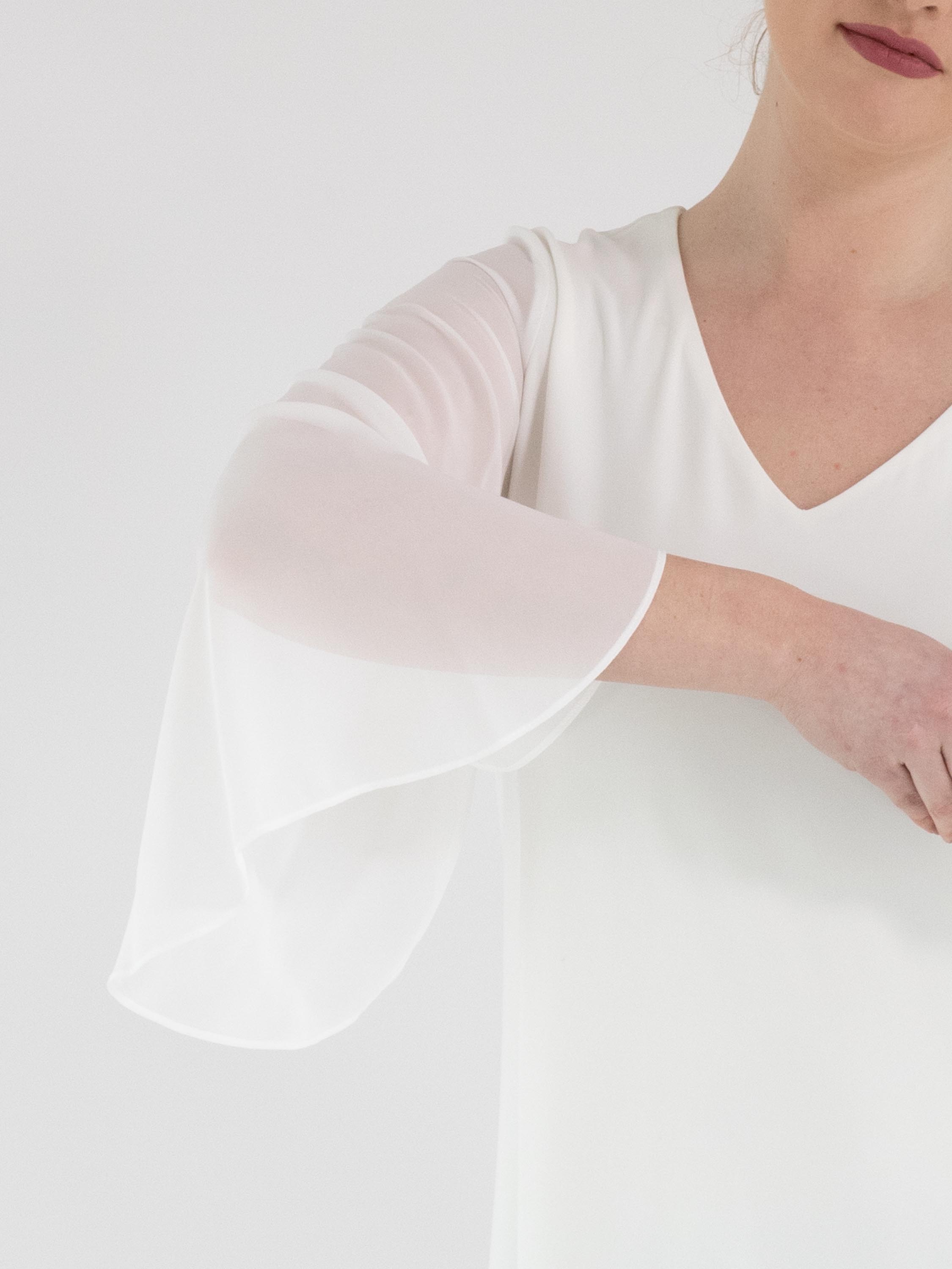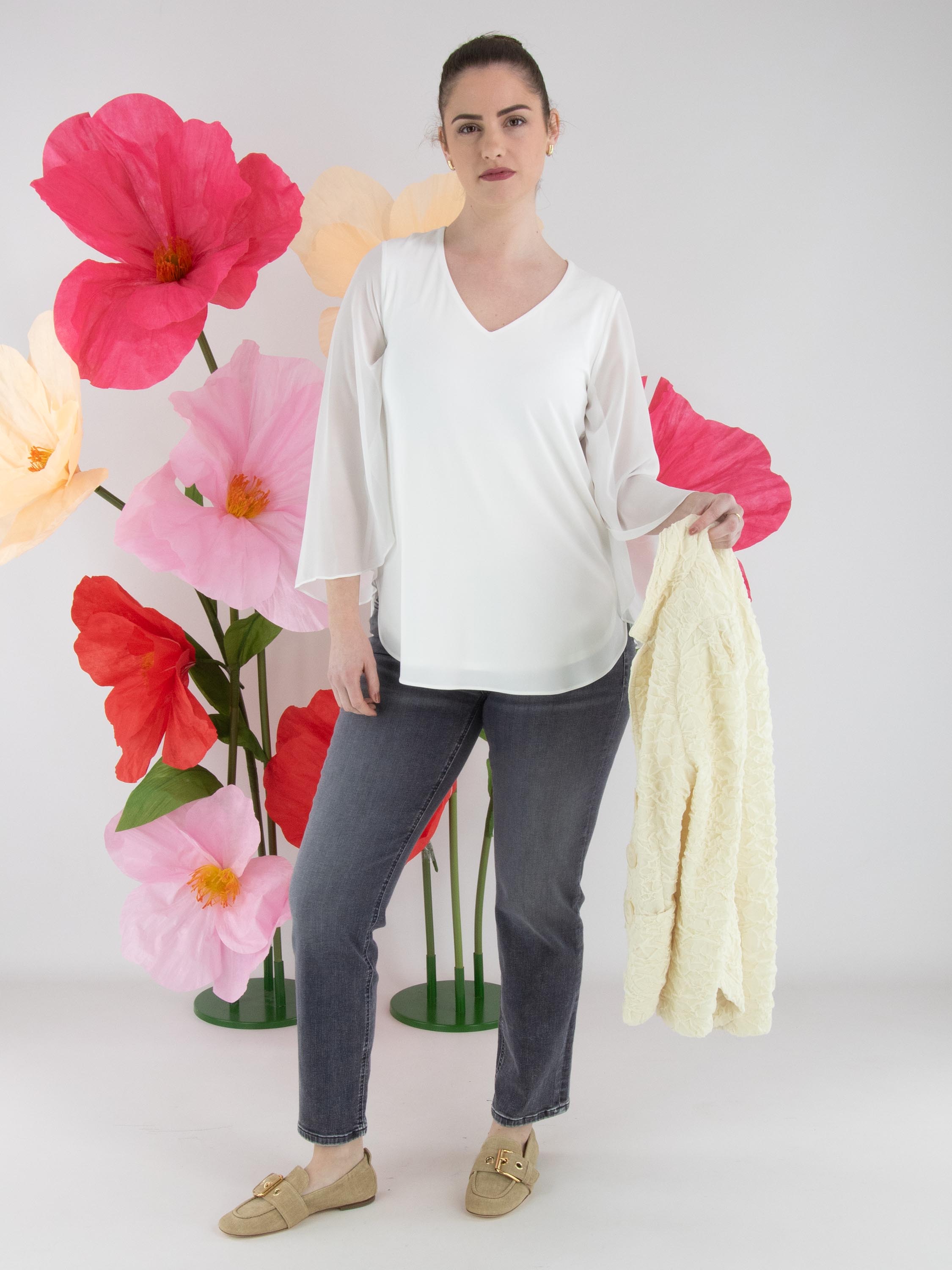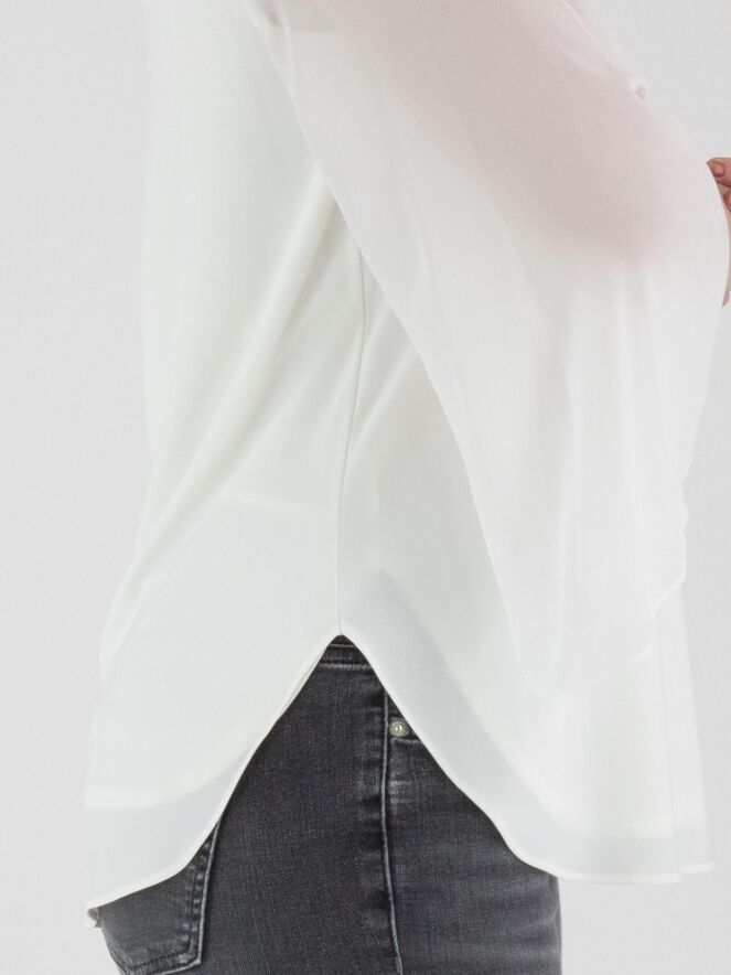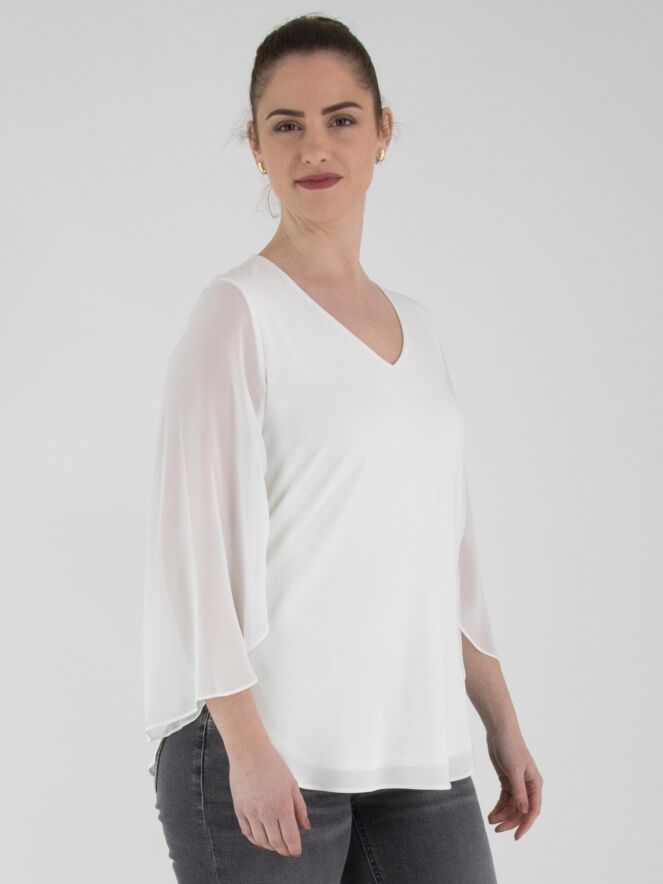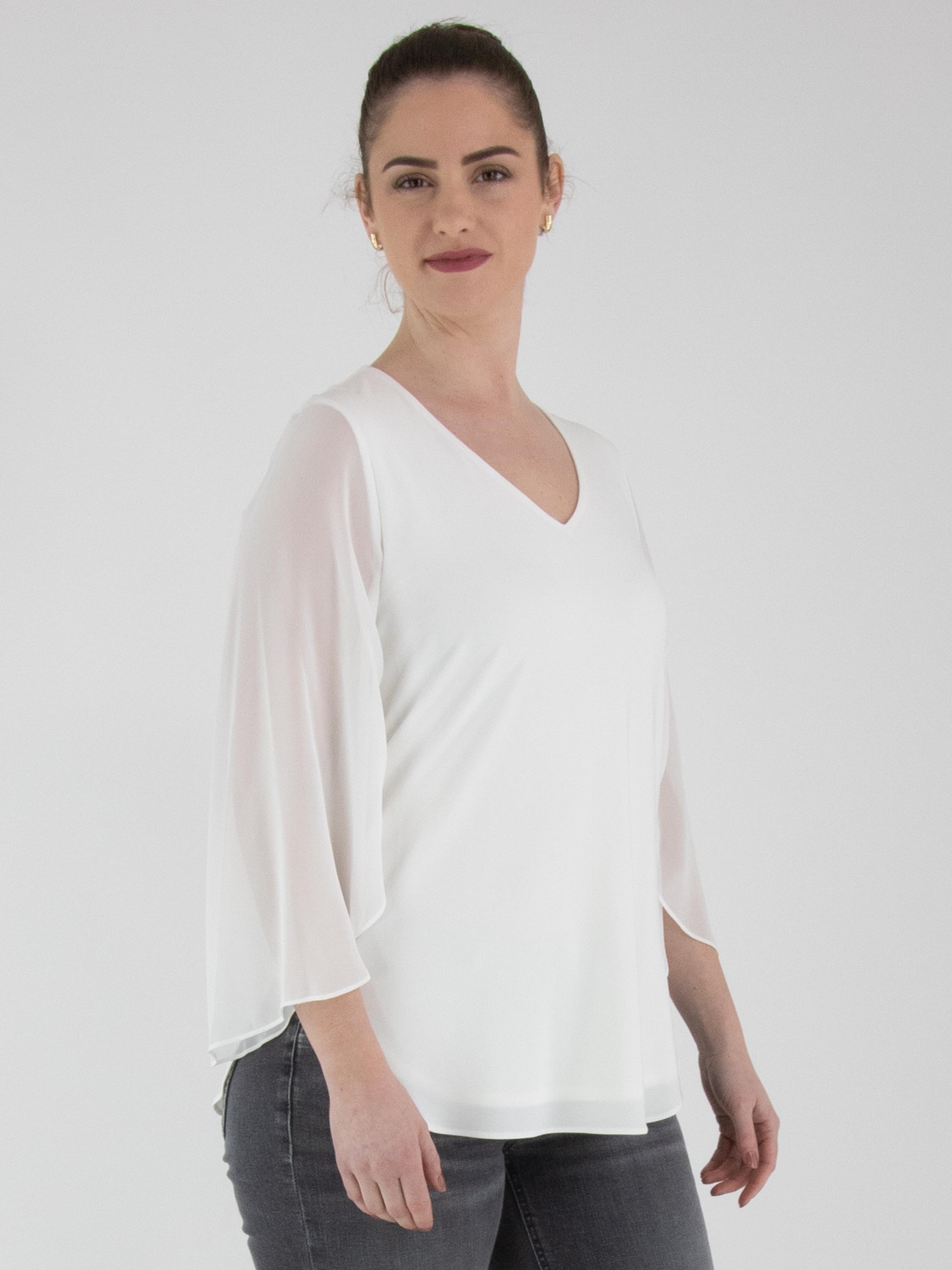 A shirt by Joseph Ribkoff in cream white. The shirt features a double-layer construction, with the top layer being transparent. The half-length sleeves are made of voile and have a slit at the lower side extending to the armhole. The shirt has a V-neckline and can be hand-washed.