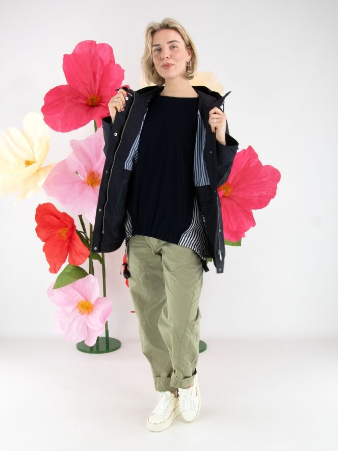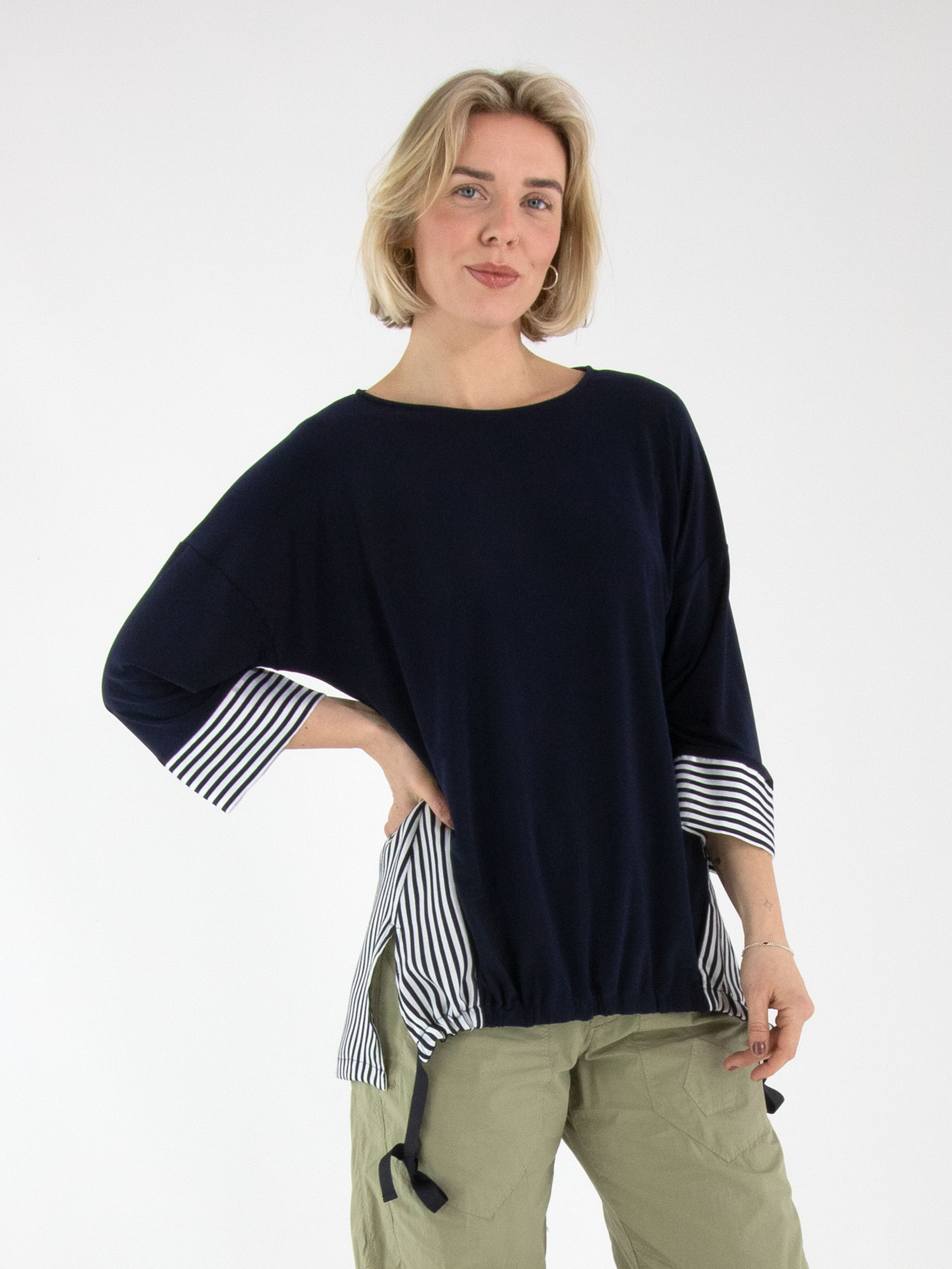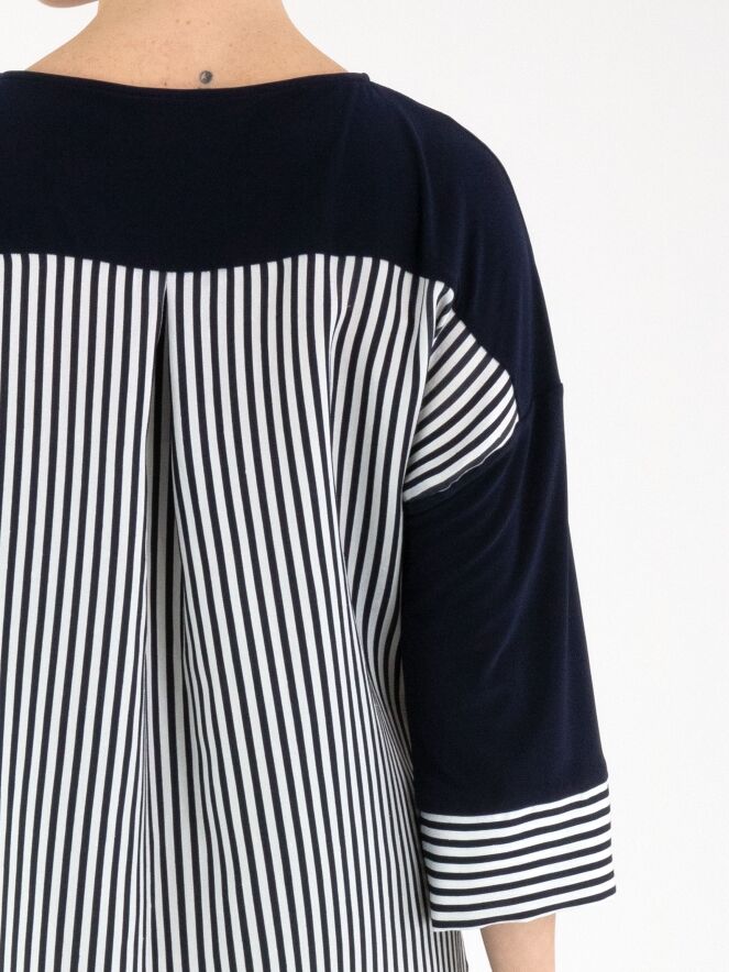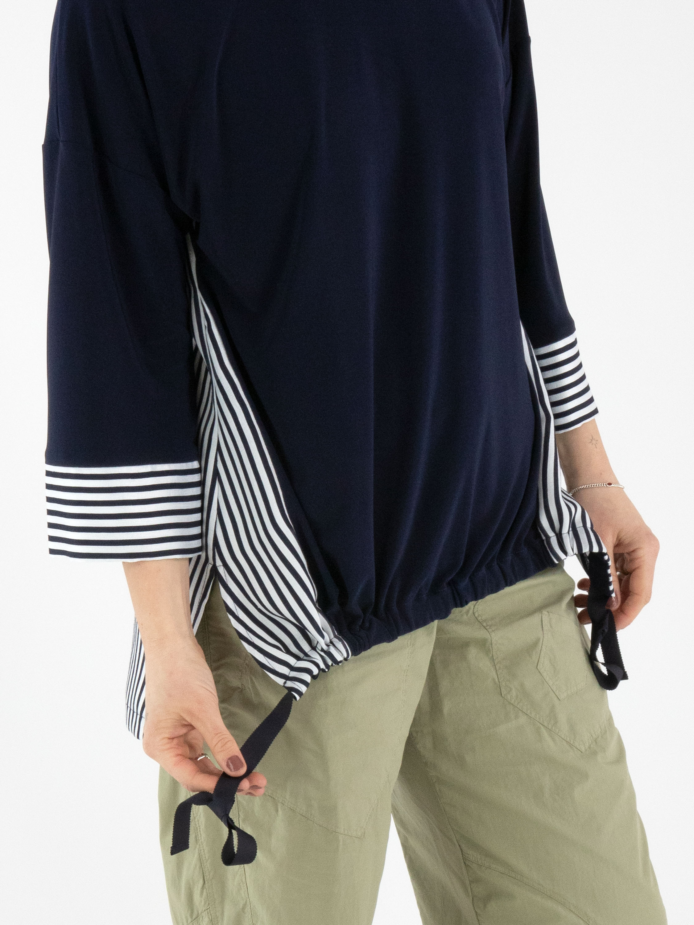 A shirt by Joseph Ribkoff featuring a solid navy fabric at the front and a striped fabric in cream white and navy at the back. The cuffs of the half-length sleeves are also made from the striped fabric. Along the front hem, a drawstring in a tunnel design allows a pleated effect to be created. This shirt can be hand-washed.