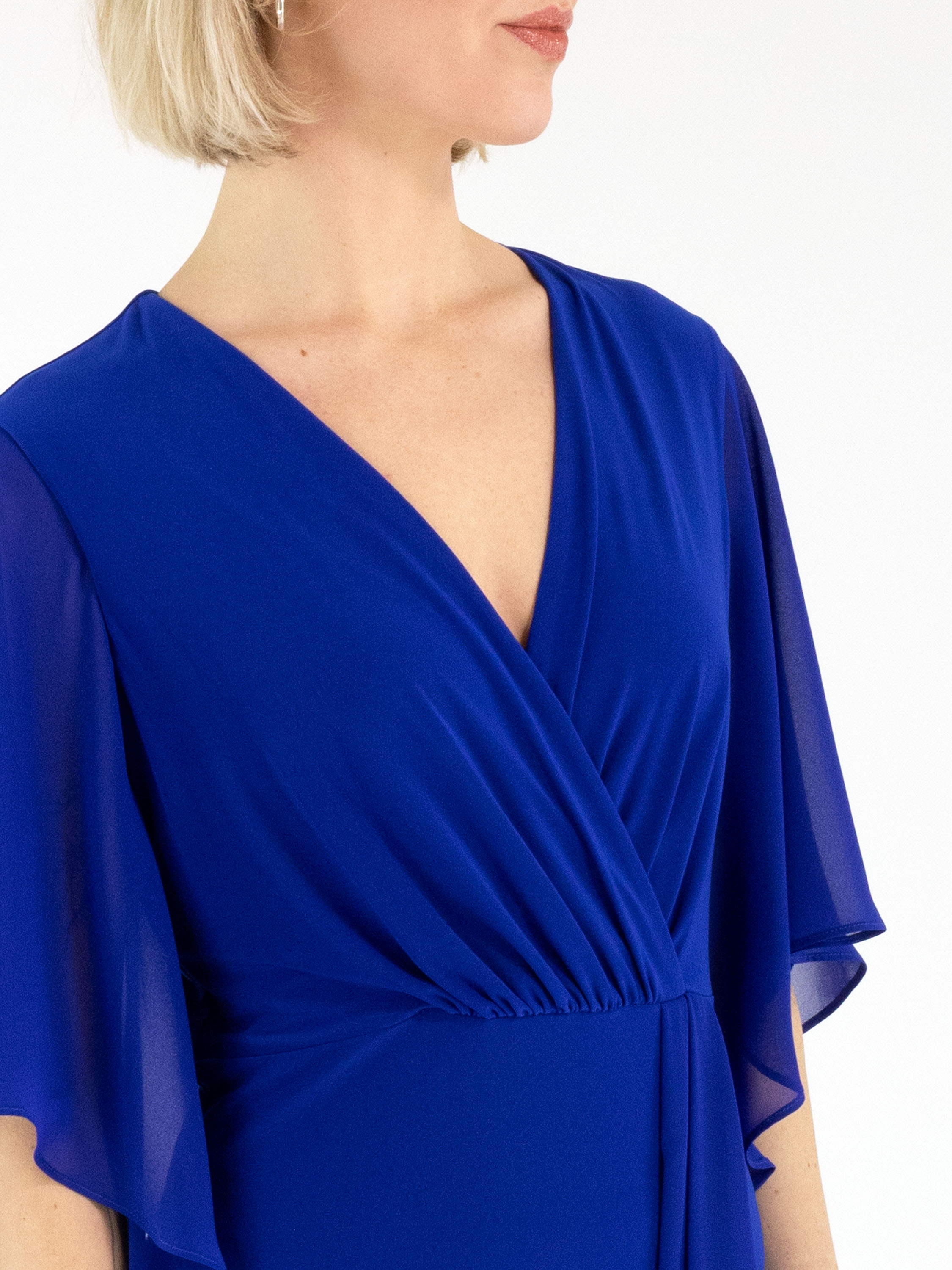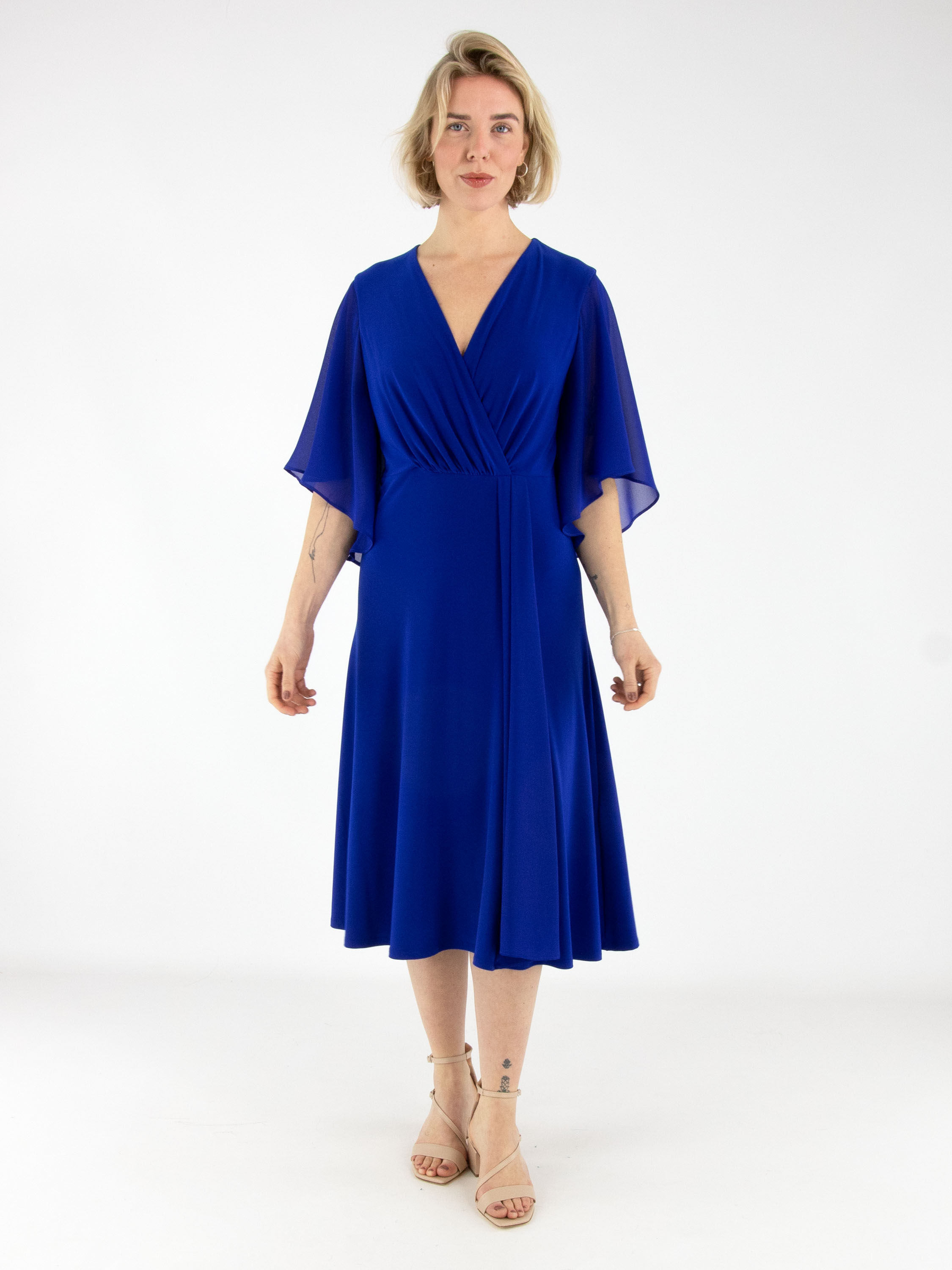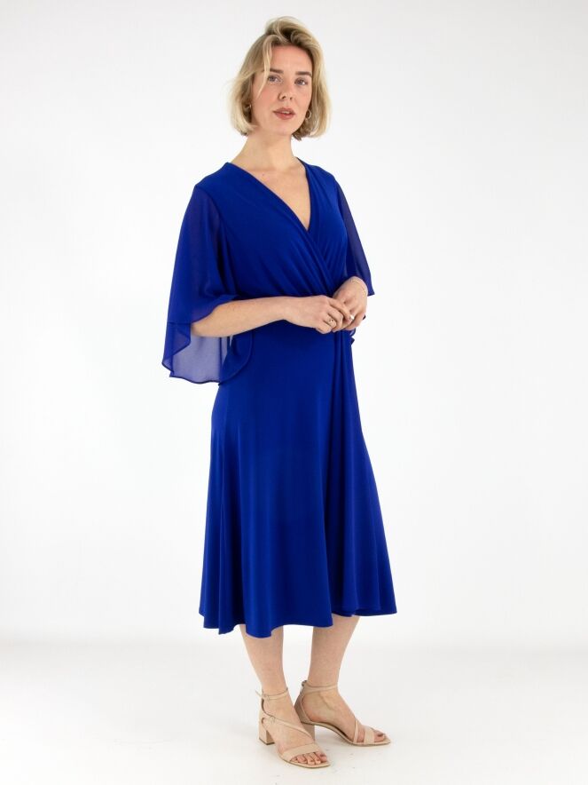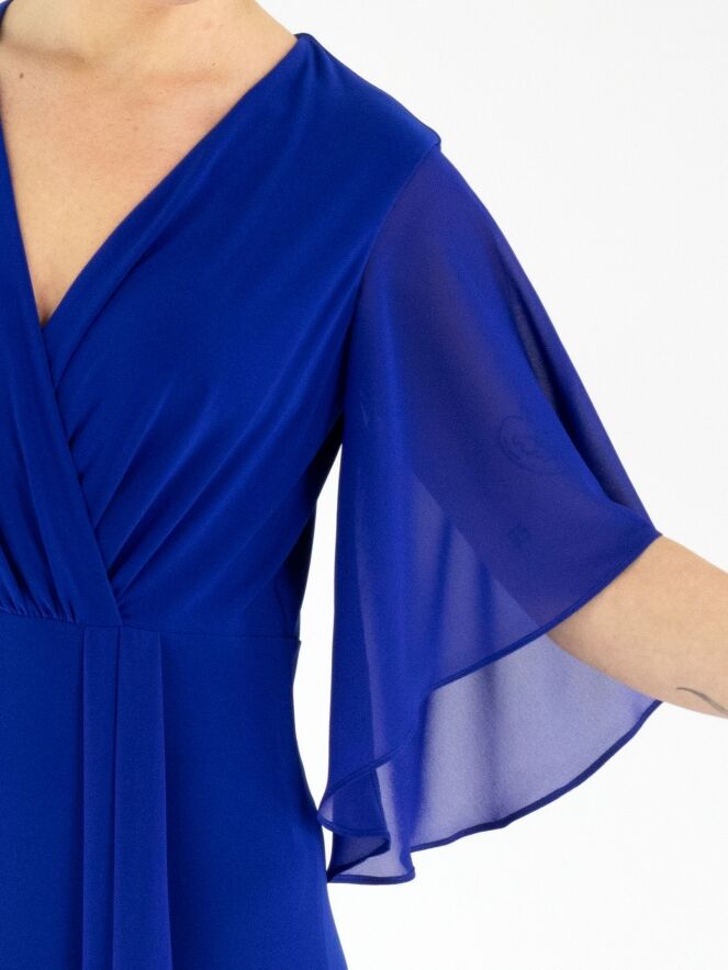 A wrap dress by Joseph Ribkoff in a cobalt blue shade. From the waist, the fabric is delicately pleated towards the neckline. On the left side of the centre, several pleats run downward. The dress features short, wide voile sleeves. This dress can be hand-washed.