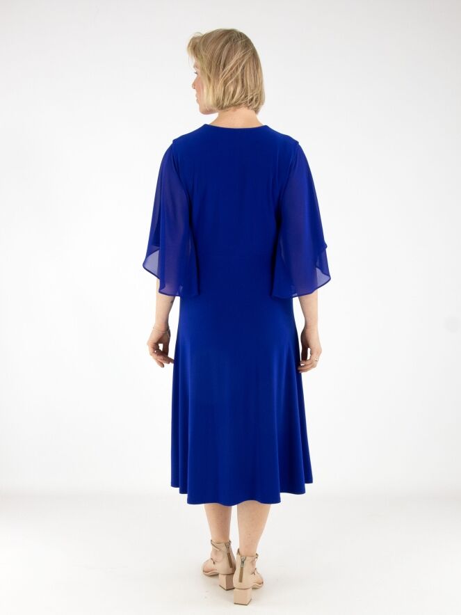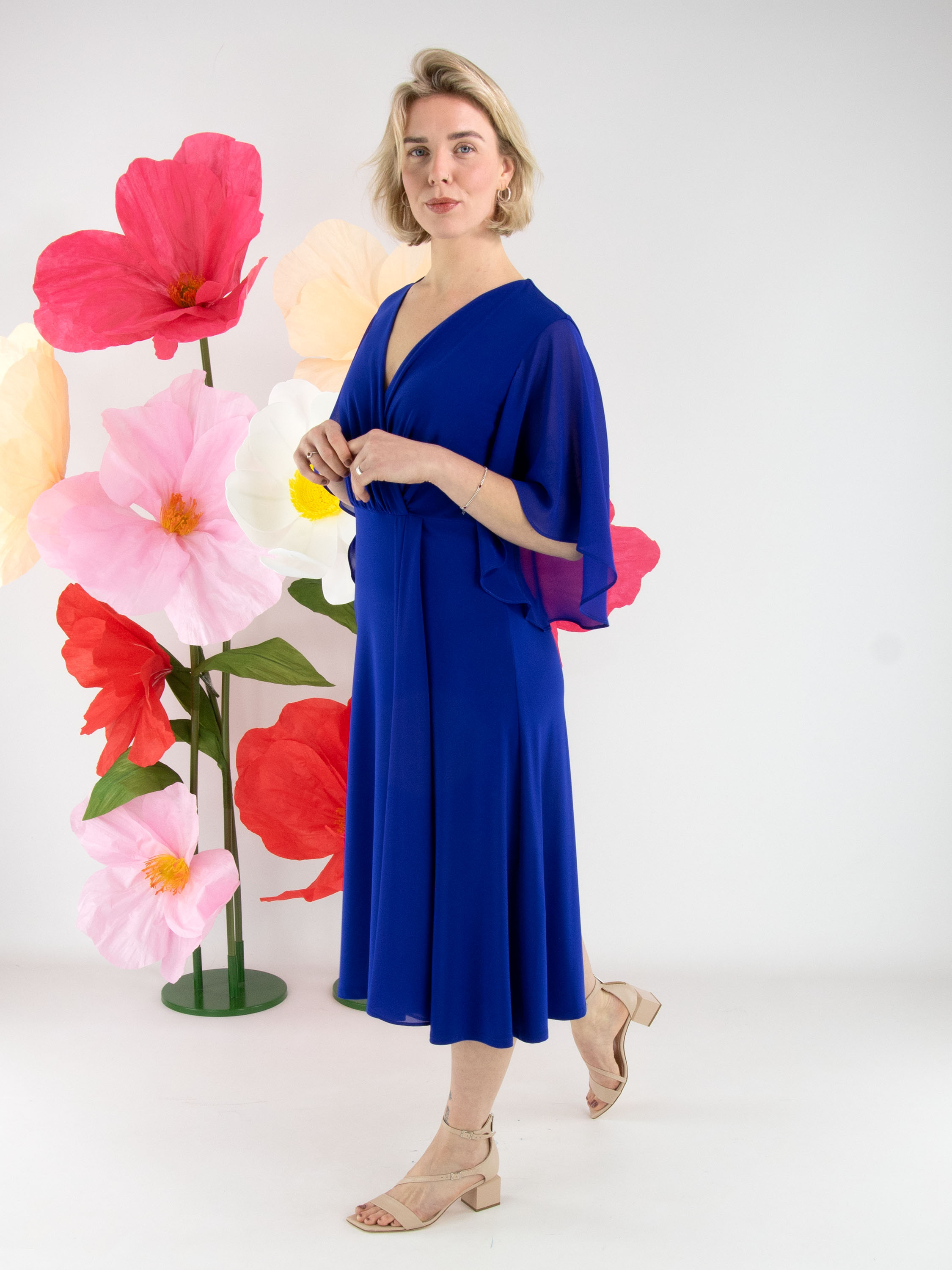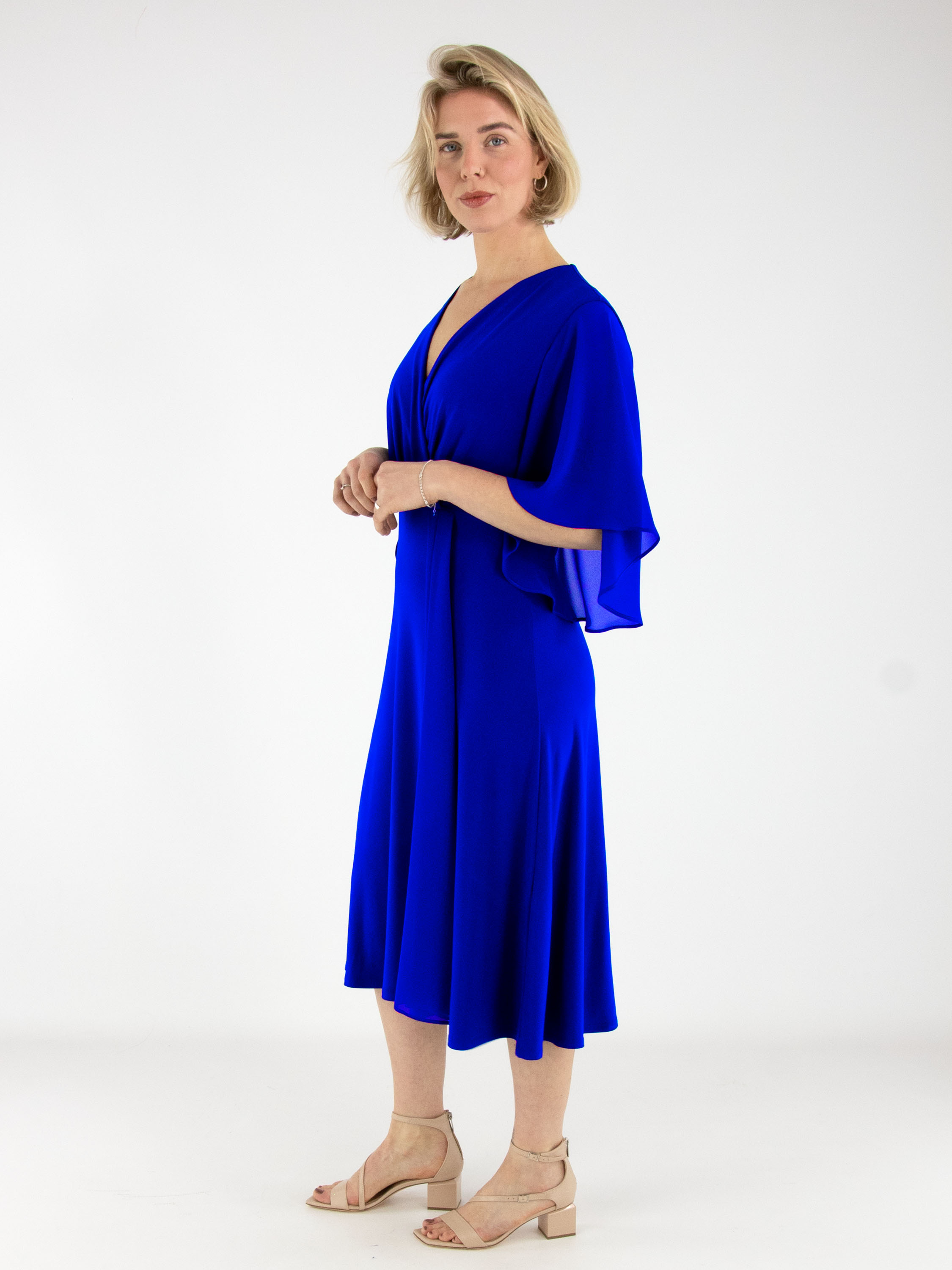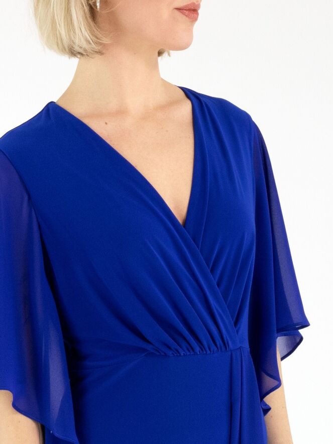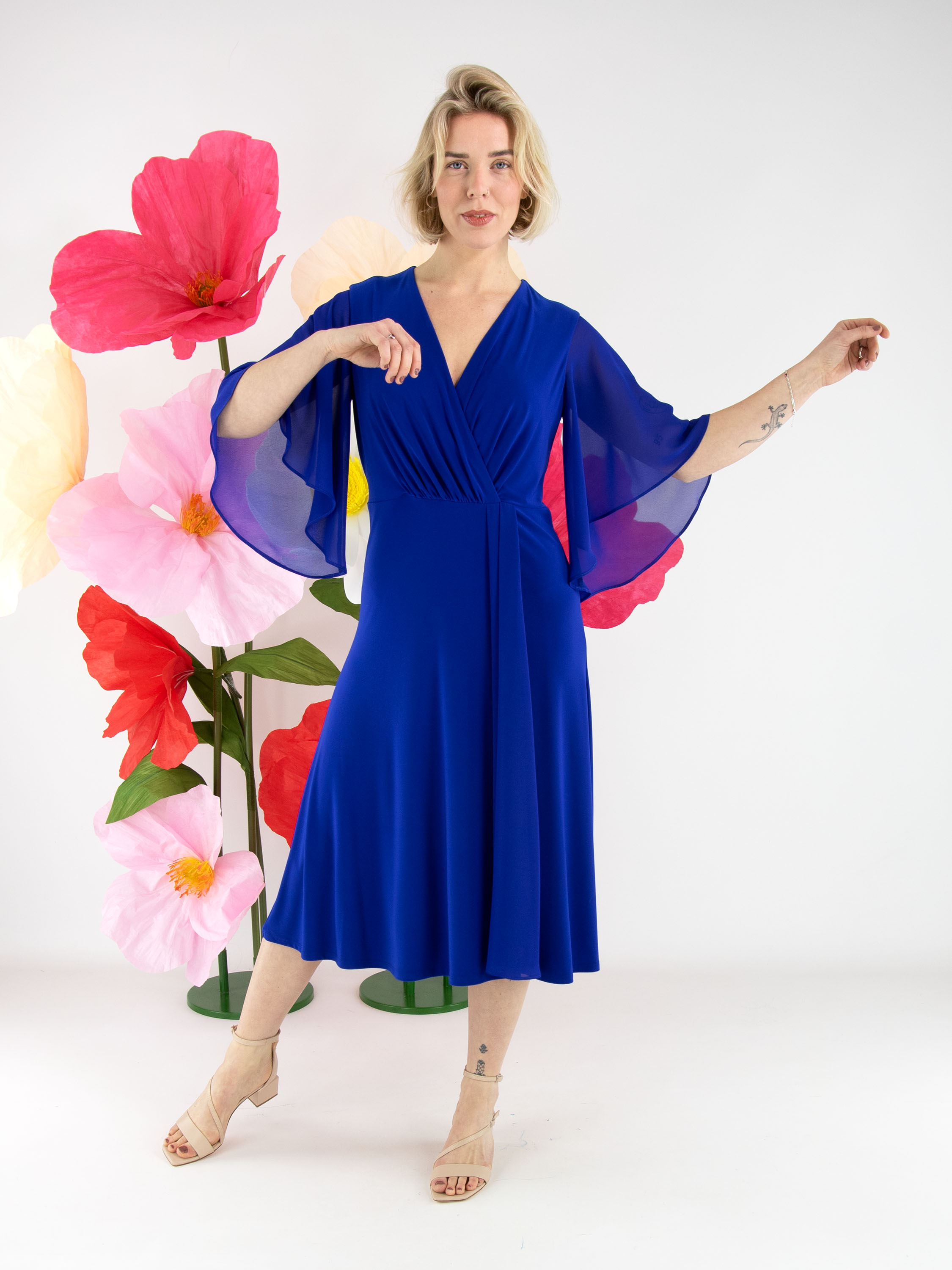 A wrap dress by Joseph Ribkoff in a cobalt blue shade. From the waist, the fabric is delicately pleated towards the neckline. On the left side of the centre, several pleats run downward. The dress features short, wide voile sleeves. This dress can be hand-washed.