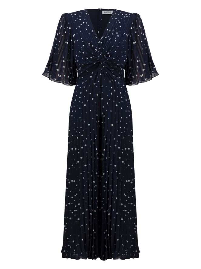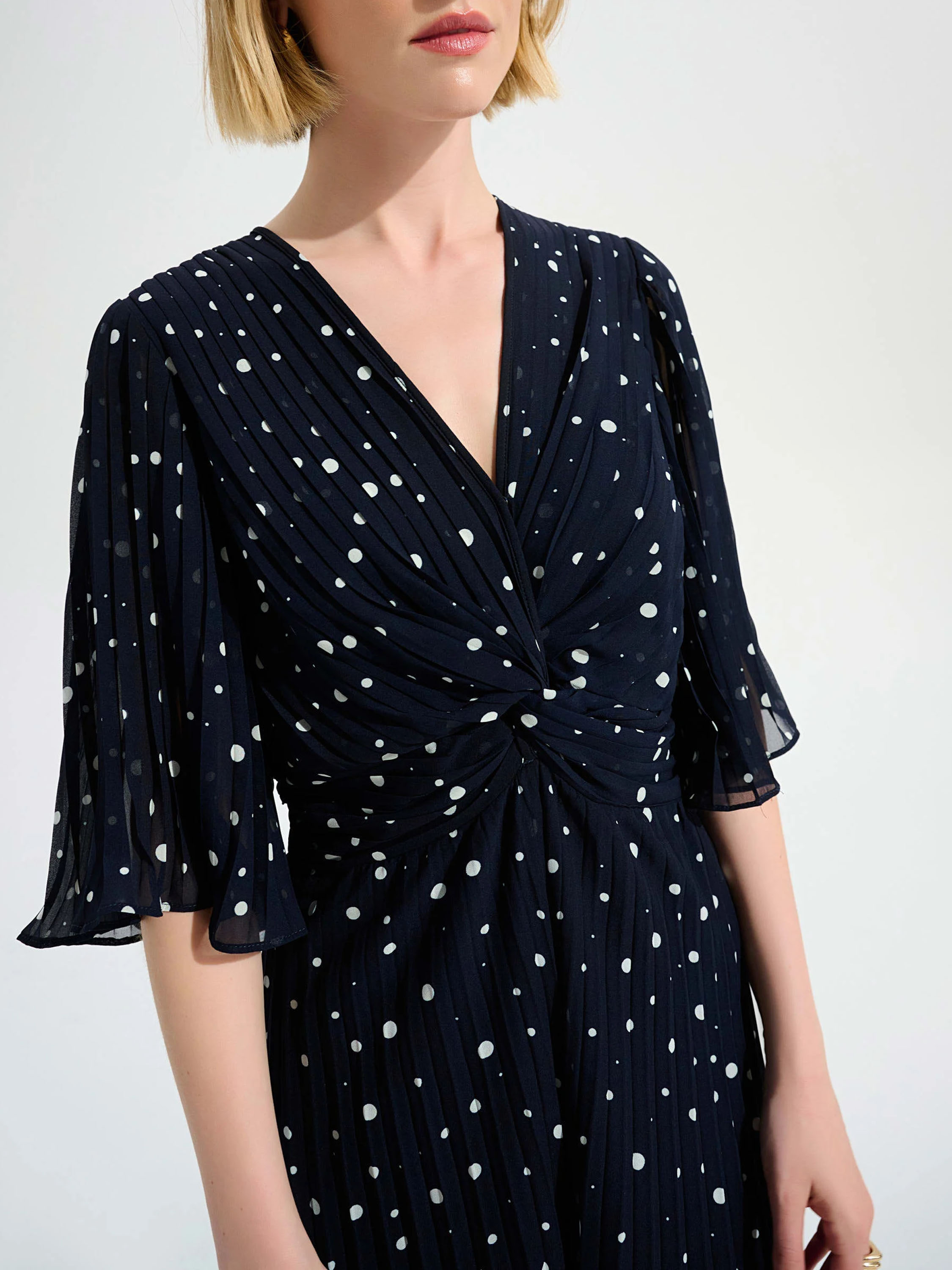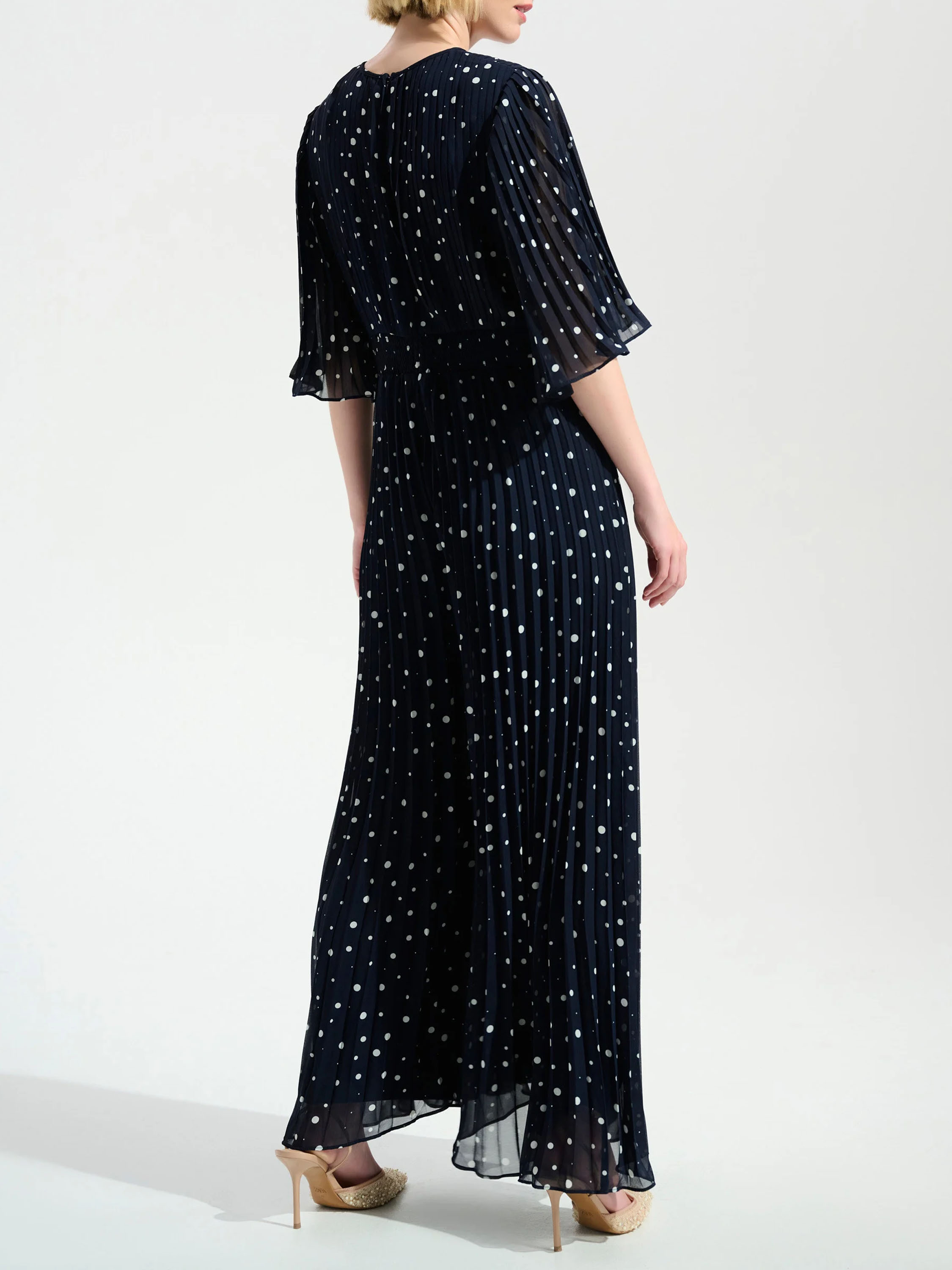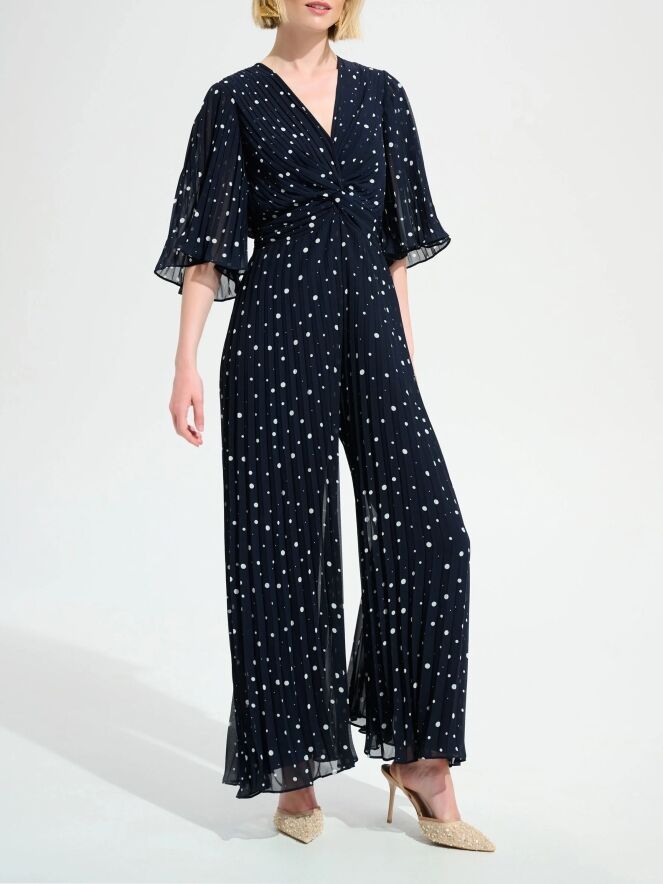 A jumpsuit by Joseph Ribkoff featuring a navy and white polka dot print. The fabric is pleated. The lower part of the V-neckline is designed as an overlapping detail that extends from this point towards the sides of the waist. The short sleeves are made of voile and flare out softly. At the back, a zip fastening runs from the neckline to the waist, where a wide elastic band is applied. This jumpsuit can be hand-washed.