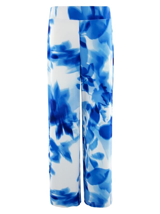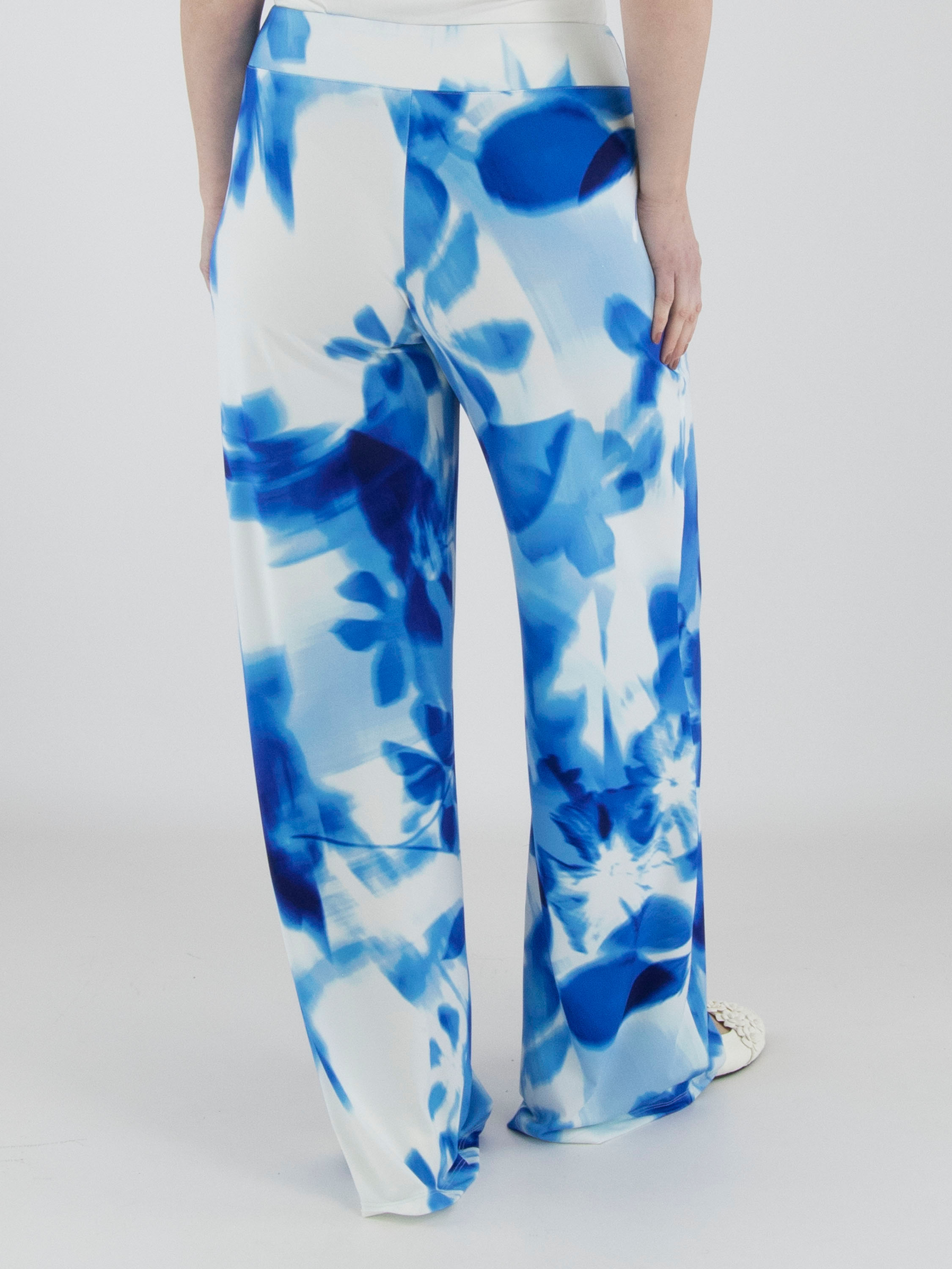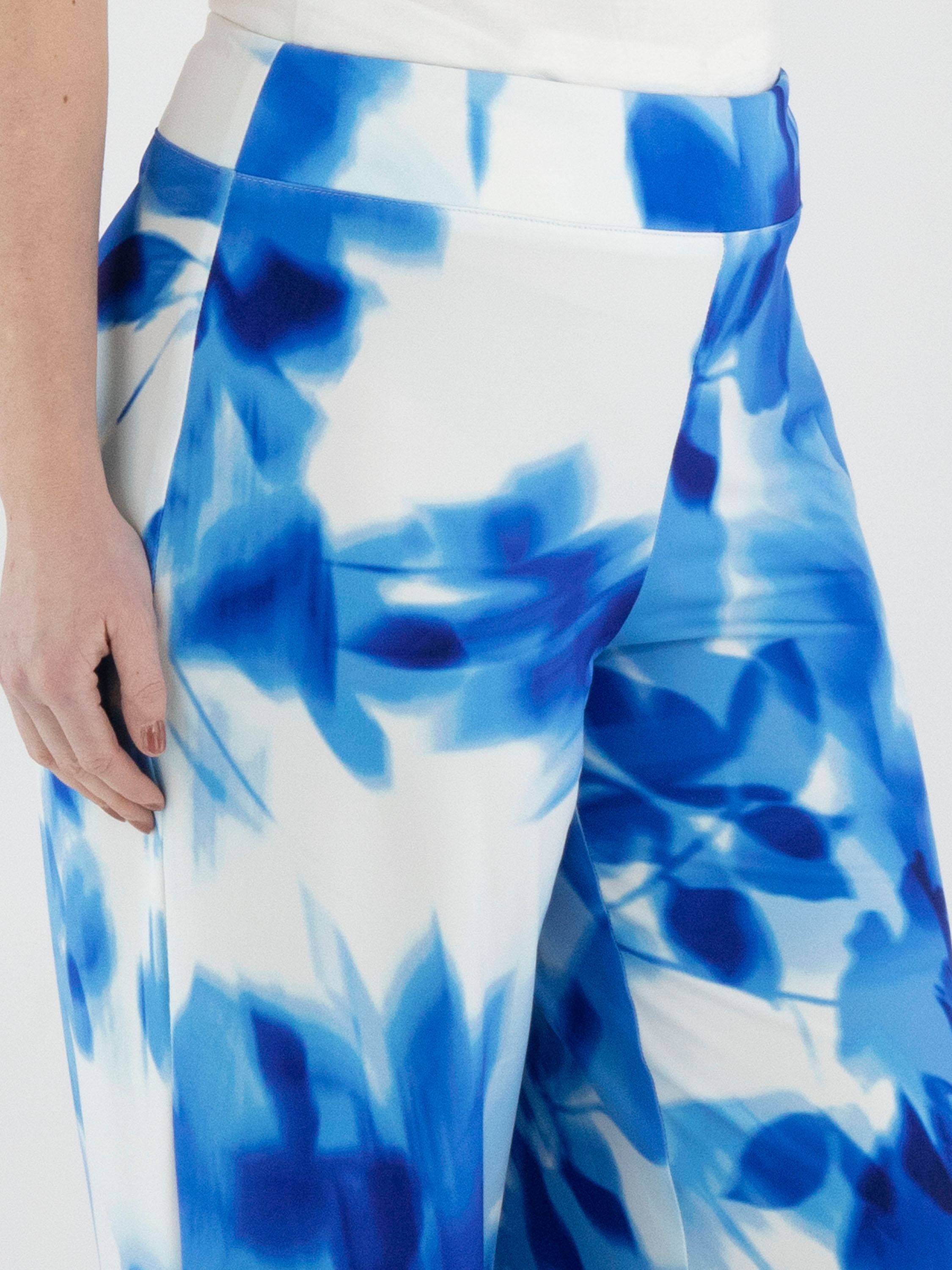 A wrap top from Joseph Ribkoff in a graphic print with various shades of bright blue and white. At the waist, where the wrap is incorporated into the seam, the fabric is finely pleated. The elbow-length sleeves are made from a transparent fabric and feature a slit up to the sleeve insertion. The hem is cut diagonally. This top can be hand-washed.