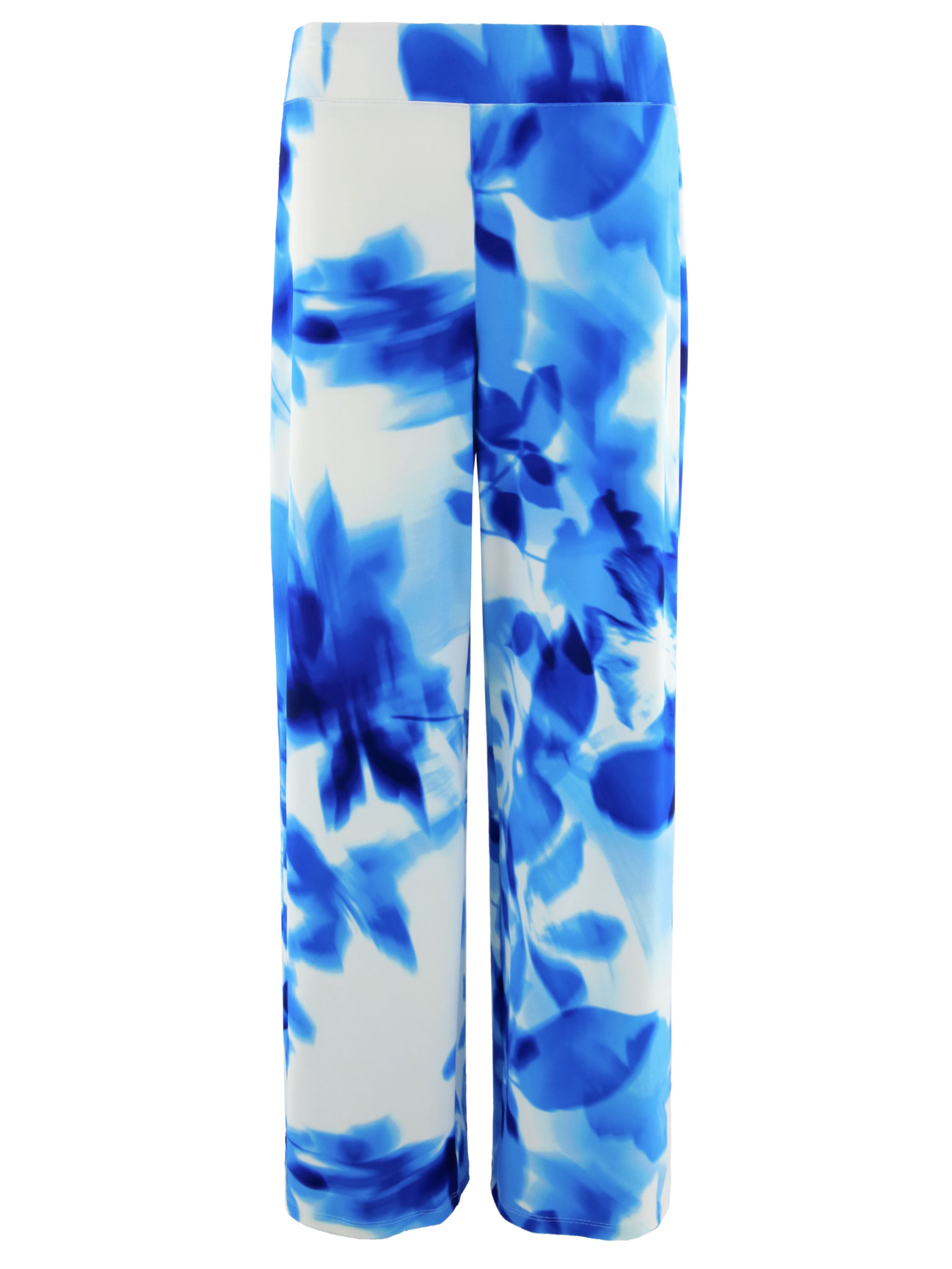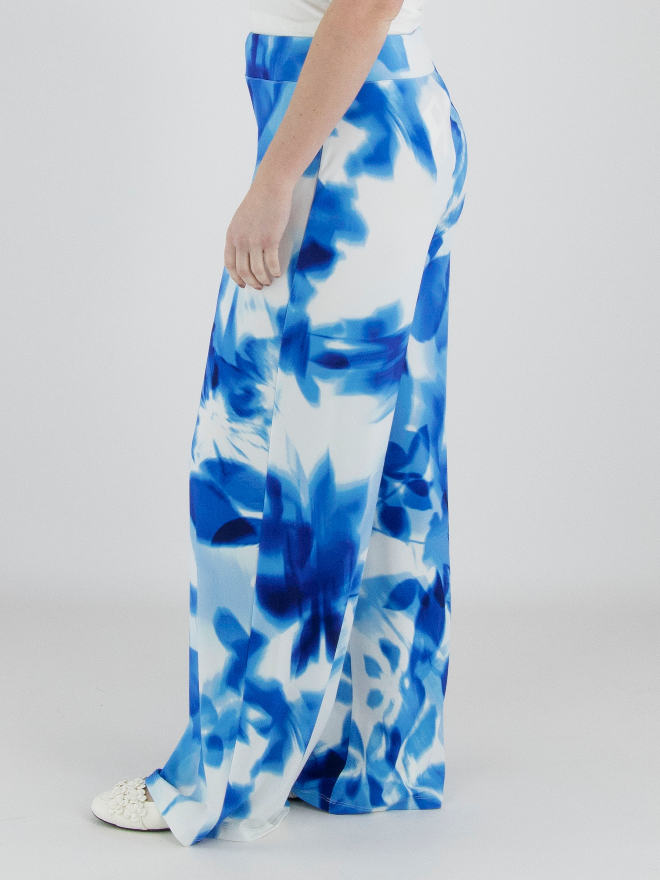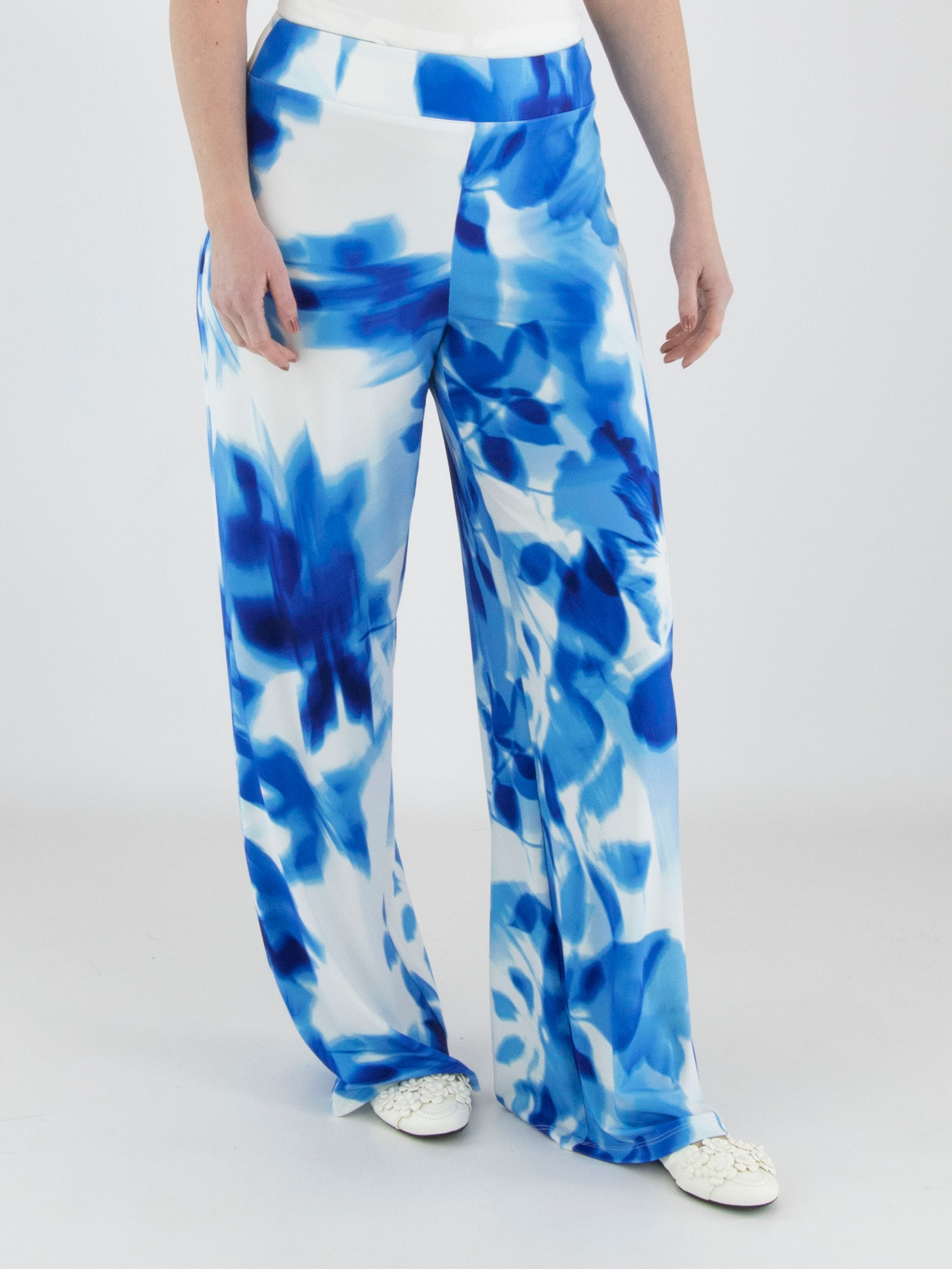 A wrap top from Joseph Ribkoff in a graphic print with various shades of bright blue and white. At the waist, where the wrap is incorporated into the seam, the fabric is finely pleated. The elbow-length sleeves are made from a transparent fabric and feature a slit up to the sleeve insertion. The hem is cut diagonally. This top can be hand-washed.
