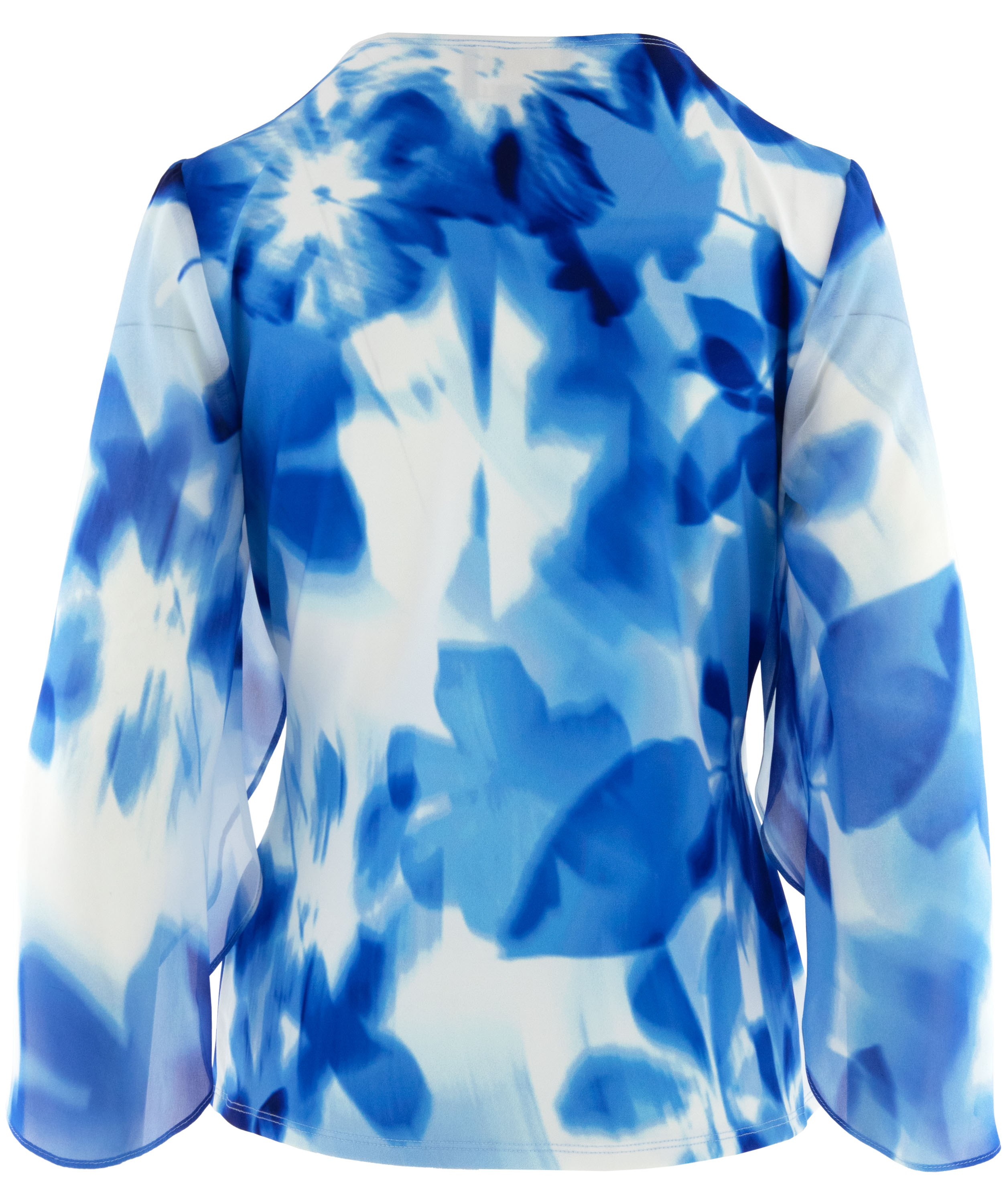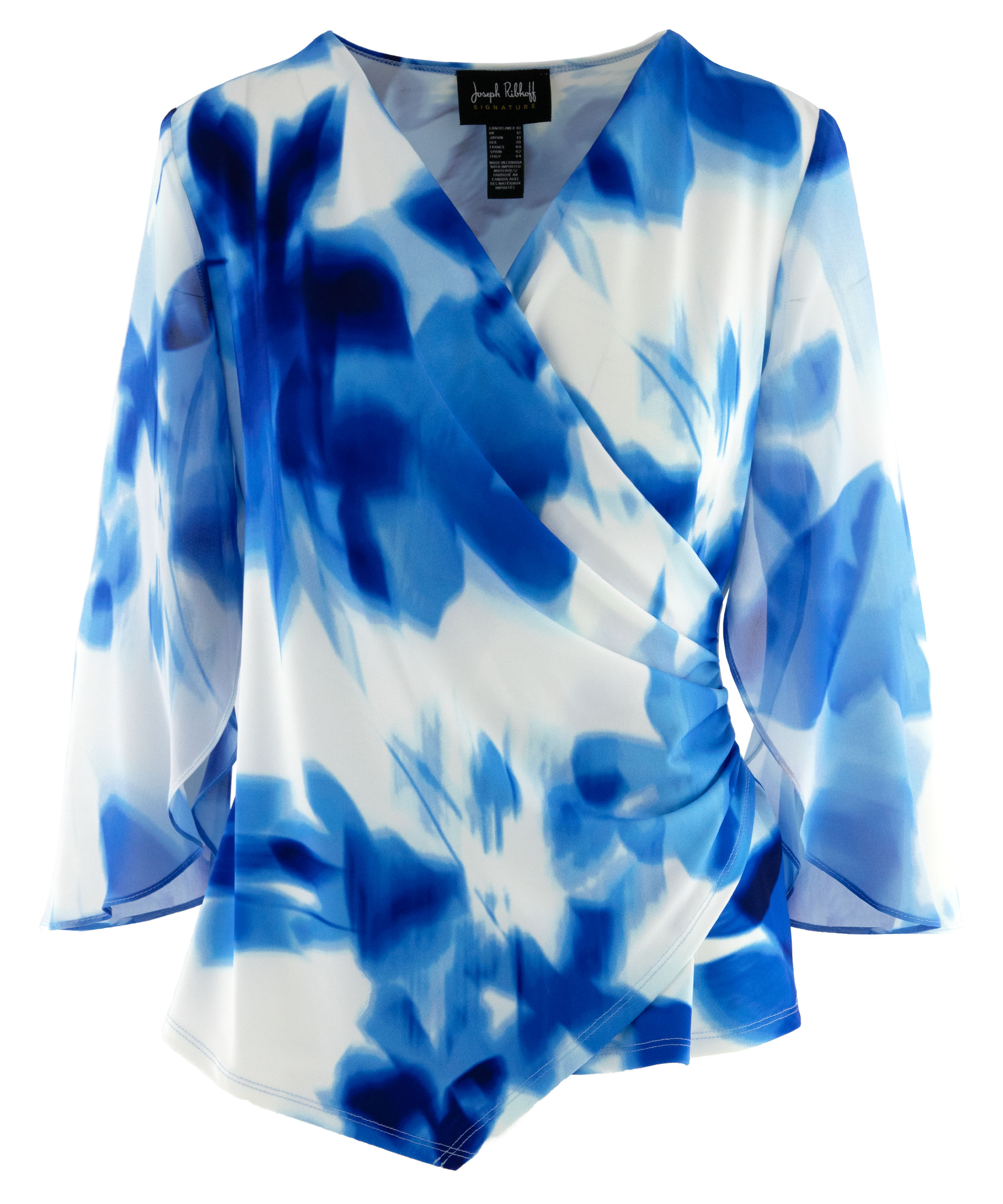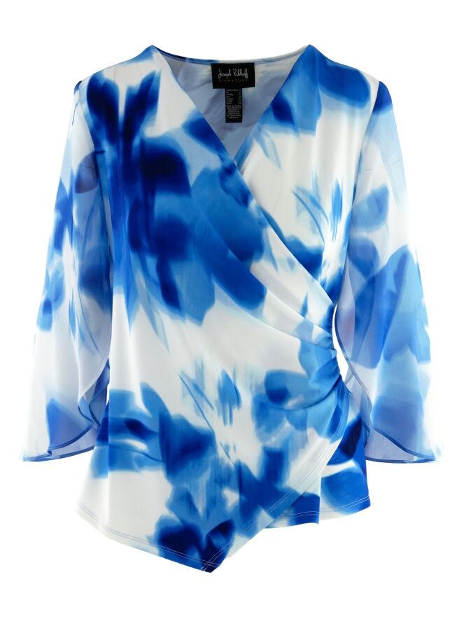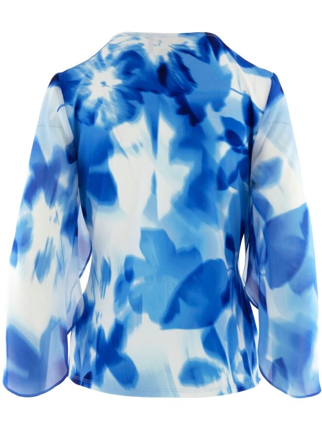 A wrap top from Joseph Ribkoff in a graphic print with various shades of bright blue and white. At the waist, where the wrap is incorporated into the seam, the fabric is finely pleated. The elbow-length sleeves are made from a transparent fabric and feature a slit up to the sleeve insertion. The hem is cut diagonally. This top can be hand-washed.
