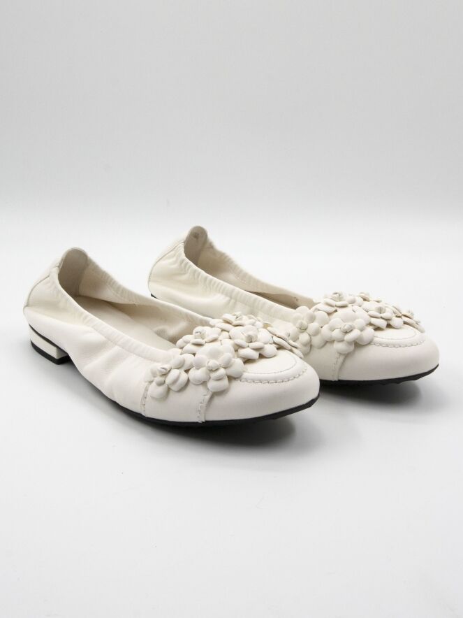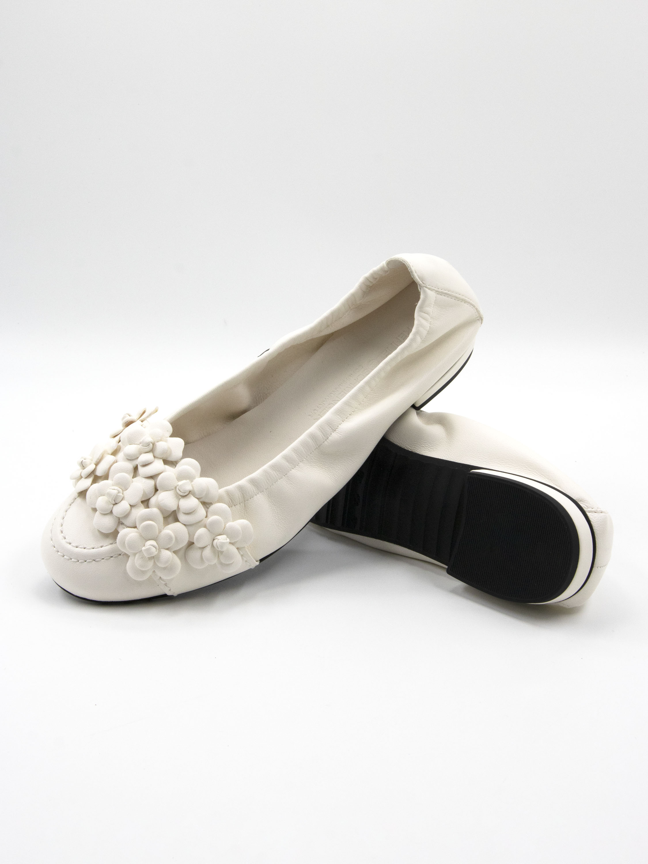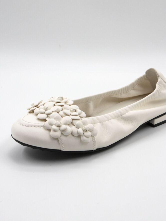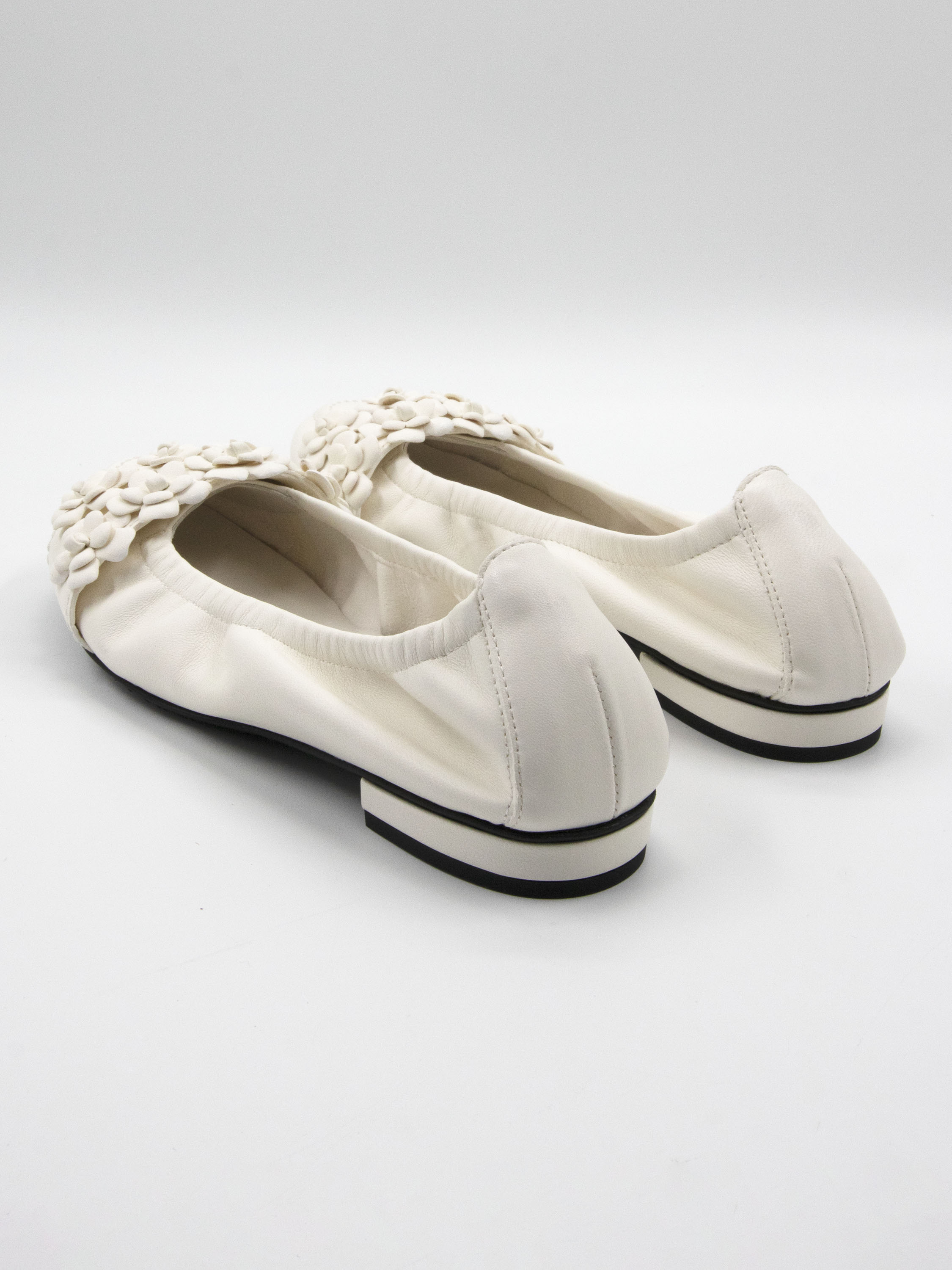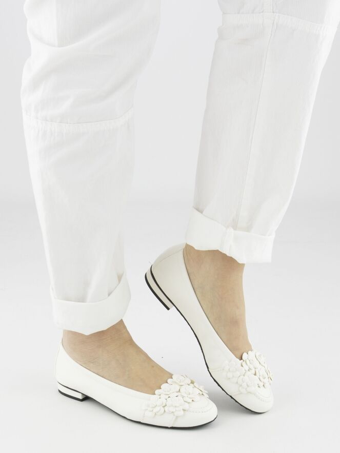 A ballerina flat by Kennel & Schmenger in cream white. A wide strap with decorative floral details runs across the instep. The edge of the heel is finished in cream-white leather. The black outsole has a lightly ribbed texture.