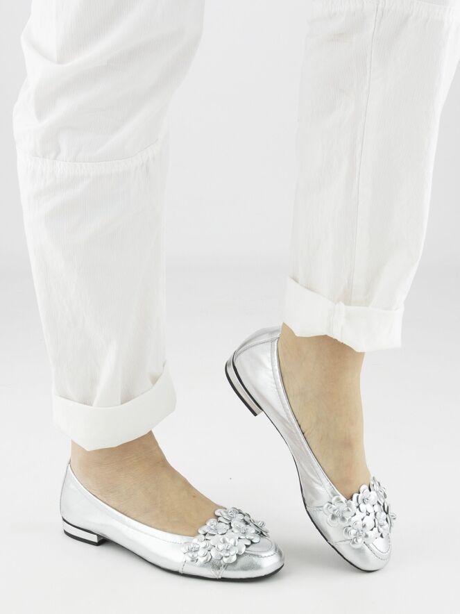 A ballerina flat by Kennel & Schmenger in silver. A wide strap with decorative floral details runs across the instep. The edge of the heel is finished in silver leather. The black sole features a lightly ribbed underside.
