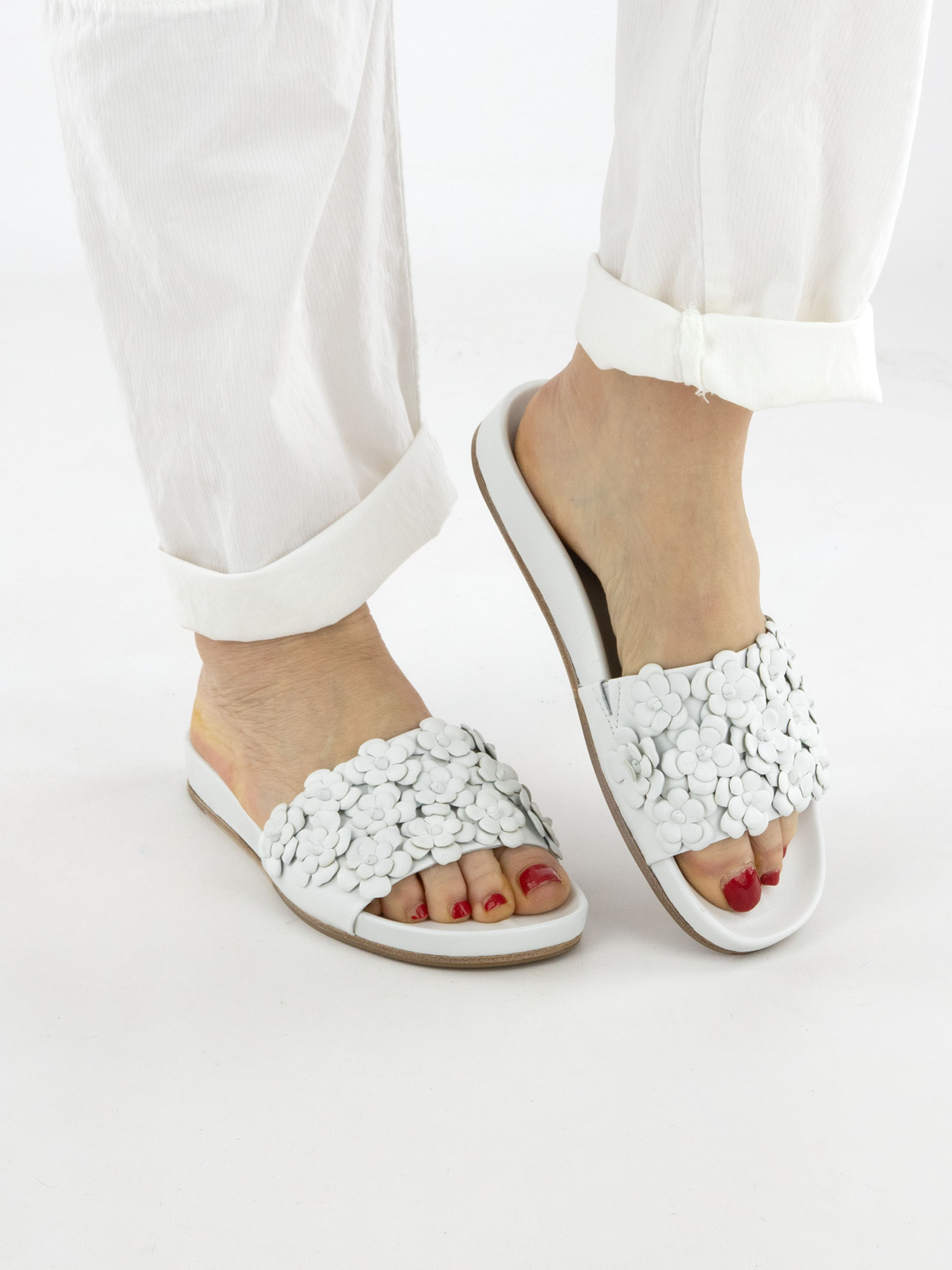 Slipper by Kennel & Schmenger in an elegant off-white shade. A wide strap across the forefoot is delicately adorned with decorative floral appliqués, adding a feminine and summery touch.