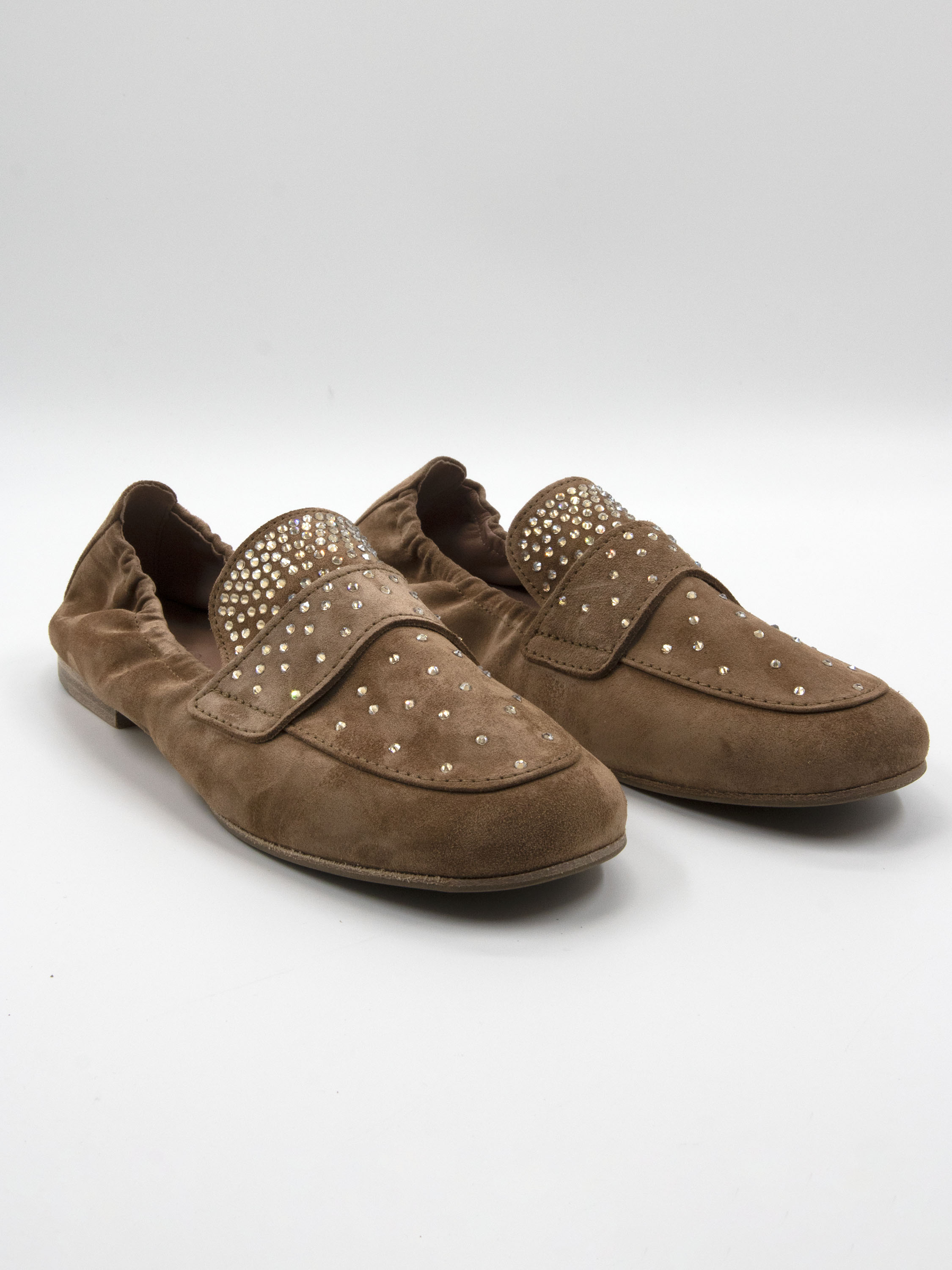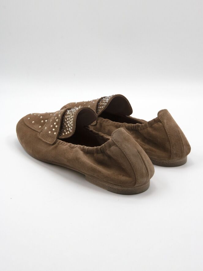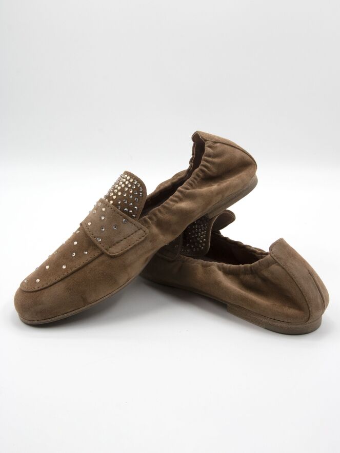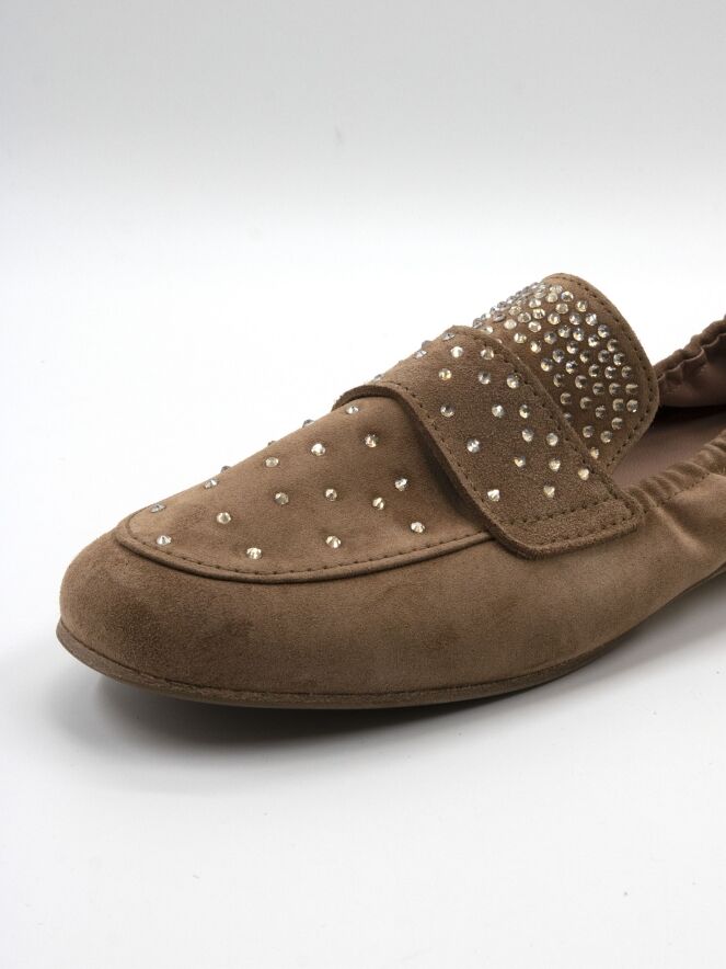 A slip-on shoe by Kennel & Schmenger in a soft brown or taupe shade. The side edges feature elastic inserts with fine pleating. Silver-coloured rhinestones decorate the forefoot. The interior is lined with leather.