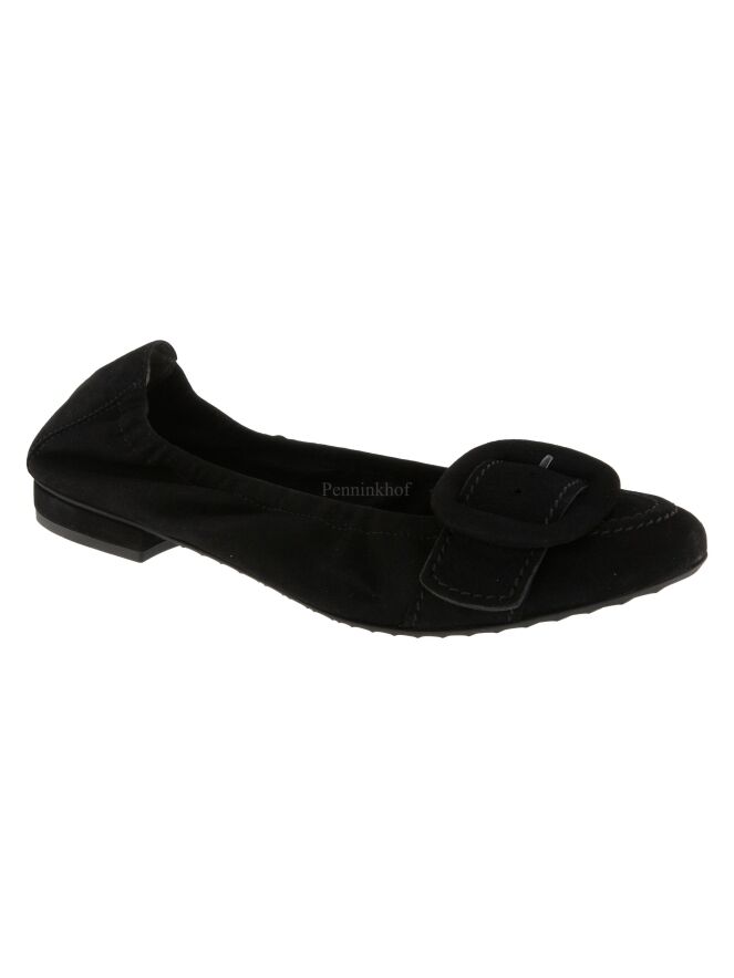 A ballerina from Kennel & Schmenger in the color black. On the forefoot is a large square black buckle. Elastic is incorporated in the edge of the shaft.