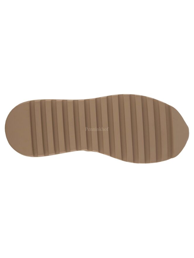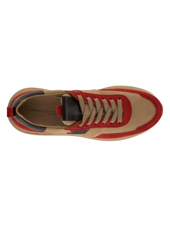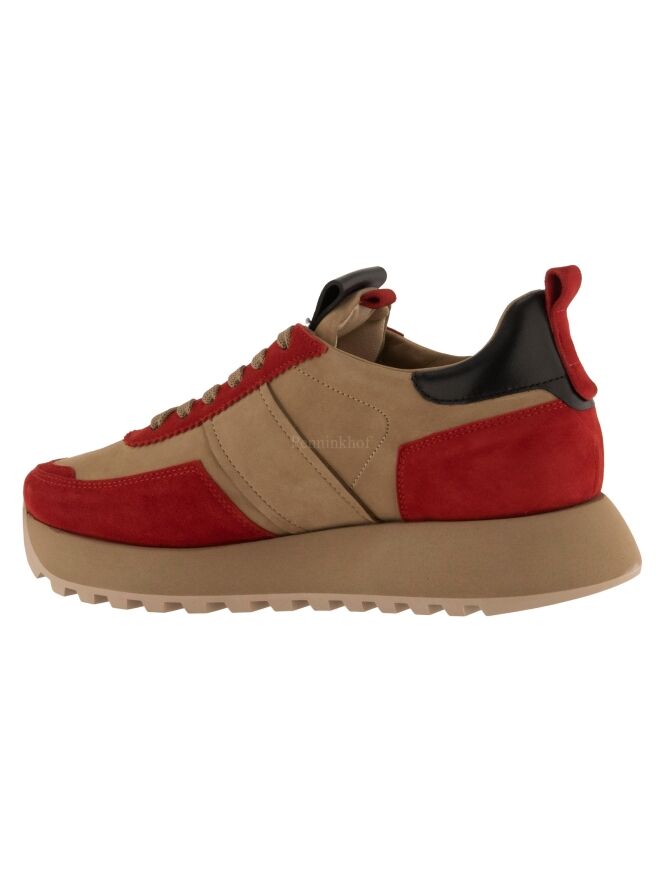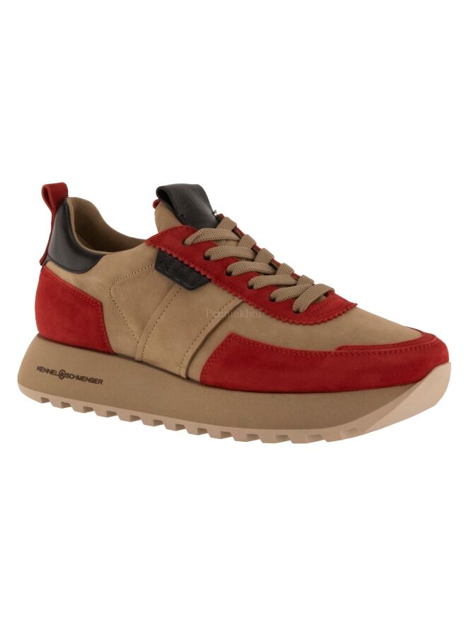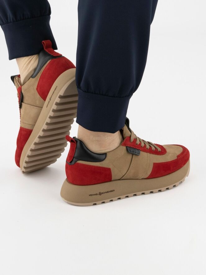 A sneaker from Kennel & Schmenger in red with camel colored camoscio suede. ON the tongue and the heel of the sneaker is a piece of black leather. The sneaker has a serrated camel colored platform sole.