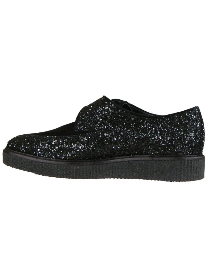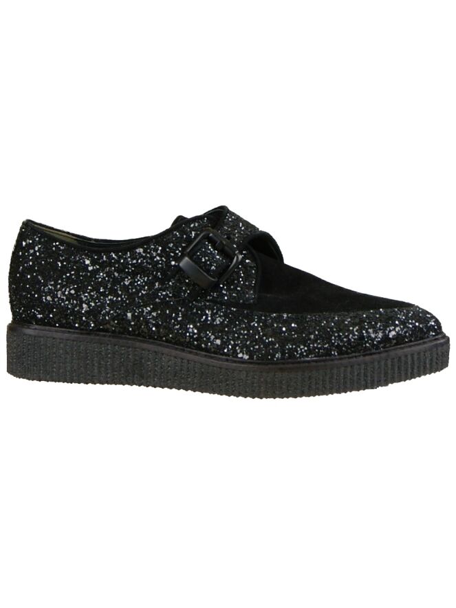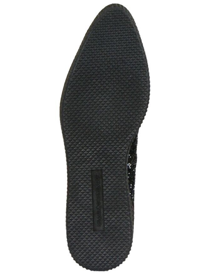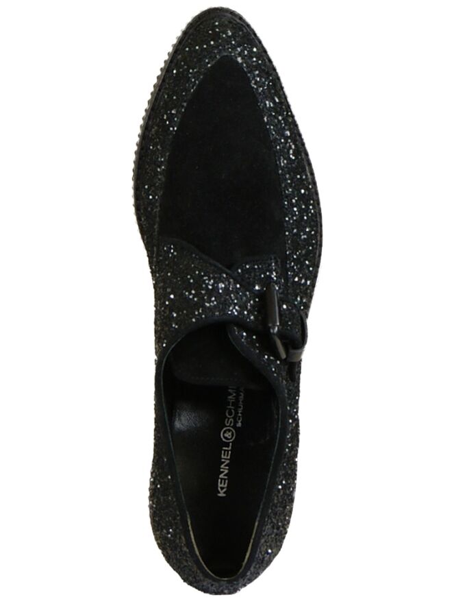 A loafer of the brand K & S Kennel und Schmenger or in black color. The loafer has a pointed toe and Is largely covered with rhinestones. On the forefoot is a buckle in black. The side of the sole is ribbed.