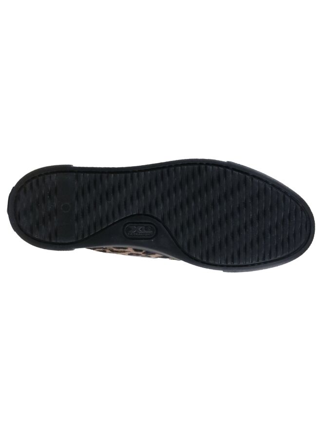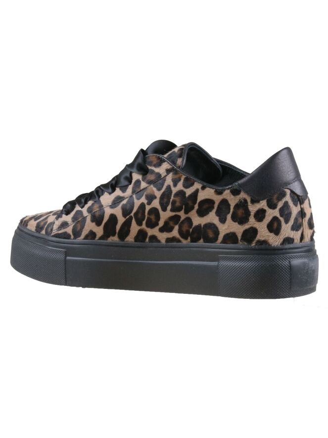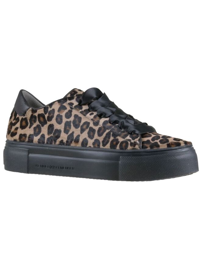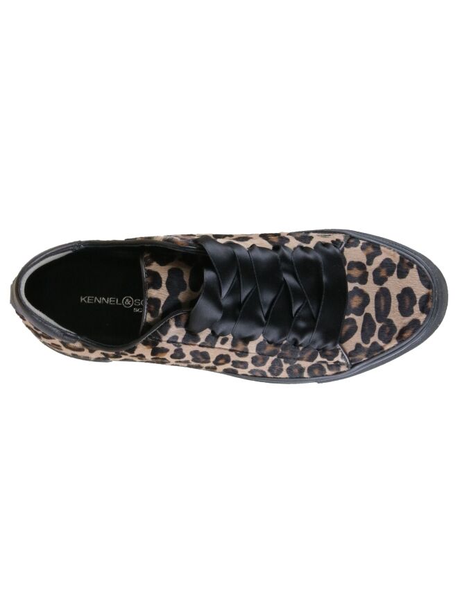 A sneaker from Kennel & Schmenger in a leopard print with the colors camel, brown and black. A decorative black piece of leather is attached to the heel. The platform sole is in the color black just like the matt satin laces. The insole is removable.