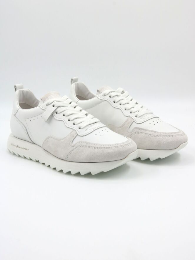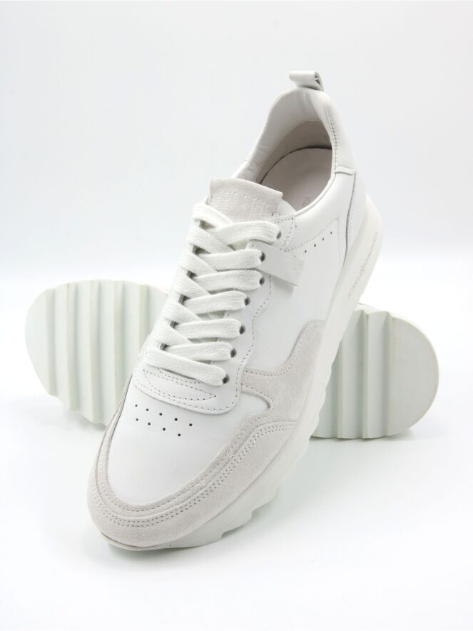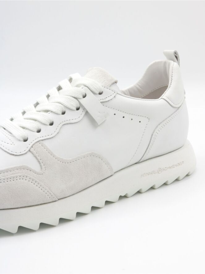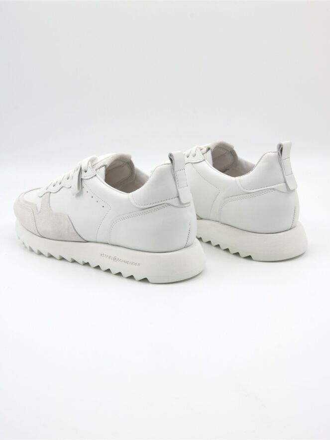 A sneaker from Kennel & Schmenger in white. Along the edge of the forefoot extending to the sides is a wide panel of camoscio suede in a mozzarella shade. This detail is repeated on the heel and the inner shaft lining. The white sole is boldly ridged, and the interior is lined with leather.
