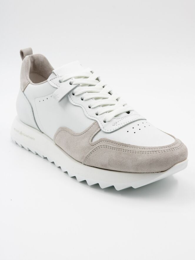 A sneaker from Kennel & Schmenger in white color. Along the edge from the forefoot towards the sides, there's a wide part in a light gray camoscio suede, which extends to the heel and along the inner edge of the shaft. The white sole is heavily serrated, and the inside is lined with leather.