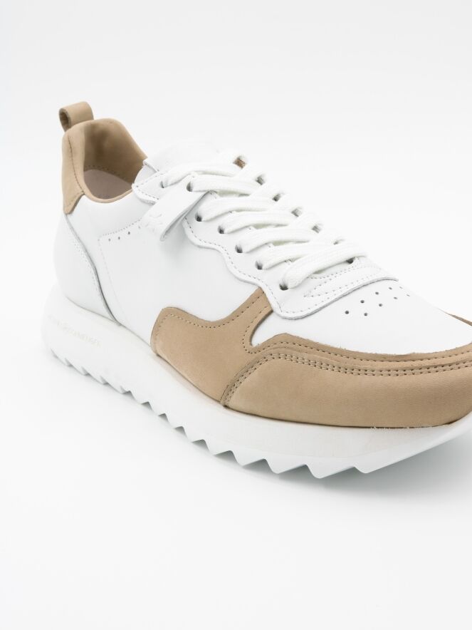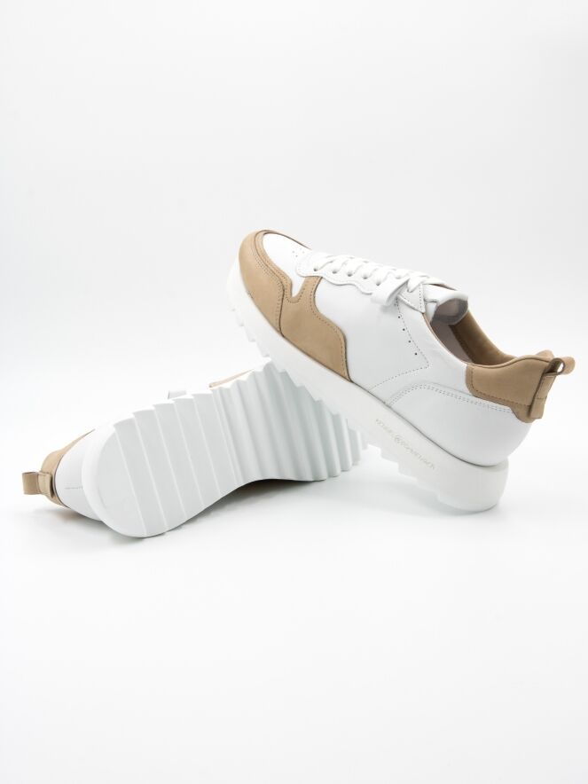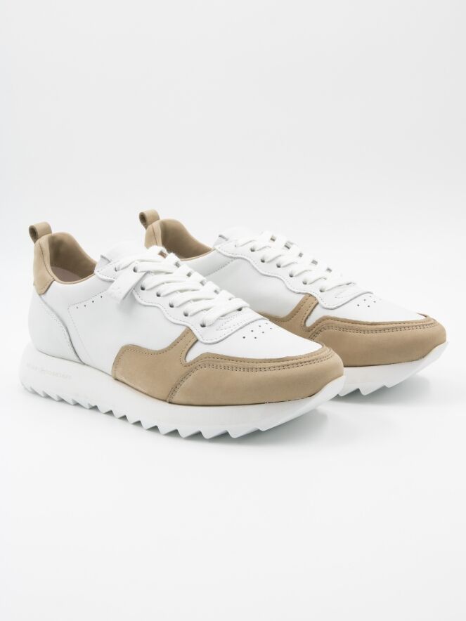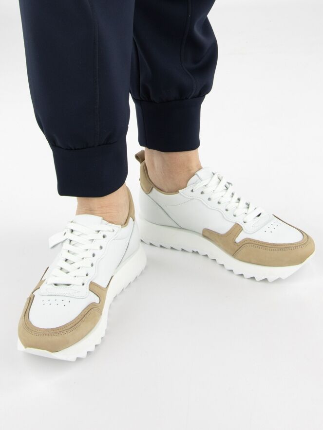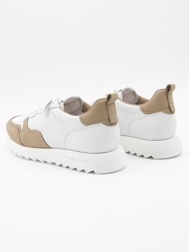 A sneaker from Kennel & Schmenger in white color. Along the edge from the forefoot towards the sides, there's a wide part in a sand-colored camoscio suede, which extends to the heel and along the inner edge of the shaft. The white sole is heavily serrated, and the inside is lined with leather.